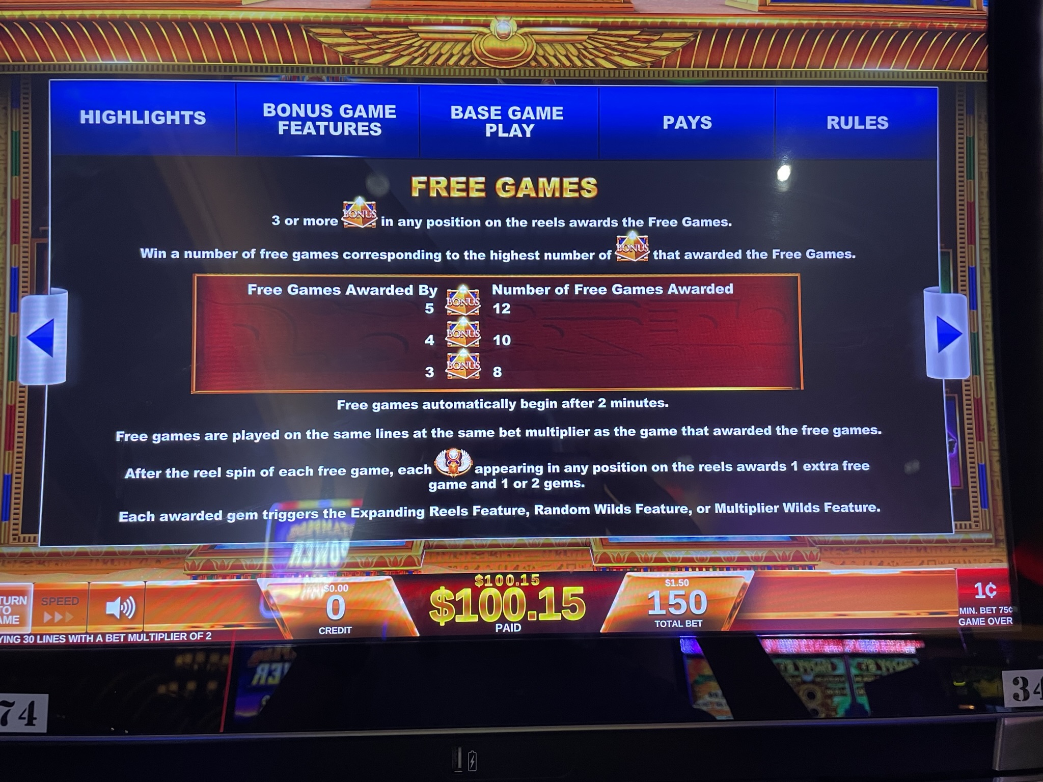 - तीन लाल रत्नों को विस्तारित रीलों के साथ एक मुफ़्त स्पिन मिलता है। रीलों का विस्तार छह पंक्तियों में होगा और उनमें सामान्य 30 की बजाय 75 पेलाइन होंगी।