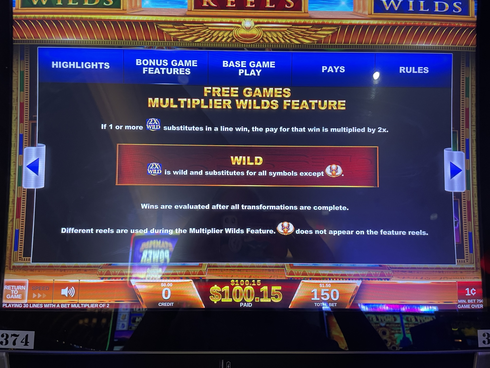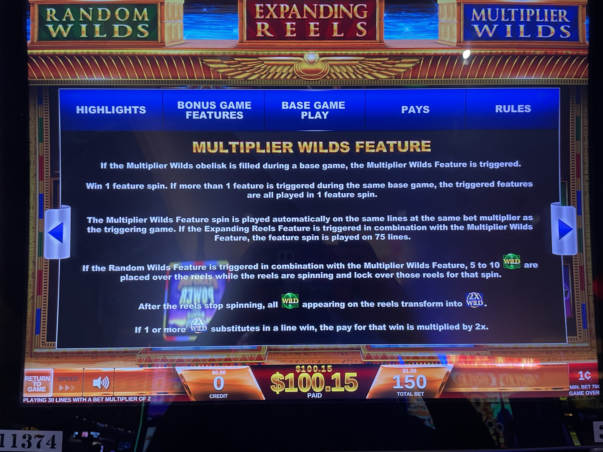 नीले ओबिलिस्क के तीनों टुकड़े पाने पर खिलाड़ी को एक मल्टीप्लायर वाइल्ड्स फ़ीचर स्पिन मिलेगा। उस फ़ीचर स्पिन में, सभी वाइल्ड 2x वाइल्ड में बदल जाते हैं। किसी भी वाइल्ड से जुड़ी जीत, जो संभवतः ज़्यादातर वाइल्ड होगी, दोगुनी हो जाएगी। याद रखें, दो या उससे ज़्यादा 2x वाइल्ड से गुज़रने पर भी जीत दोगुनी ही होगी।