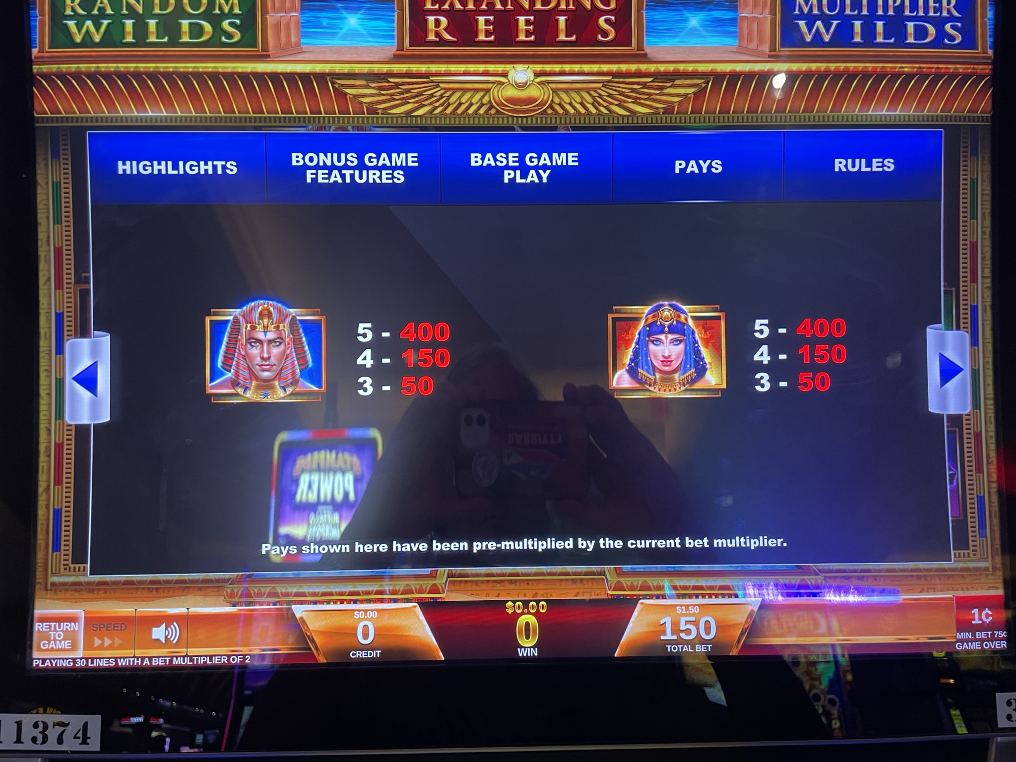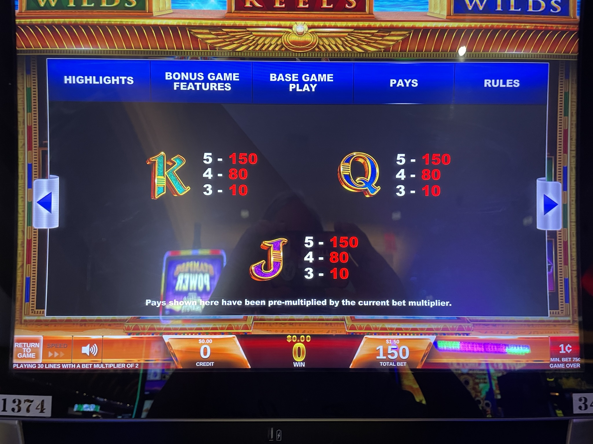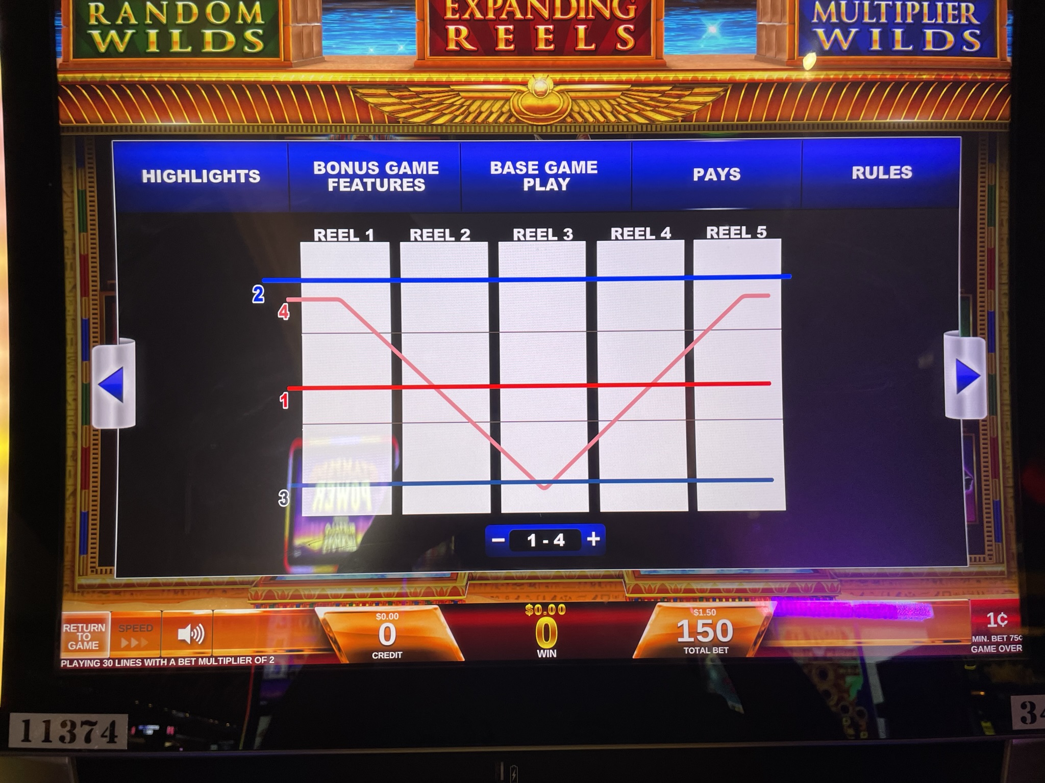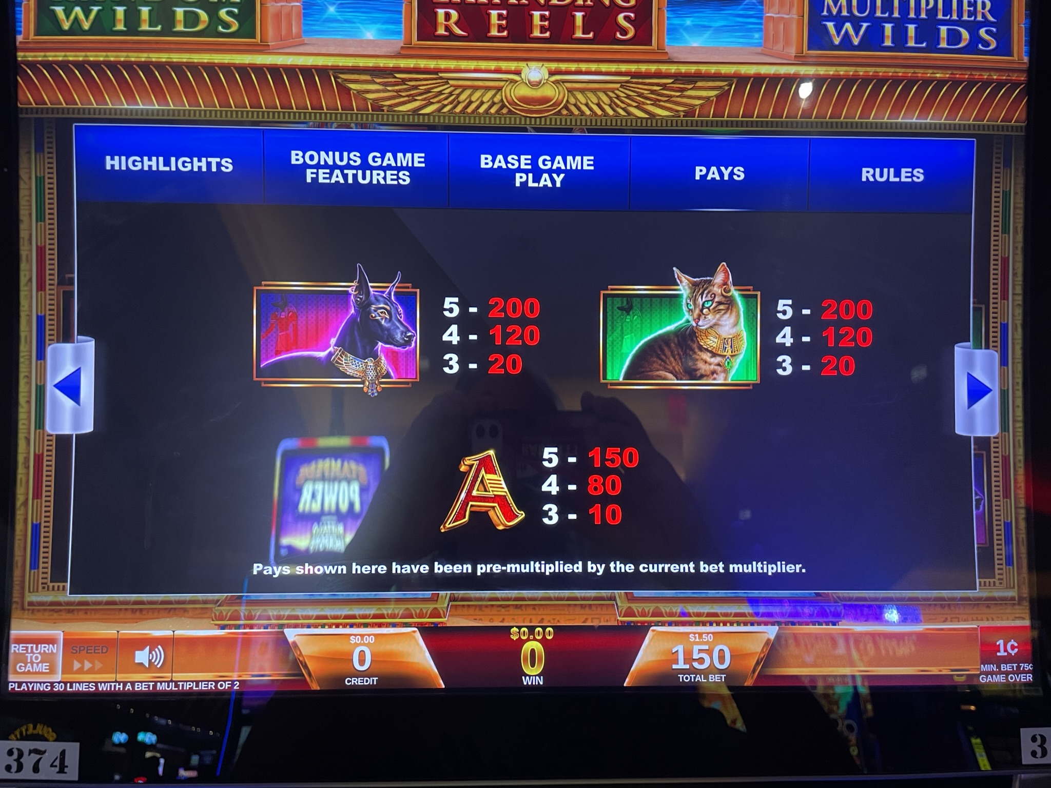 - एक दांव की कीमत 75, 150, 225, 375, या 600 क्रेडिट होती है। मैंने जितने भी खेल देखे हैं, उनमें एक क्रेडिट का मूल्य $0.01 होता है। इस प्रकार, दांव की राशि $0.75, $1.50, $2.25, $3.75, या $6.00 हो सकती है। खेल सभी दांव स्तरों पर एक जैसा ही होता है। जीत दांव की राशि के अनुपात में होती है। उदाहरण के लिए, यदि कोई खिलाड़ी $6.00 का दांव लगाता है, तो उसे उसी जीत के लिए $0.75 का दांव लगाने वाले खिलाड़ी की तुलना में 8 गुना अधिक भुगतान किया जाएगा।