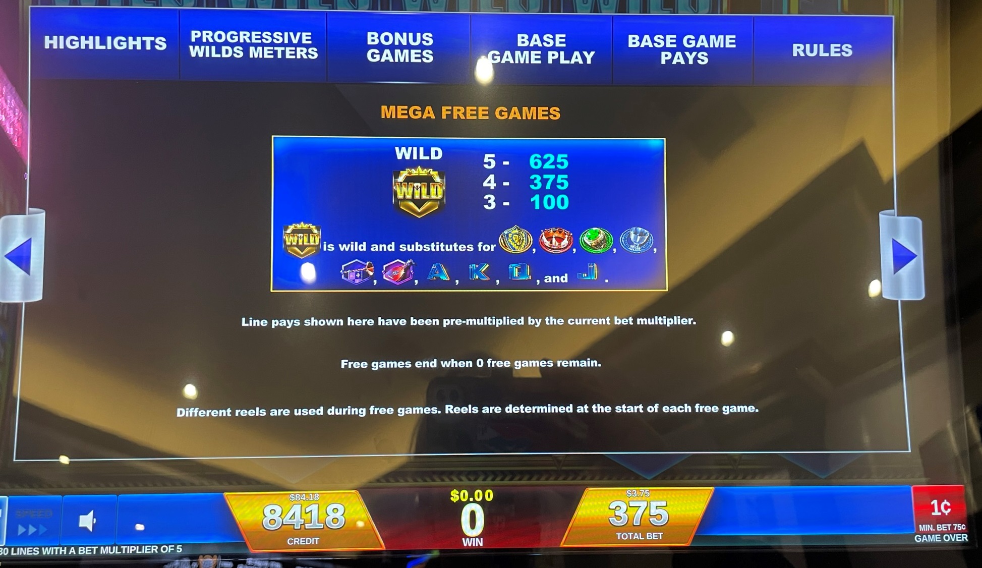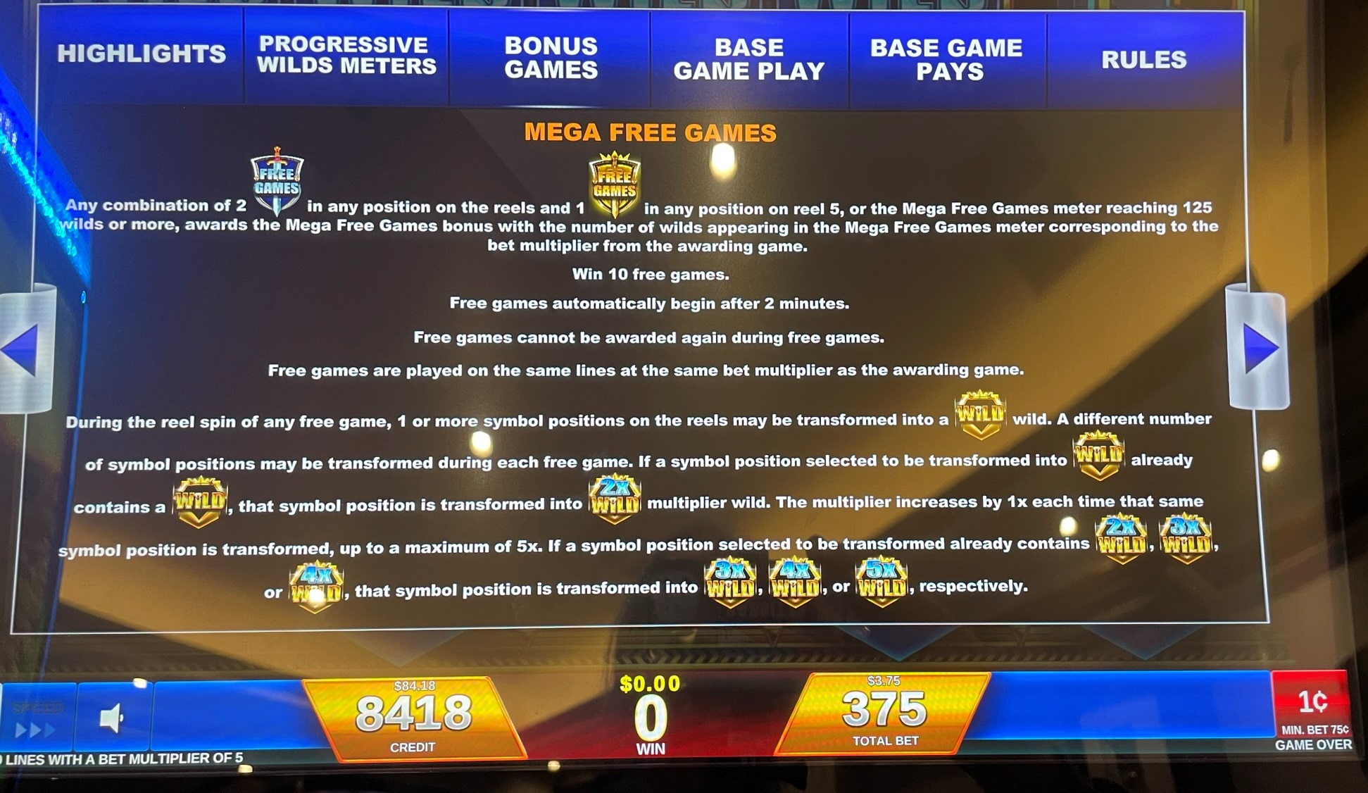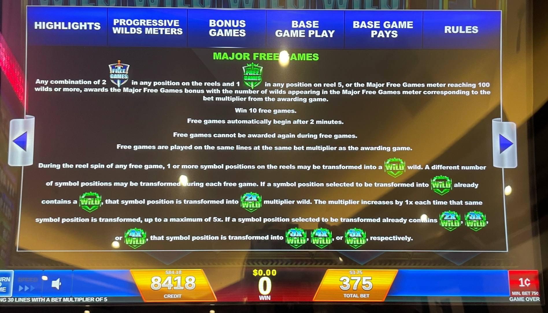 - "फ्री गेम्स" प्रतीक रीलों 1 से 5 तक दिखाई देते हैं। अगर खिलाड़ी को रीलों 1 से 4 के बीच दो और रील 5 पर एक और मिलता है, तो वह बोनस गेम खेलेगा। नियम स्क्रीन में यह नहीं बताया गया है कि अगर खिलाड़ी को पहली चार रीलों में तीन या चार वाइल्ड मिलते हैं तो क्या होगा। हो सकता है कि गेम में कोई गड़बड़ी हो जिससे यह नामुमकिन हो।
