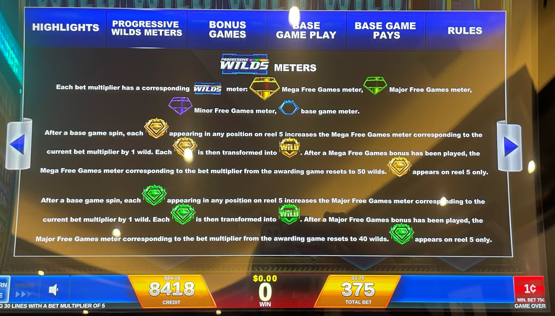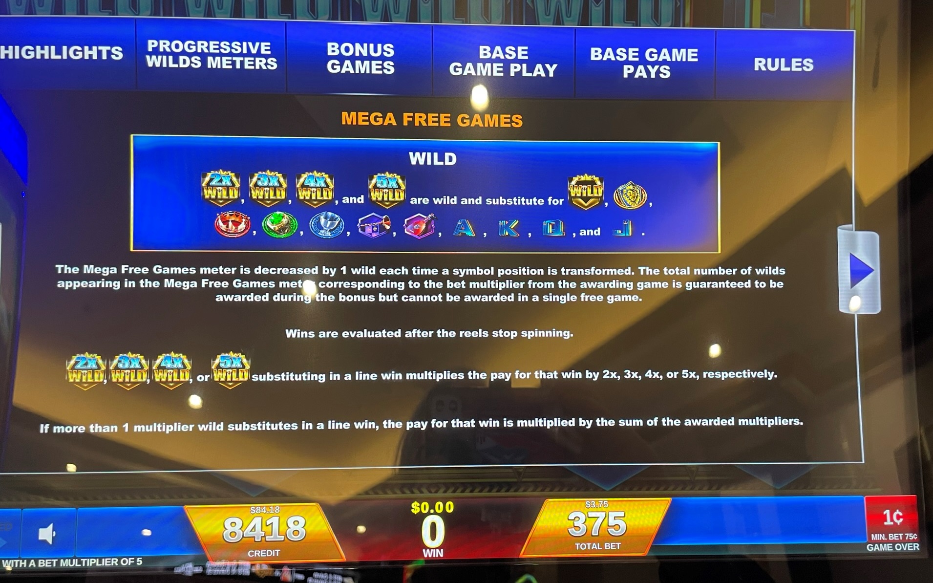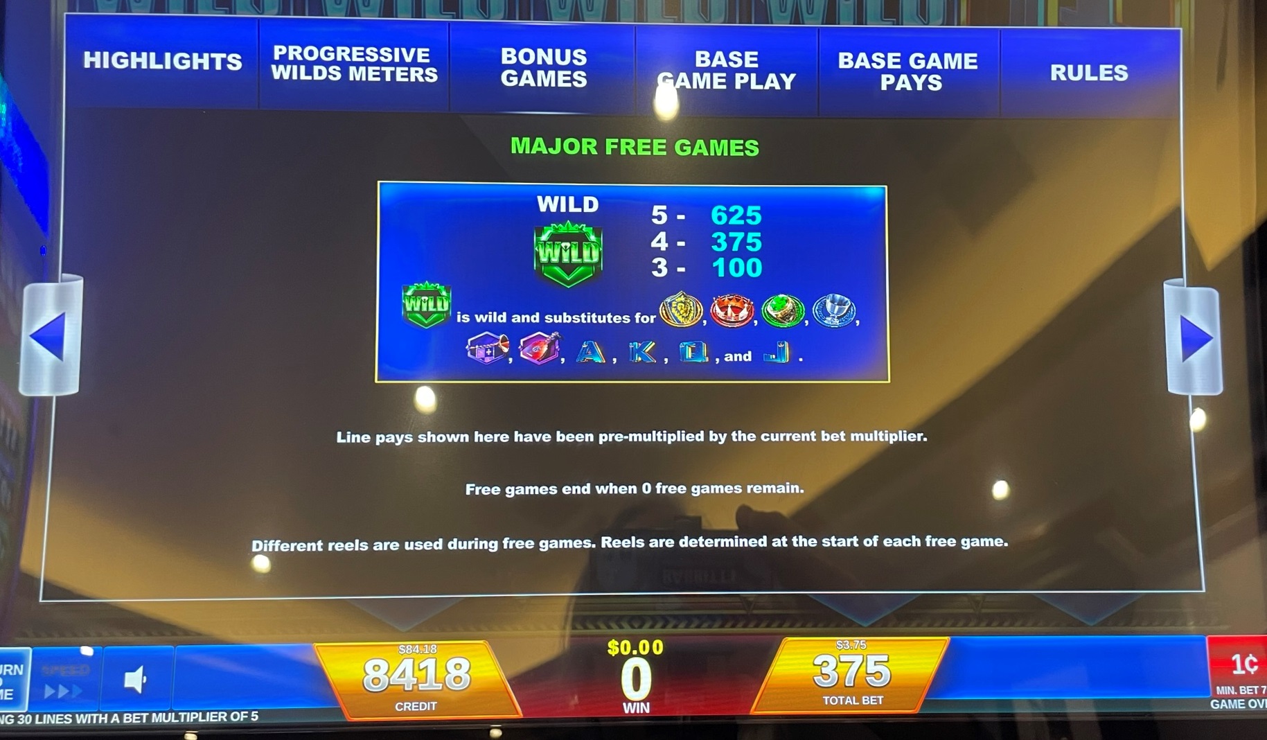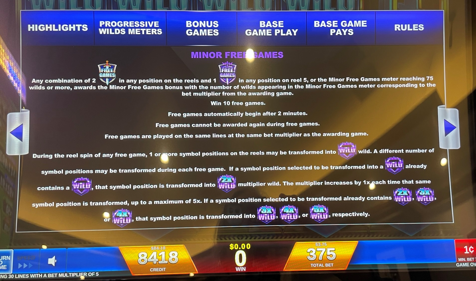- "फ्री गेम्स" प्रतीक रीलों 1 से 5 तक दिखाई देते हैं। अगर खिलाड़ी को रीलों 1 से 4 के बीच दो और रील 5 पर एक और मिलता है, तो वह बोनस गेम खेलेगा। नियम स्क्रीन में यह नहीं बताया गया है कि अगर खिलाड़ी को पहली चार रीलों में तीन या चार वाइल्ड मिलते हैं तो क्या होगा। हो सकता है कि गेम में कोई गड़बड़ी हो जिससे यह नामुमकिन हो।