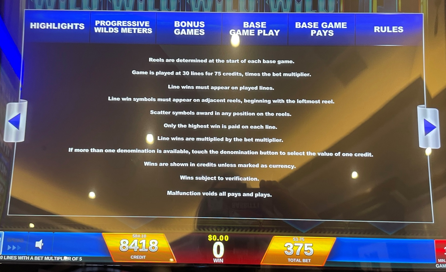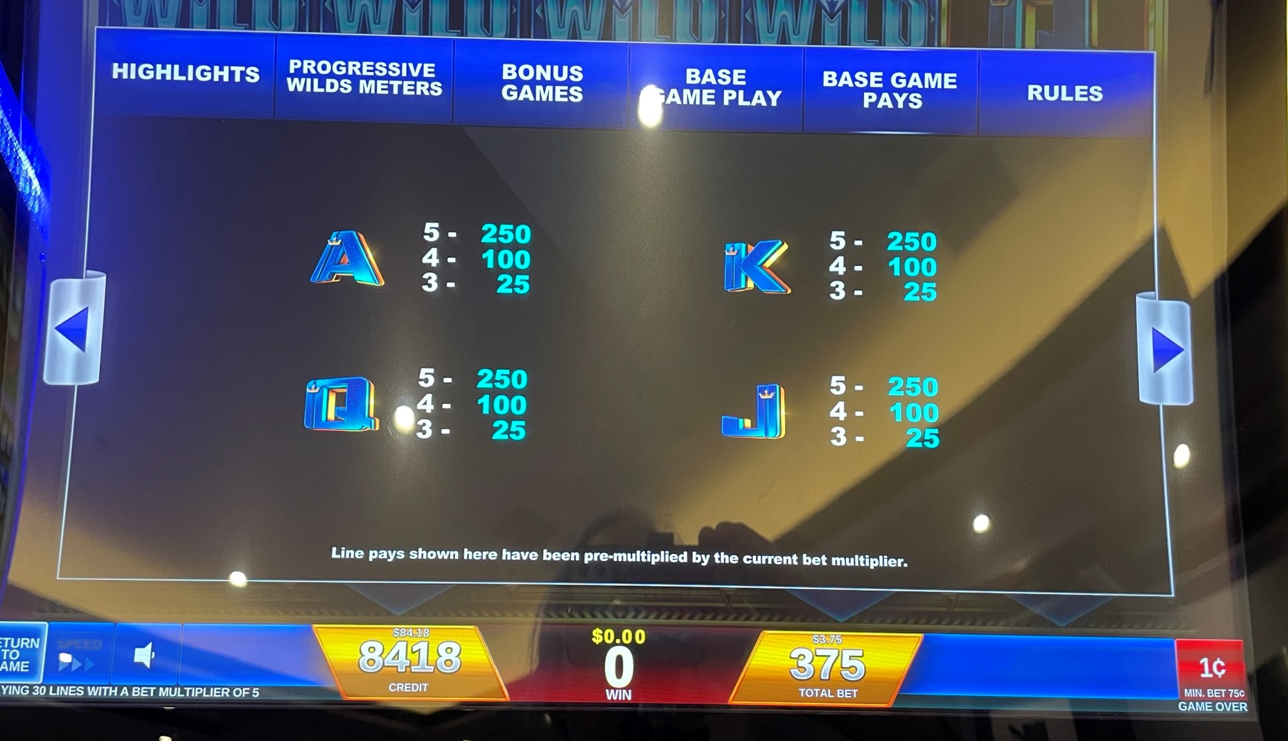 - यदि कोई भी लाइन पे जीत कम से कम एक वाइल्ड से होकर गुजरती है, तो जीत को उस जीत को बनाने वाले कुल वाइल्ड से गुणा किया जाएगा।