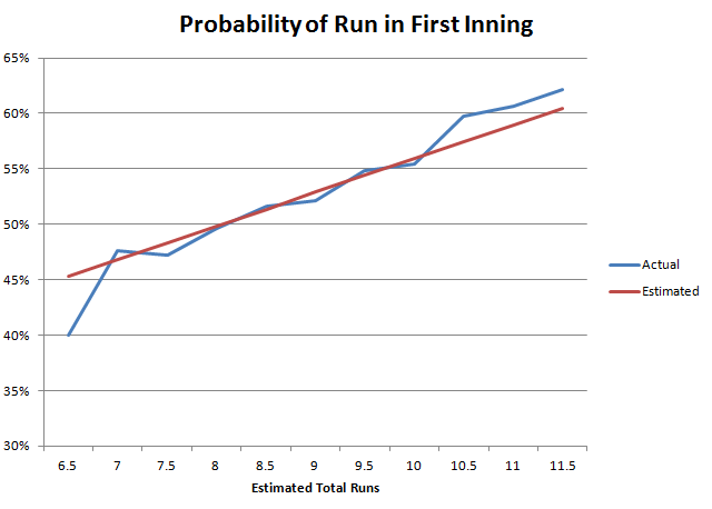 बेसबॉल में एक लोकप्रिय शर्त यह होती है कि पहली पारी में रन बनेगा या नहीं। यह बिल्कुल स्पष्ट है कि पहली पारी में रन बनने की संभावना अनुमानित कुल योग से काफ़ी हद तक सहसंबद्ध होगी। नीचे दी गई तालिका कुल योग के अनुसार, पहली पारी में रन बनाने वाले खेलों की संख्या दर्शाती है। RSFI शीर्षक वाला दूसरा कॉलम "पहली पारी में बनाए गए रन" को दर्शाता है। यह तालिका 2001 से 2011 के सीज़न पर आधारित है। नीचे दाएँ खाने में पहली पारी में कम से कम एक रन बनने की कुल संभावना 52.5% दिखाई गई है।