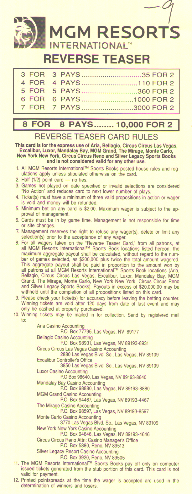 9-पॉइंट प्लीज़र कार्ड केवल MGM स्पोर्ट्स बुक पर उपलब्ध है। सभी पॉइंट स्प्रेड 1/2 पर समाप्त होते हैं, इसलिए कोई टाई नहीं हो सकता। नीचे दी गई तालिका जीत (एक के लिए) के आधार पर, जीतने की संभावना और 3 से 8 पिक्स के लिए अपेक्षित रिटर्न दर्शाती है, यह मानते हुए कि एक यादृच्छिक पिकर चुना गया है। प्रत्येक लेग की जीत की संभावना 24.17% है। दाएँ कॉलम में हाउस एज 75% से 94% तक दिखाया गया है।