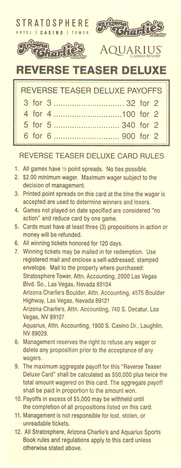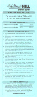 प्लीजर दांव स्पष्ट रूप से बहुत लोकप्रिय नहीं हैं, जैसा कि इस तथ्य से स्पष्ट है कि केवल तीन वेगास स्पोर्ट्स बुक परिवार प्लीजर कार्ड प्रदान करते हैं, जो इस प्रकार हैं: