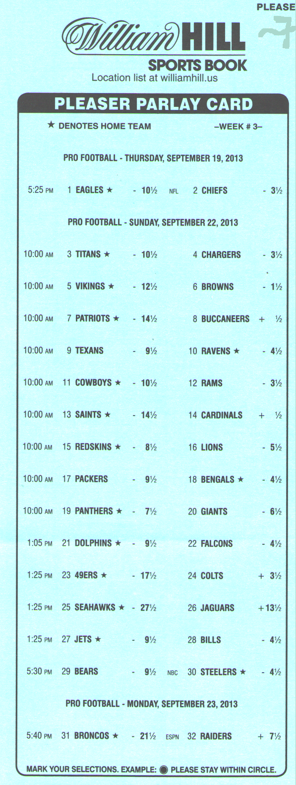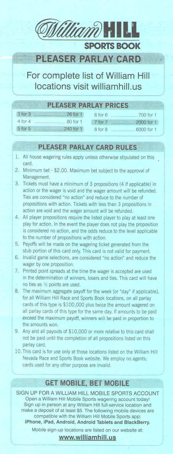 7-पॉइंट प्लीज़र कार्ड केवल विलियम हिल स्पोर्ट बुक्स और एलियांटे पर उपलब्ध है। सभी पॉइंट स्प्रेड 1/2 पर समाप्त होते हैं, इसलिए कोई टाई नहीं हो सकता। नीचे दी गई तालिका में जीत (एक के लिए) के आधार पर, जीतने की संभावना और 3 से 8 पिक्स के लिए अपेक्षित रिटर्न दिखाया गया है, यह मानते हुए कि एक यादृच्छिक पिकर चुना गया है। प्रत्येक लेग की जीत की संभावना 28.65% है।