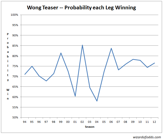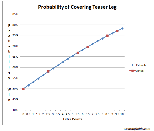 इस पृष्ठ का विश्लेषण 1994 से 2012 सीज़न के बीच हुए 4450 NFL खेलों पर आधारित है। मैंने 1994 से शुरुआत की क्योंकि उसी साल दो-बिंदु रूपांतरण नियम लागू किया गया था। नमूने के आकार में बदलाव के अलावा, मुझे यह भी अनुमान लगाना था कि टीज़र कार्ड पर पॉइंट स्प्रेड कैसे बनाए जाते हैं। समय बचाने के लिए, मैंने सभी 12 ज्ञात प्रकार के पार्ले कार्डों का विश्लेषण करने के बजाय, पाँच प्रकारों का विश्लेषण किया। यह समझने के लिए कि अतिरिक्त अंक जीतने की संभावना को कैसे प्रभावित करते हैं, मैंने अपना विज़ार्ड टीज़र समीकरण बनाया।