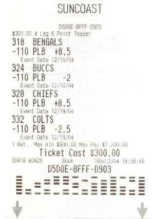 नीचे दी गई तालिका दिखाती है कि 6-पॉइंट OTB टीज़र बेट्स, पिक्स की संख्या और स्पोर्ट्स बुक ग्रुप के अनुसार कितना भुगतान करते हैं। इस तालिका में जीत "एक से" के आधार पर होती है। दूसरे शब्दों में, अगर बेट जीत जाती है, तो मूल दांव वापस कर दिया जाता है।