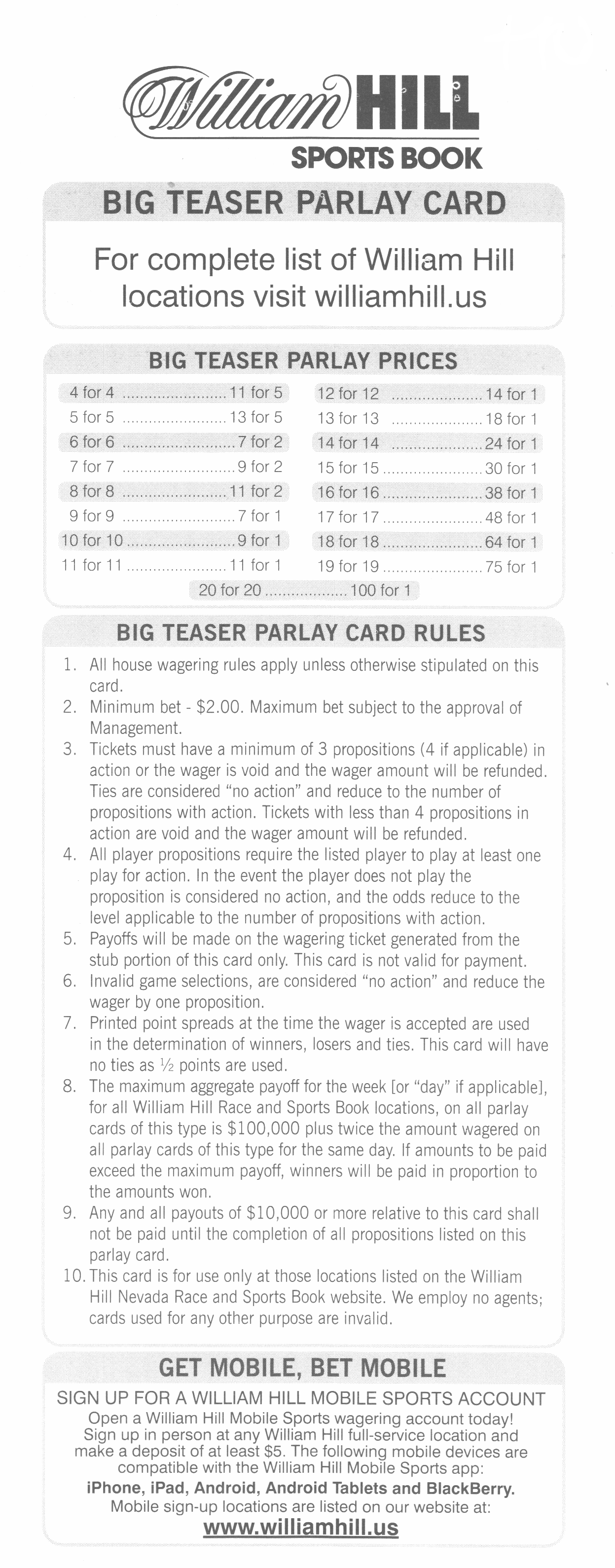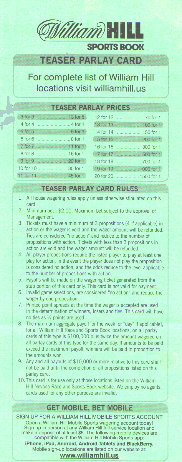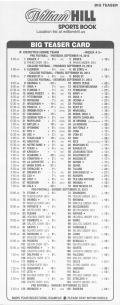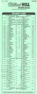 केवल विलियम हिल ही 10-पॉइंट टीज़र प्रदान करता है। विज़ार्ड टीज़र समीकरण के अनुसार, रैंडम पिकर 78.25% पिक्स जीतने की उम्मीद कर सकता है। नीचे दी गई तालिका रैंडम पिकर के लिए विलियम हिल ऑड्स के विरुद्ध जीतने की संभावना और अपेक्षित रिटर्न दर्शाती है। हाउस एज 18% से 29% तक भिन्न होता है।