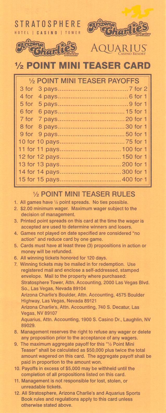 | साउथ पॉइंट | 10 से 13 | 7 से 5 | 12 से 5 | 4 से 1 | 6 से 1 | 8 से 1 | 10 से 1 | ||