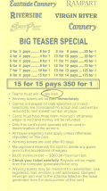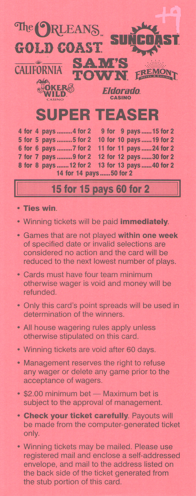नीचे दी गई तालिका दिखाती है कि 6-पॉइंट OTB टीज़र बेट्स, पिक्स की संख्या और स्पोर्ट्स बुक ग्रुप के अनुसार कितना भुगतान करते हैं। इस तालिका में जीत "एक से" के आधार पर होती है। दूसरे शब्दों में, अगर बेट जीत जाती है, तो मूल दांव वापस कर दिया जाता है।