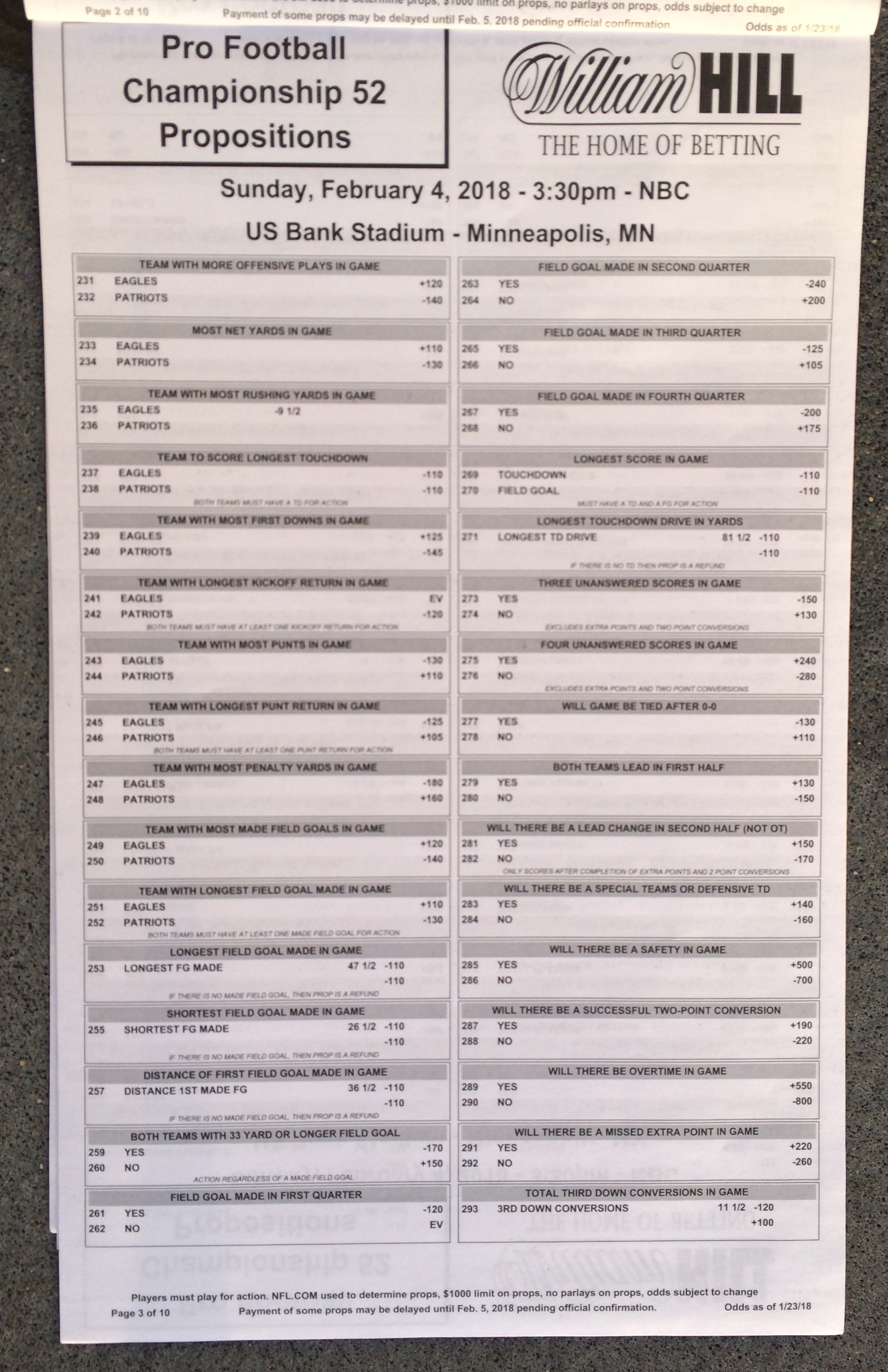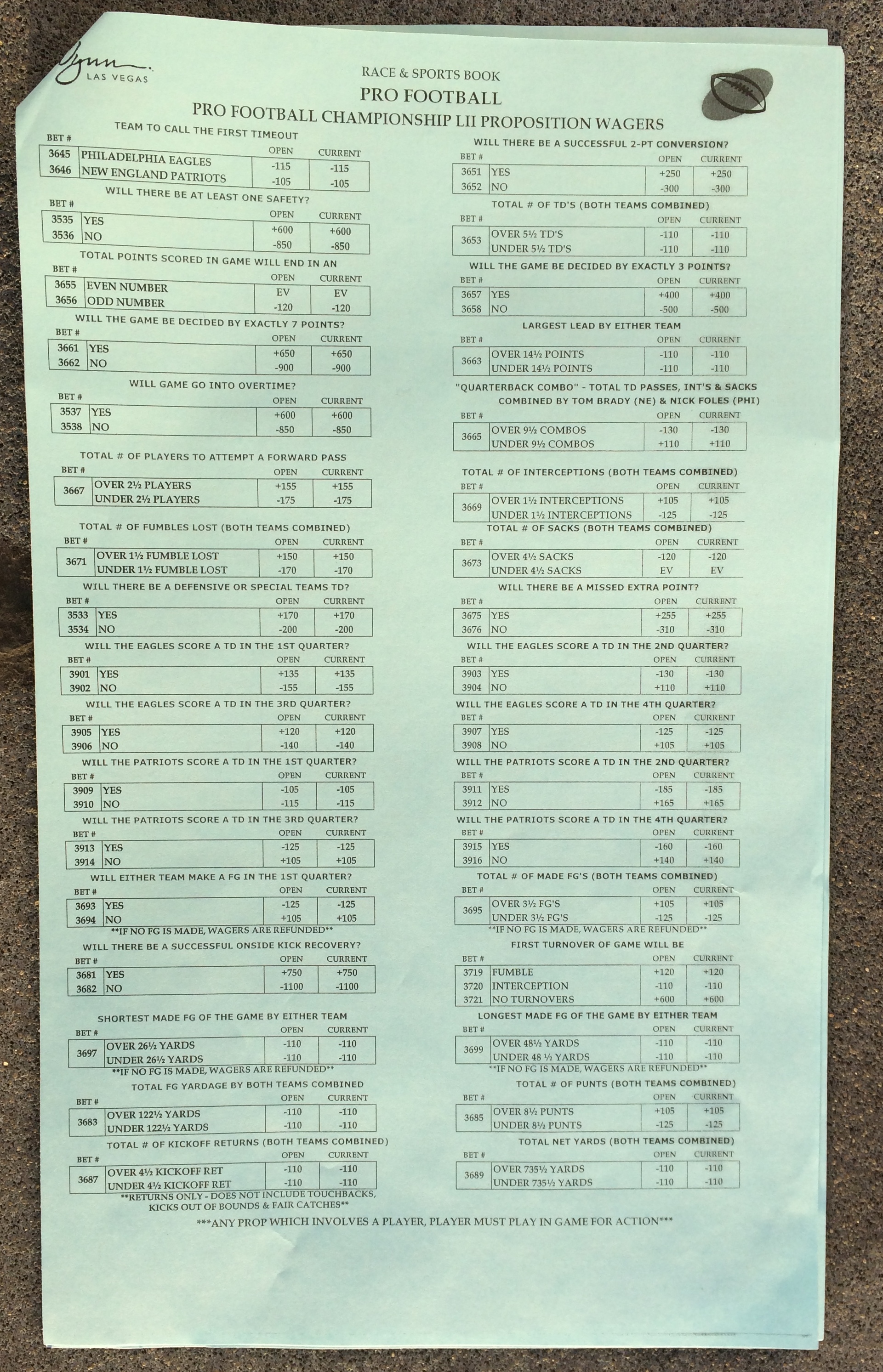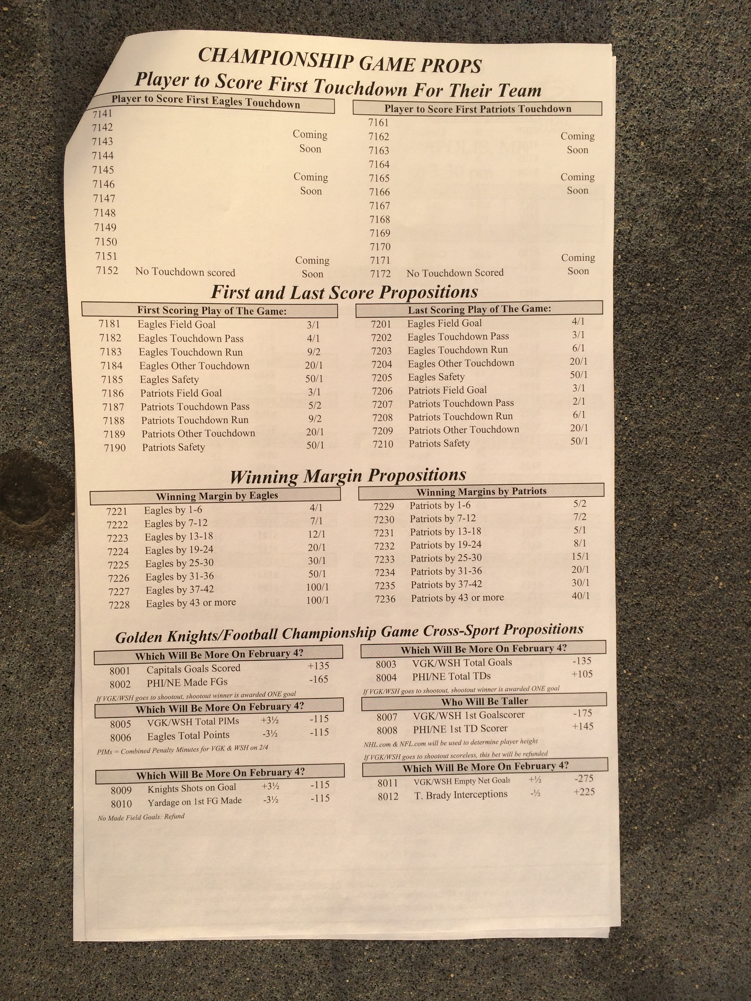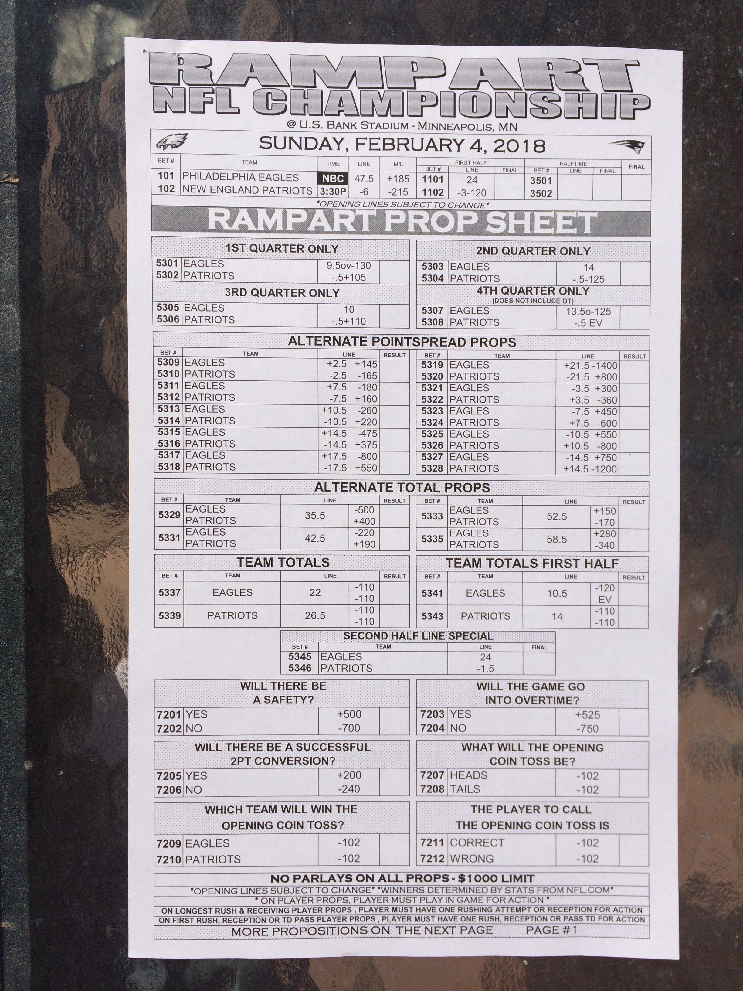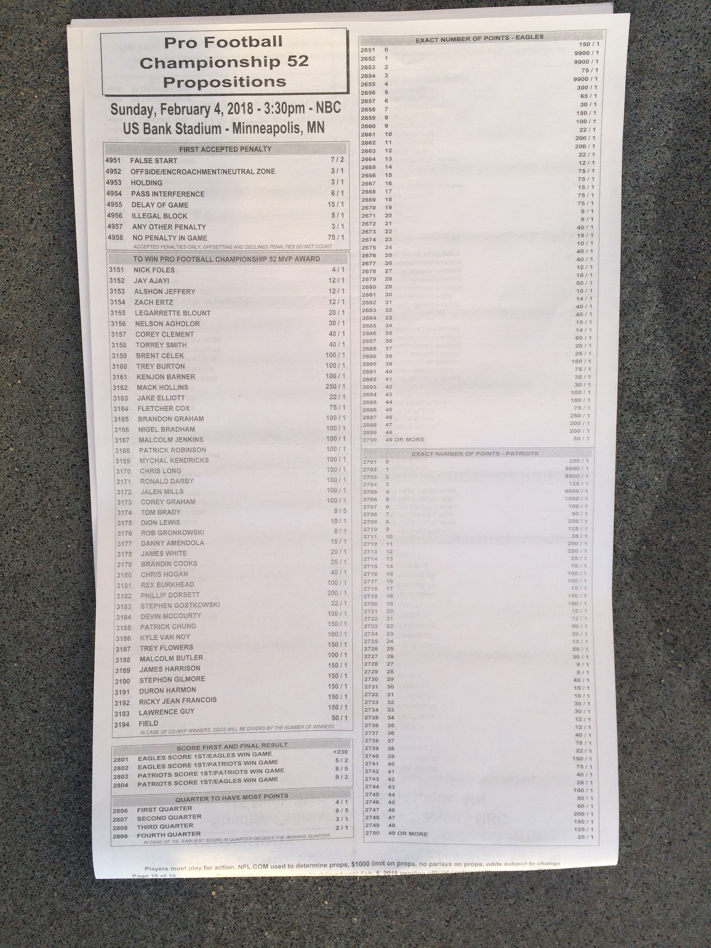 लास वेगास के कई खेल बुक फ़ैमिली में प्रस्तावित दांवों के हर पृष्ठ की तस्वीरें नीचे दी गई हैं। ये शीट्स 27 जनवरी, 2018 को, खेल से आठ दिन पहले, एकत्र की गई थीं।