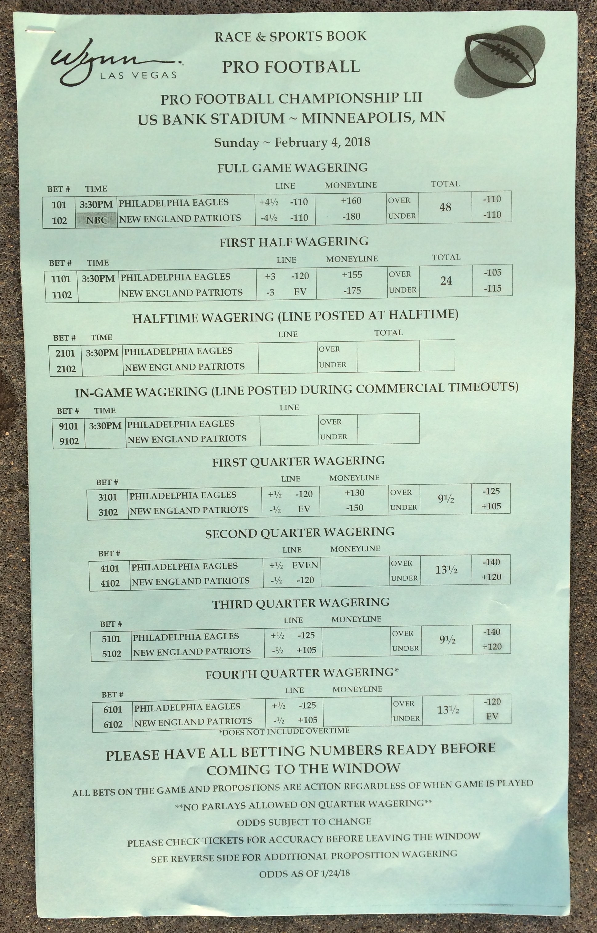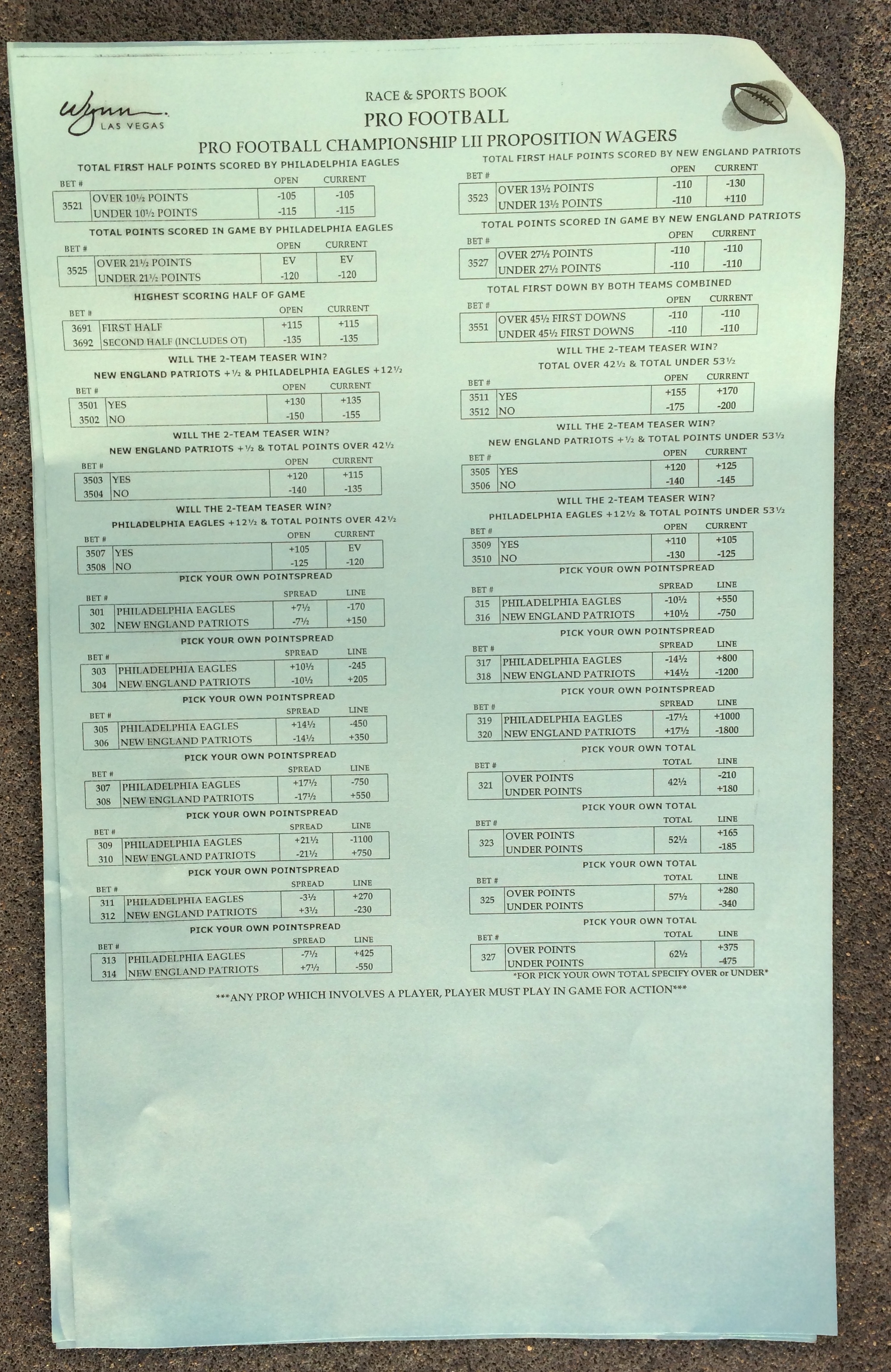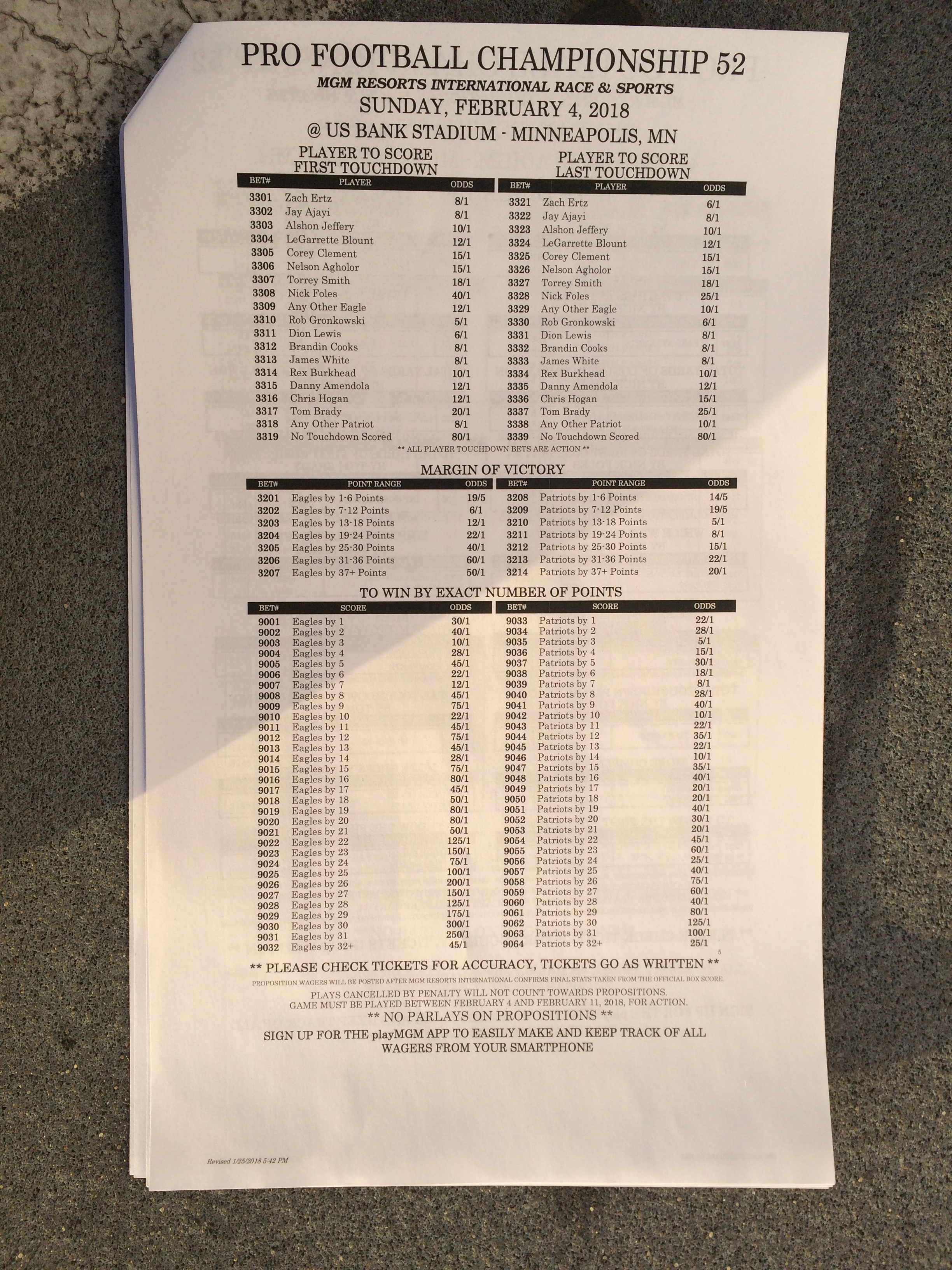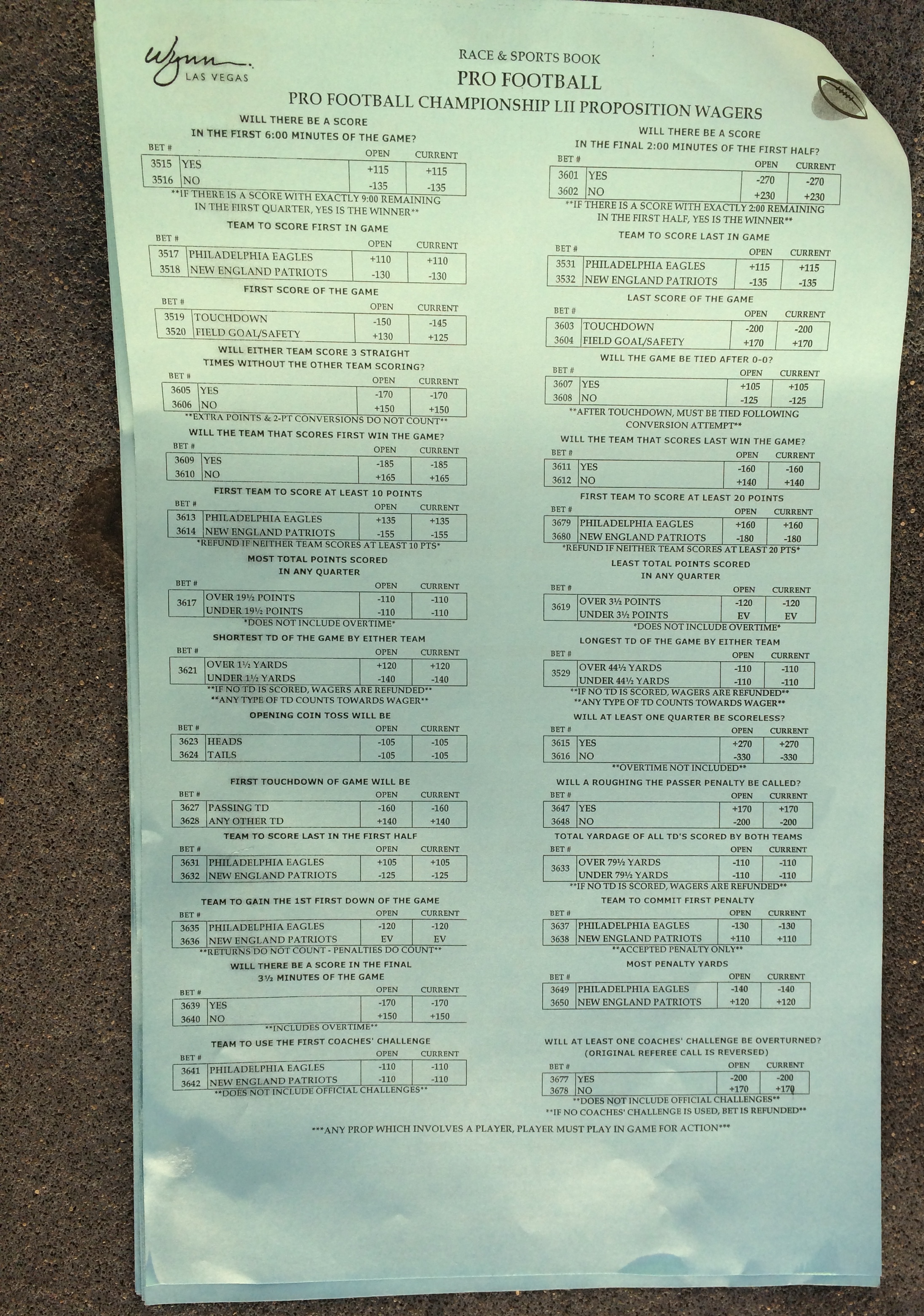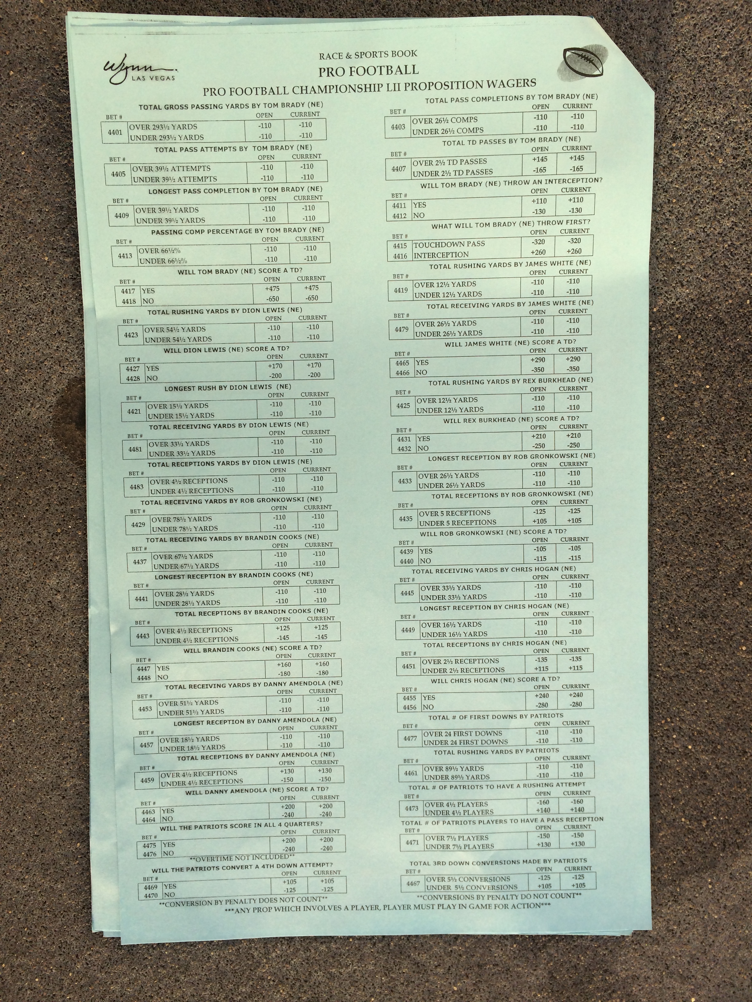 लास वेगास के कई खेल बुक फ़ैमिली में प्रस्तावित दांवों के हर पृष्ठ की तस्वीरें नीचे दी गई हैं। ये शीट्स 27 जनवरी, 2018 को, खेल से आठ दिन पहले, एकत्र की गई थीं।