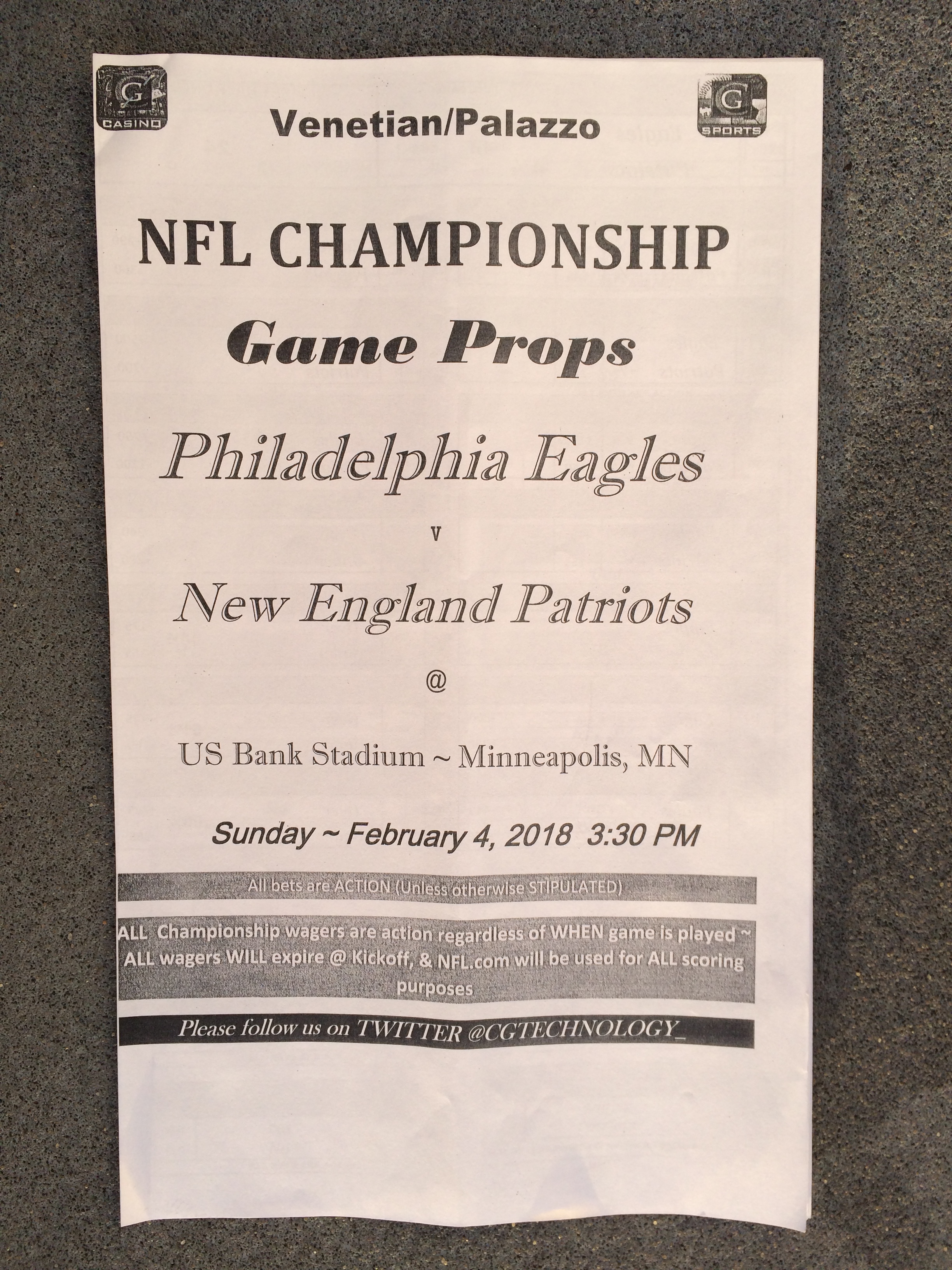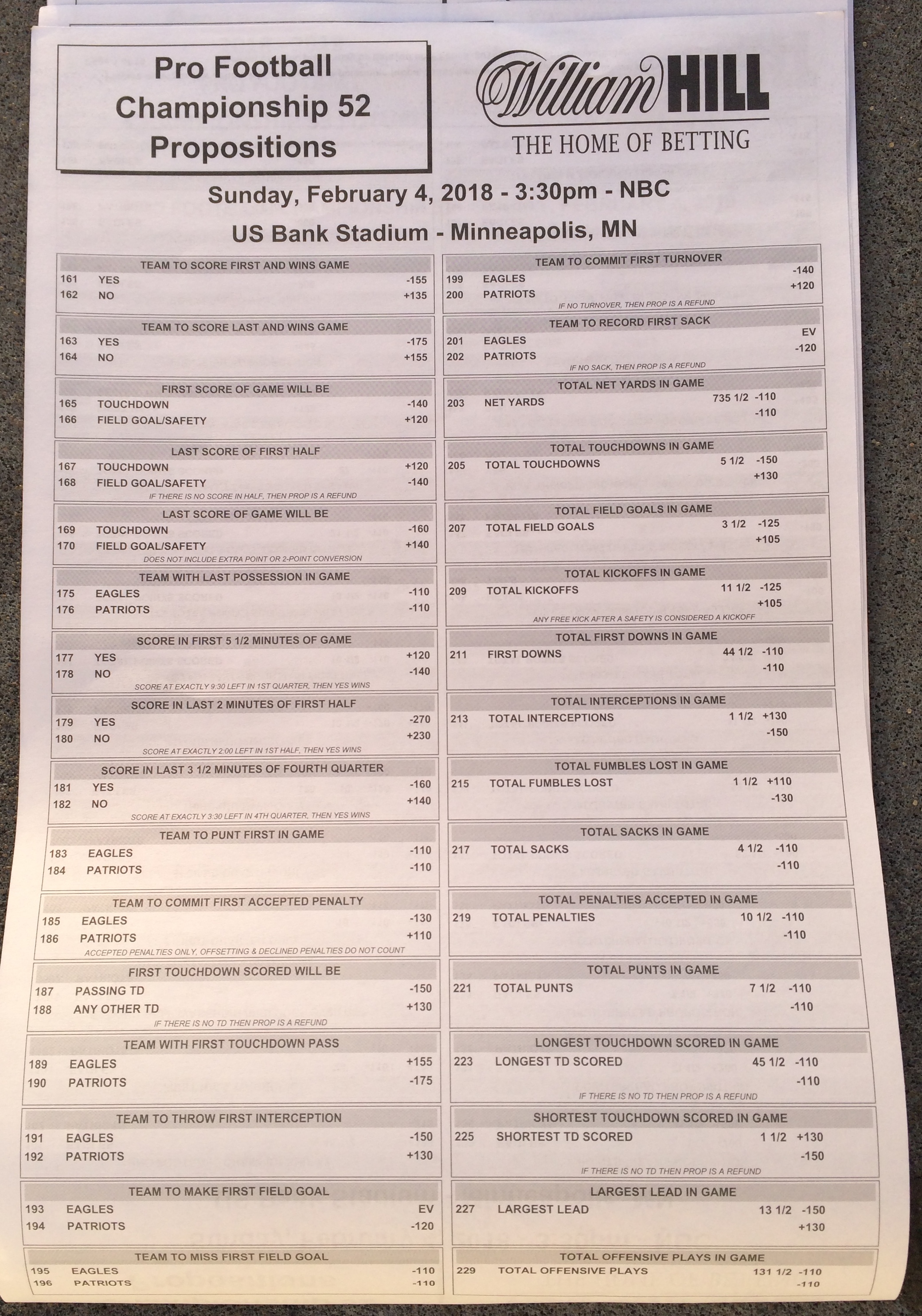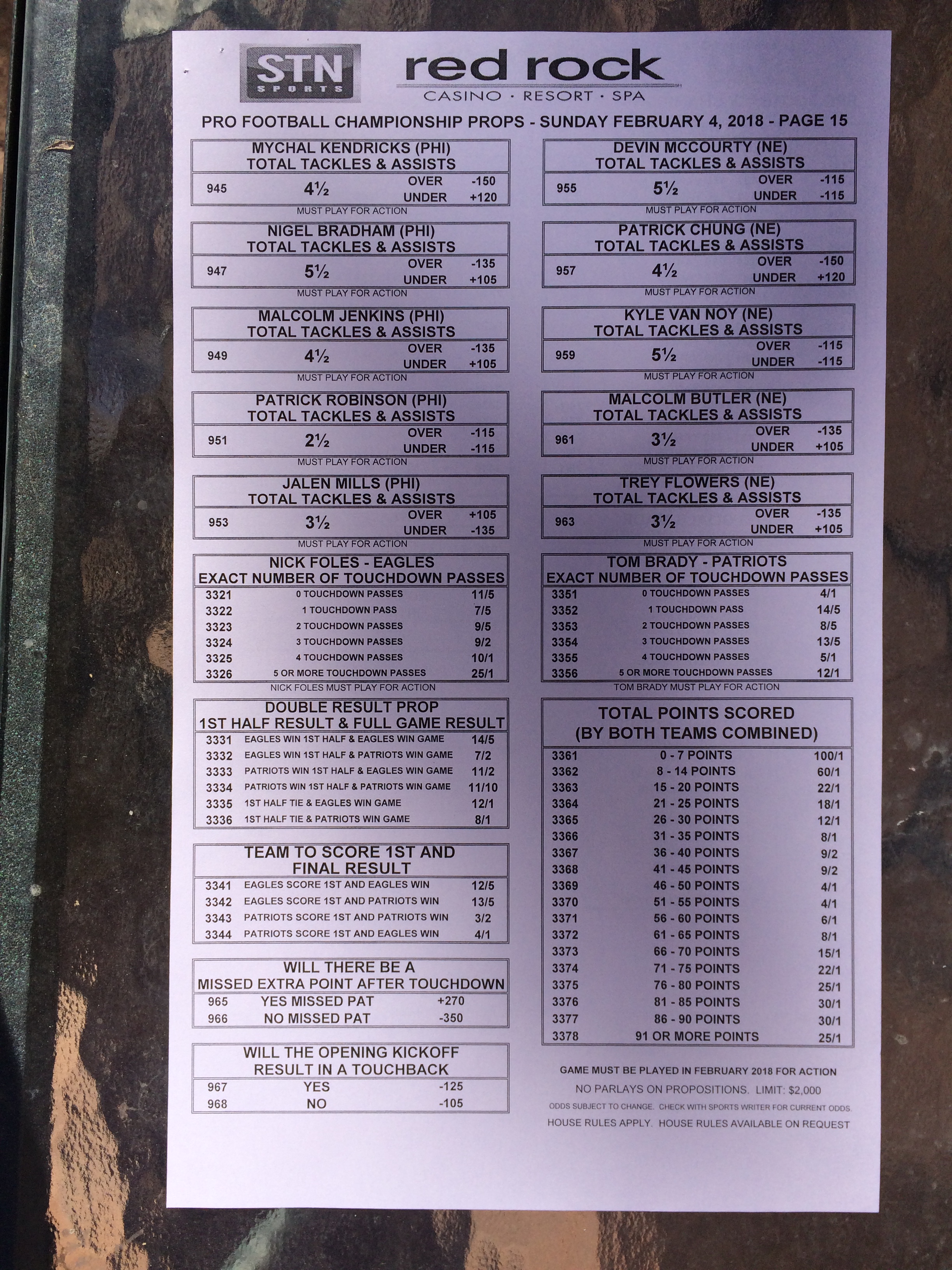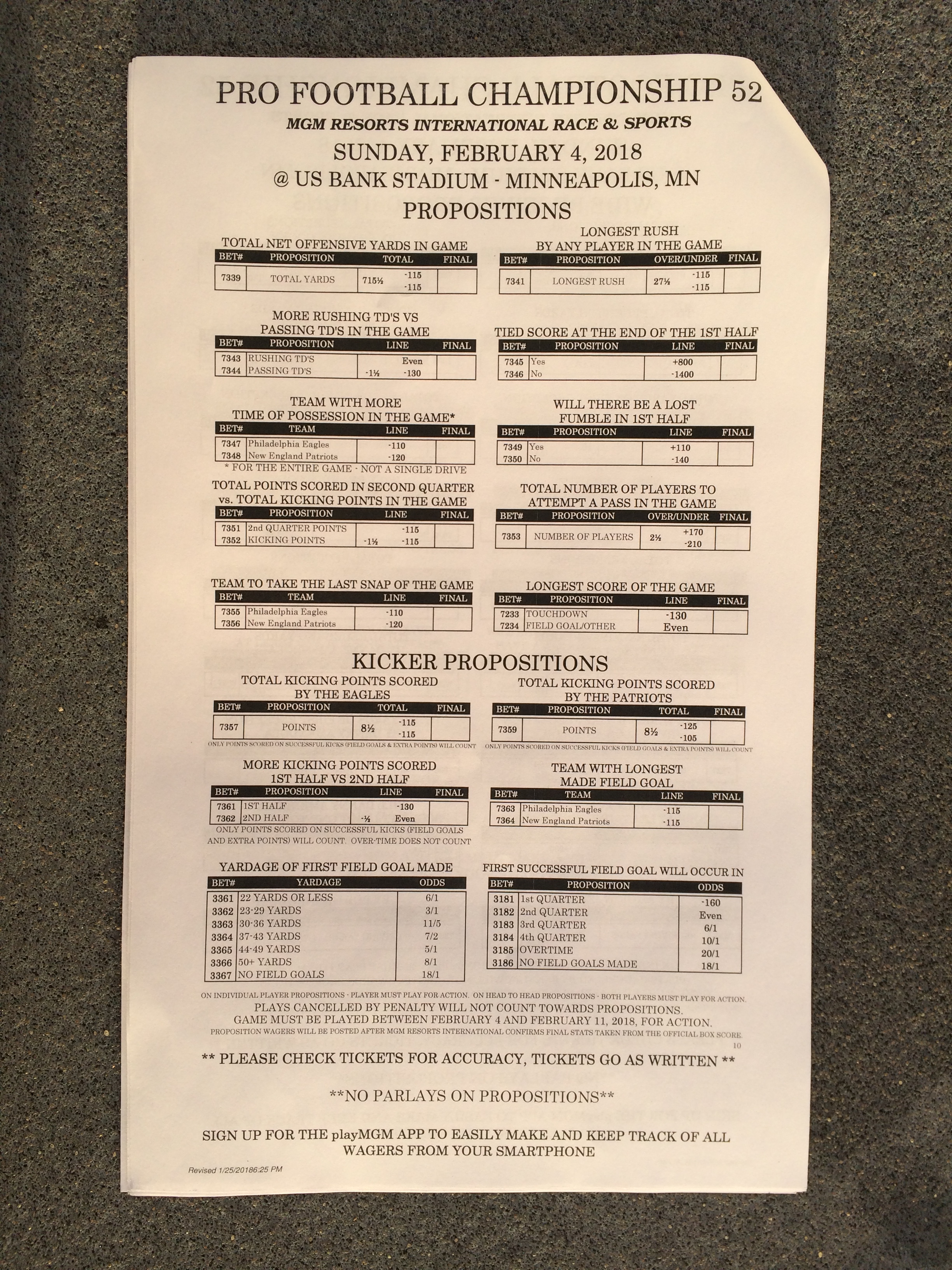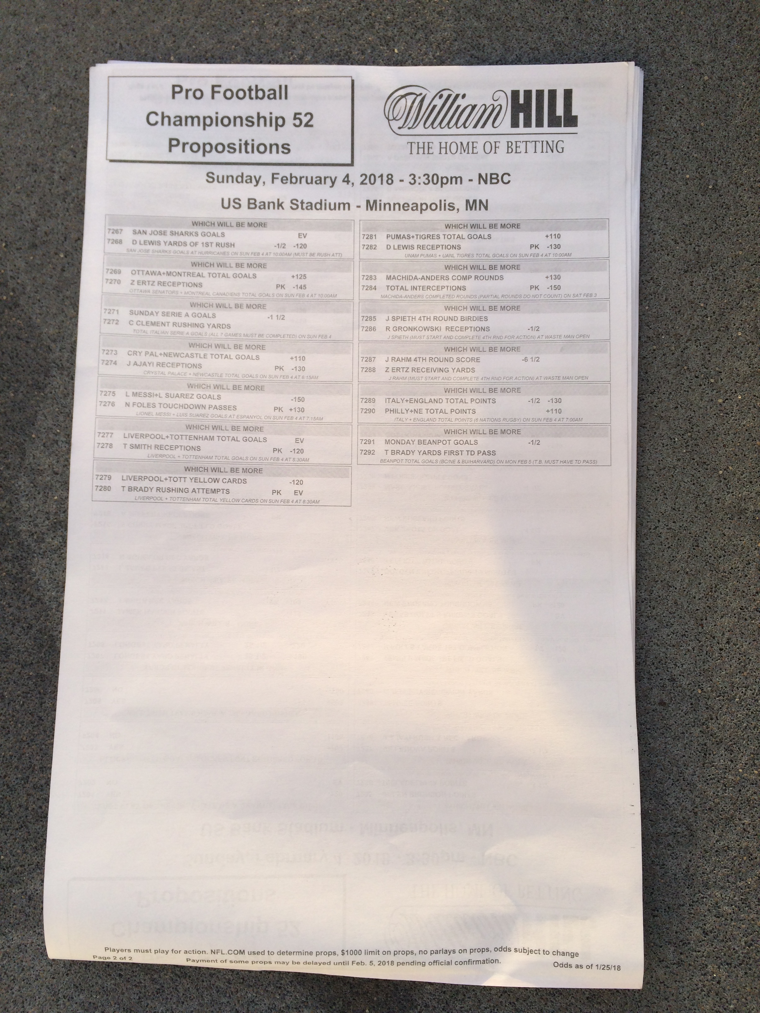 लास वेगास के कई खेल बुक फ़ैमिली में प्रस्तावित दांवों के हर पृष्ठ की तस्वीरें नीचे दी गई हैं। ये शीट्स 27 जनवरी, 2018 को, खेल से आठ दिन पहले, एकत्र की गई थीं।