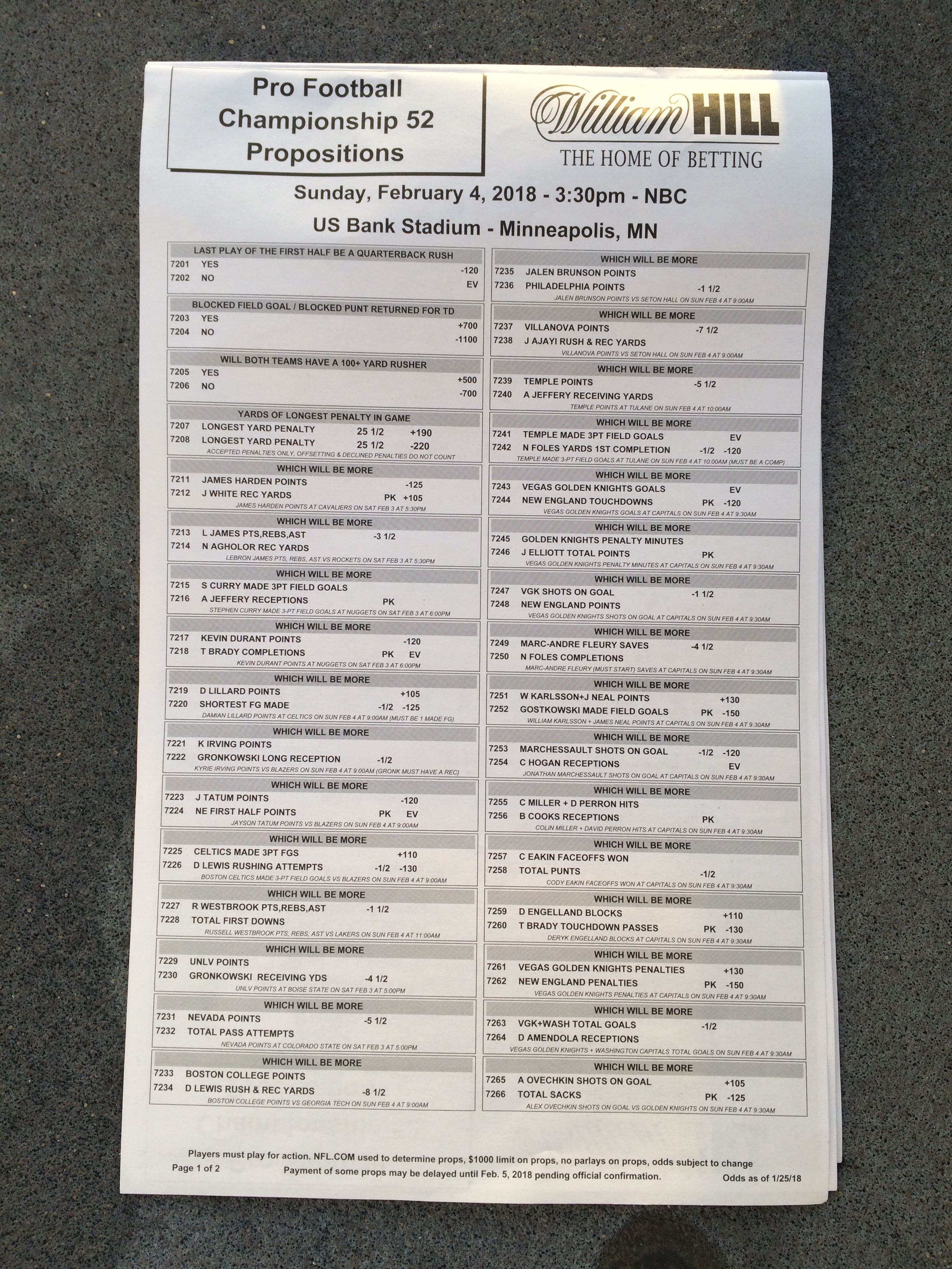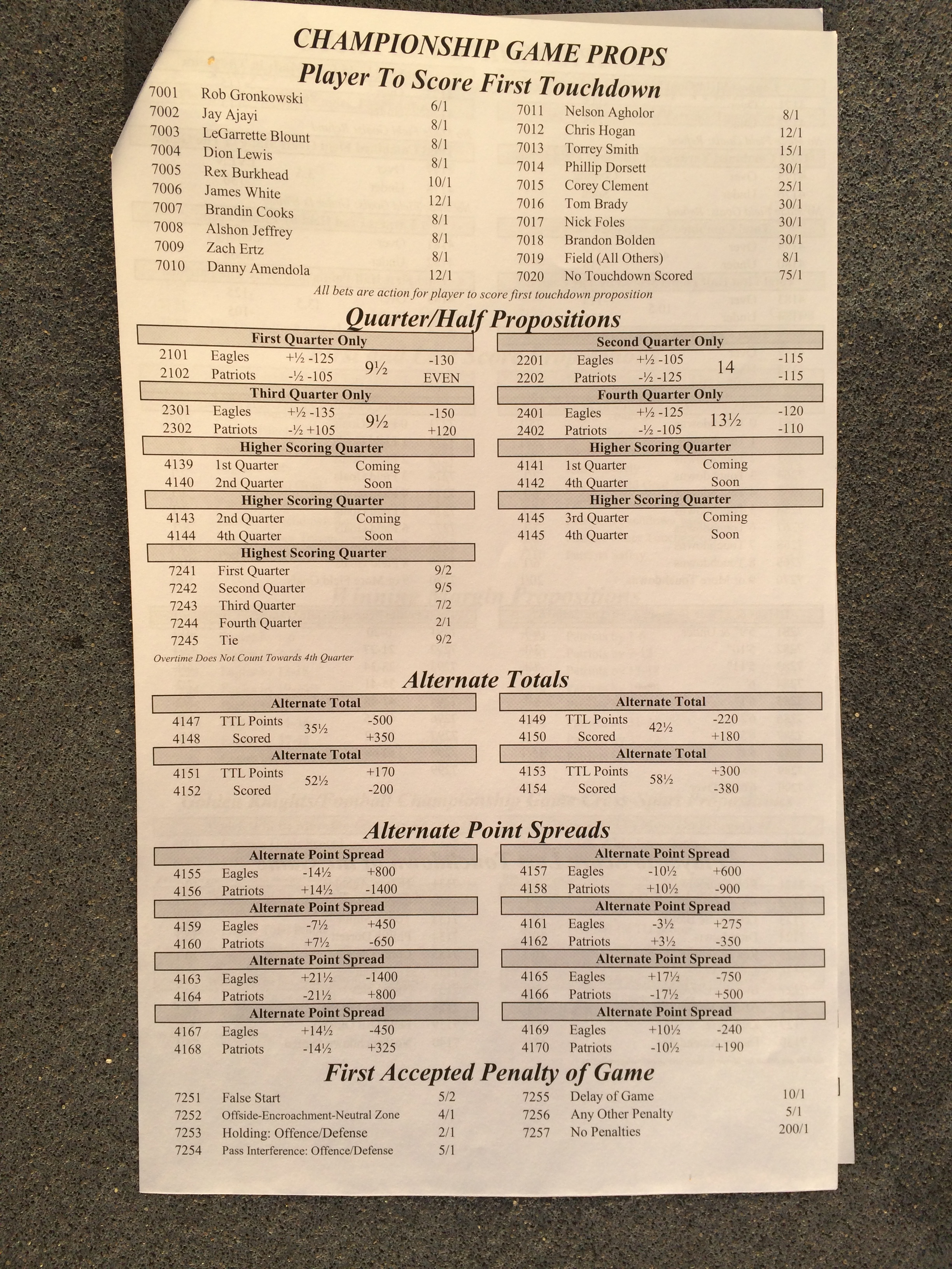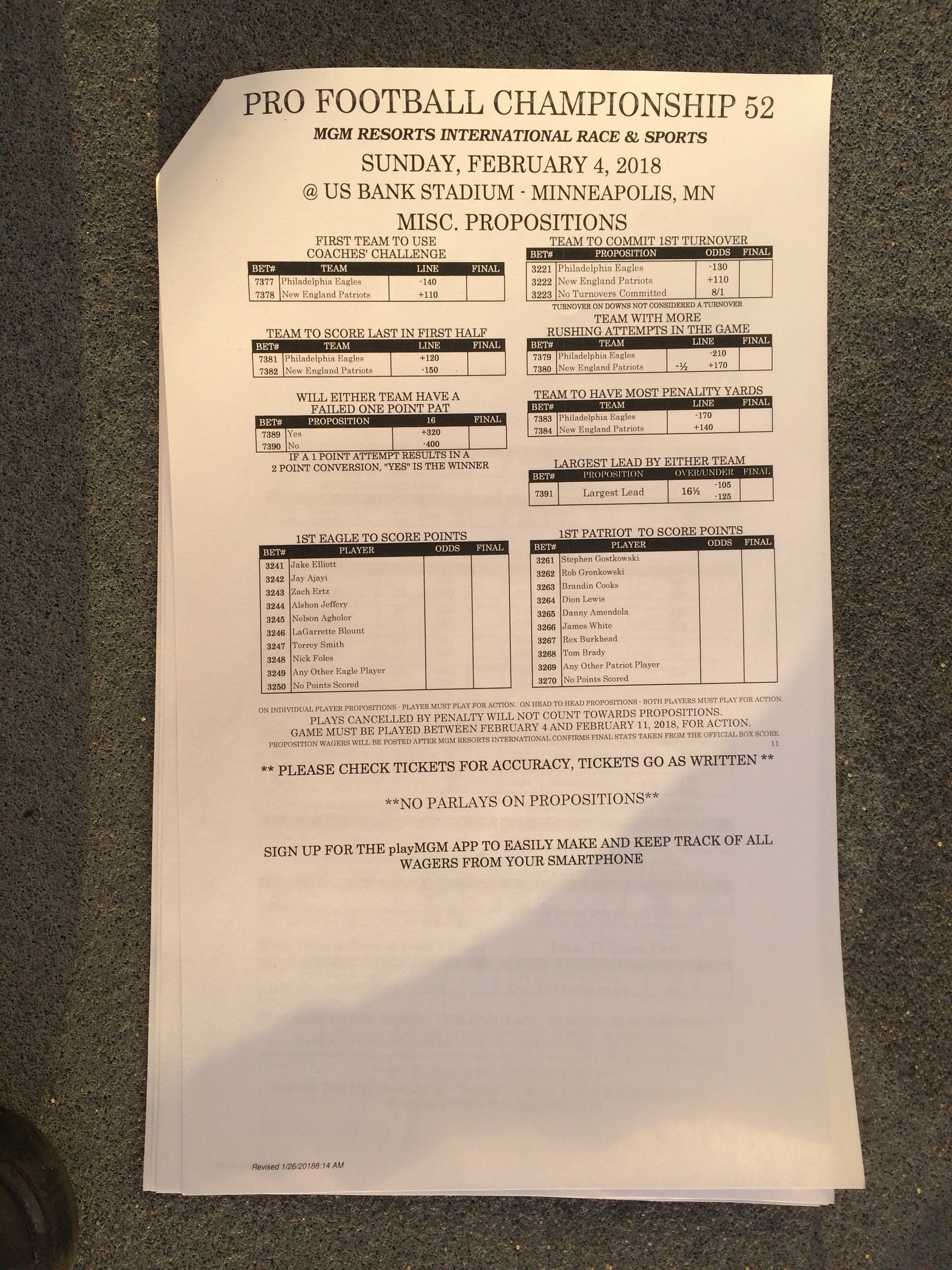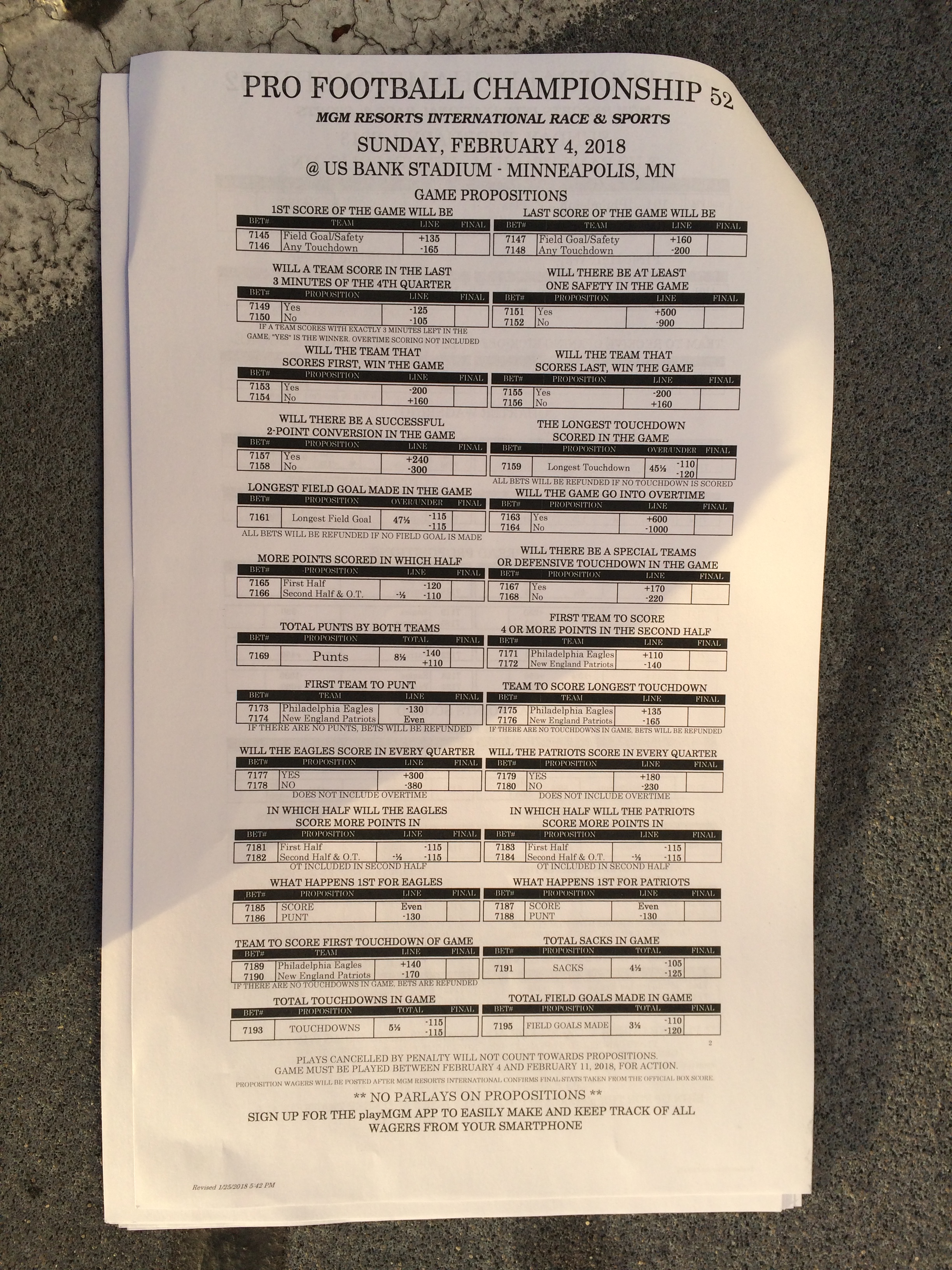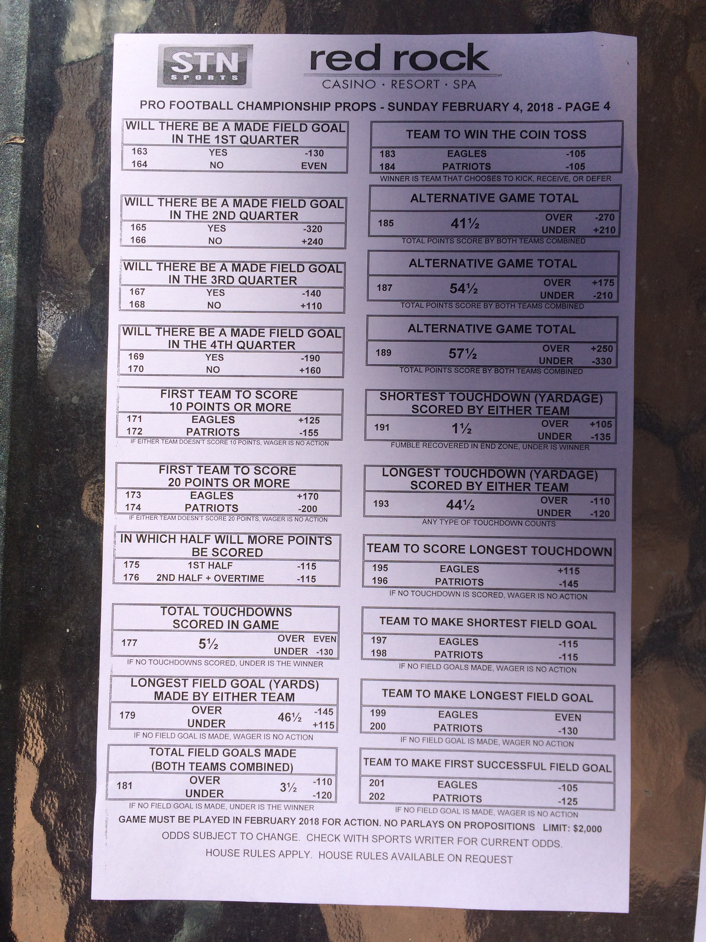 लास वेगास के कई खेल बुक फ़ैमिली में प्रस्तावित दांवों के हर पृष्ठ की तस्वीरें नीचे दी गई हैं। ये शीट्स 27 जनवरी, 2018 को, खेल से आठ दिन पहले, एकत्र की गई थीं।