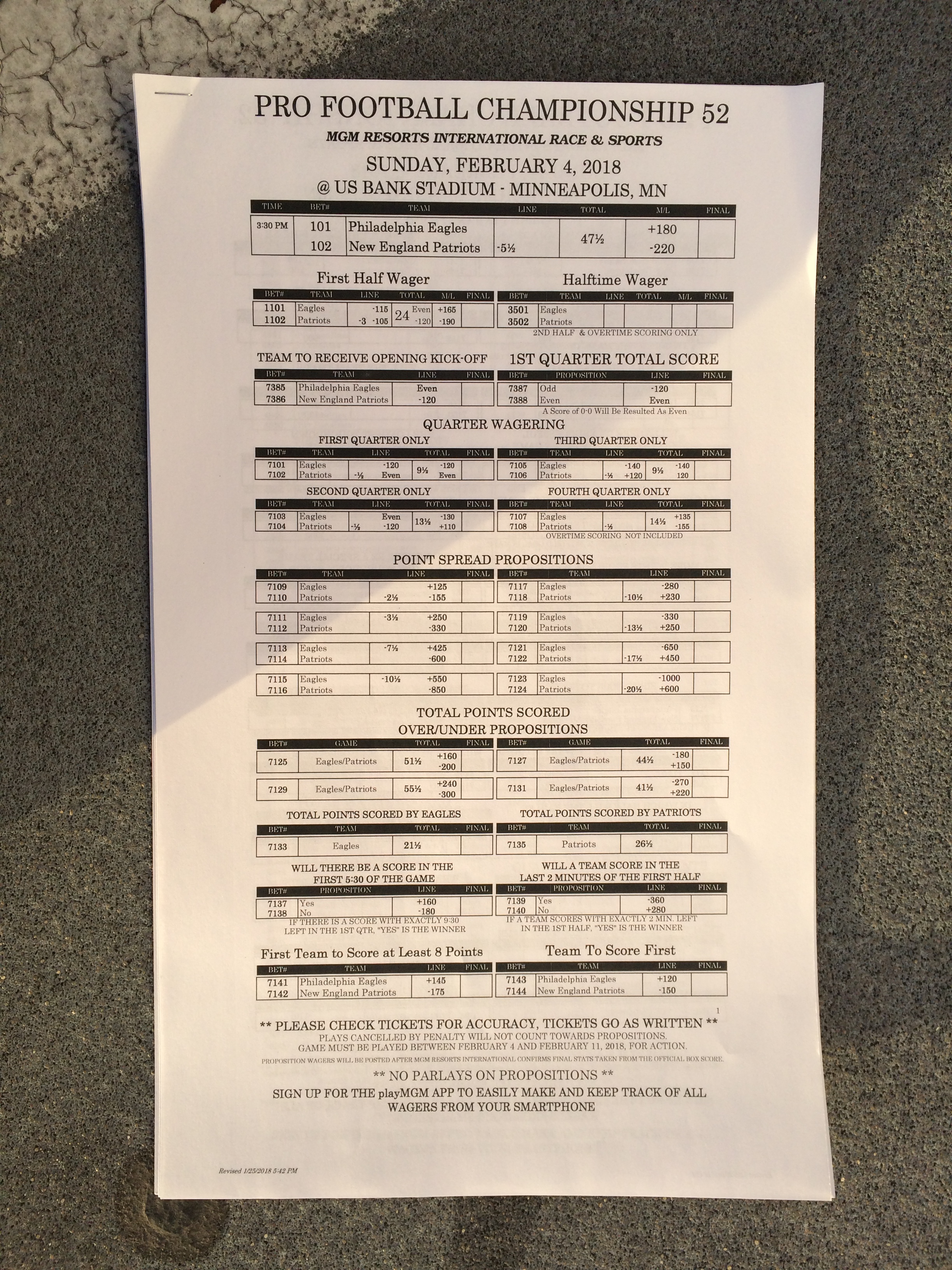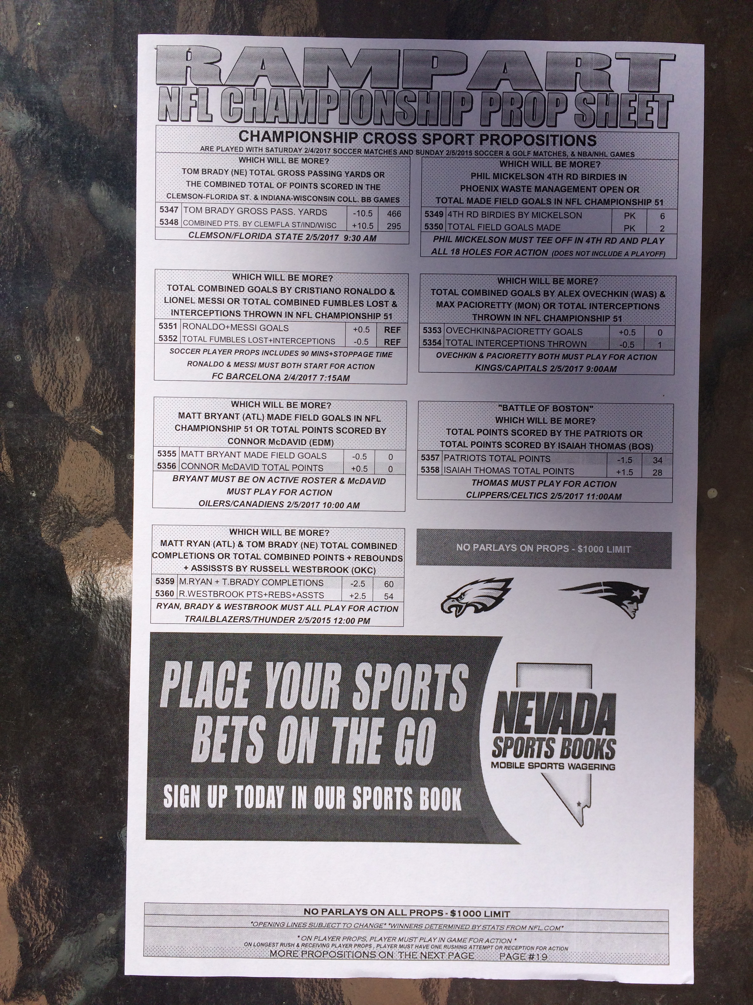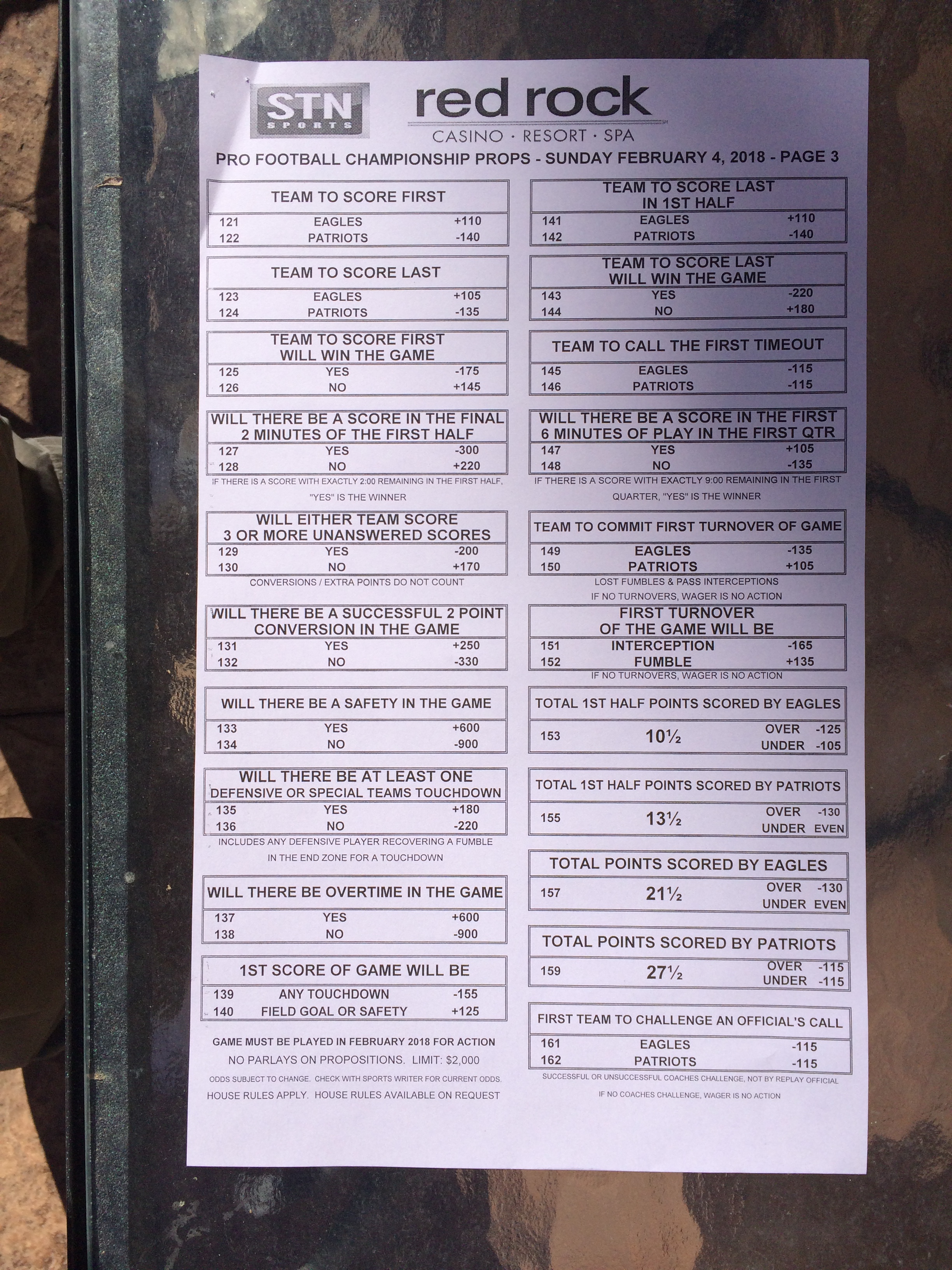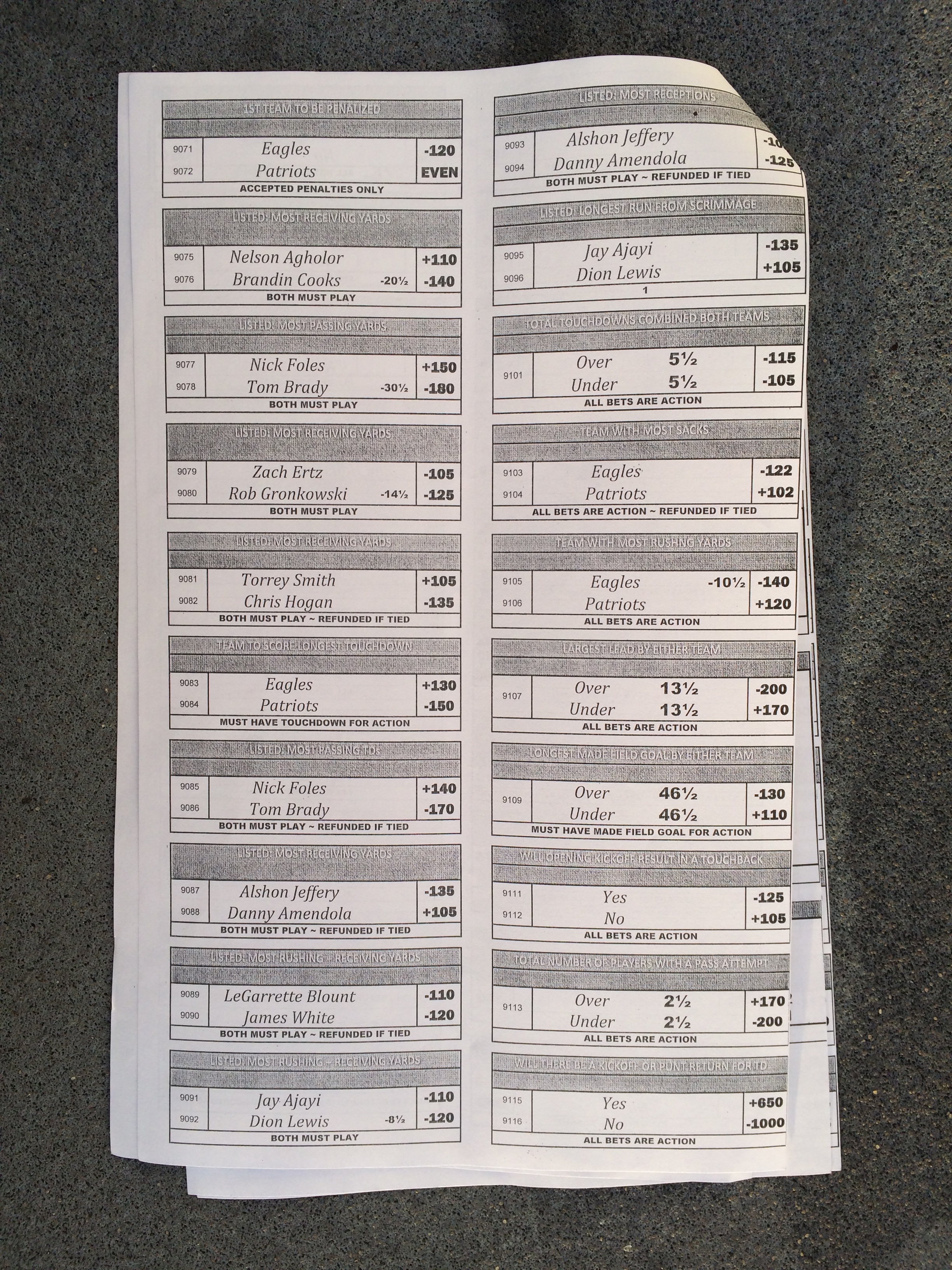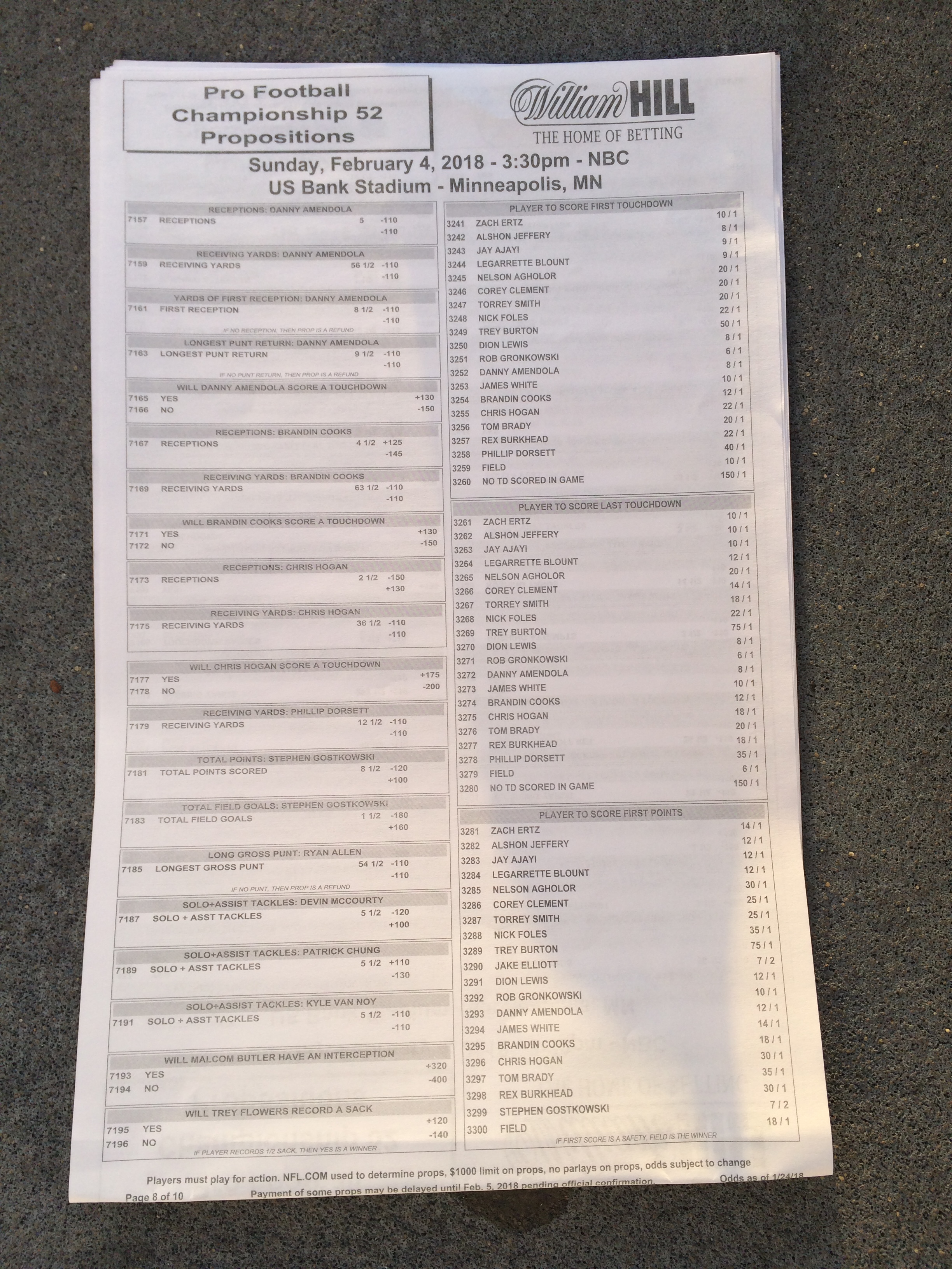 लास वेगास के कई खेल बुक फ़ैमिली में प्रस्तावित दांवों के हर पृष्ठ की तस्वीरें नीचे दी गई हैं। ये शीट्स 27 जनवरी, 2018 को, खेल से आठ दिन पहले, एकत्र की गई थीं।
