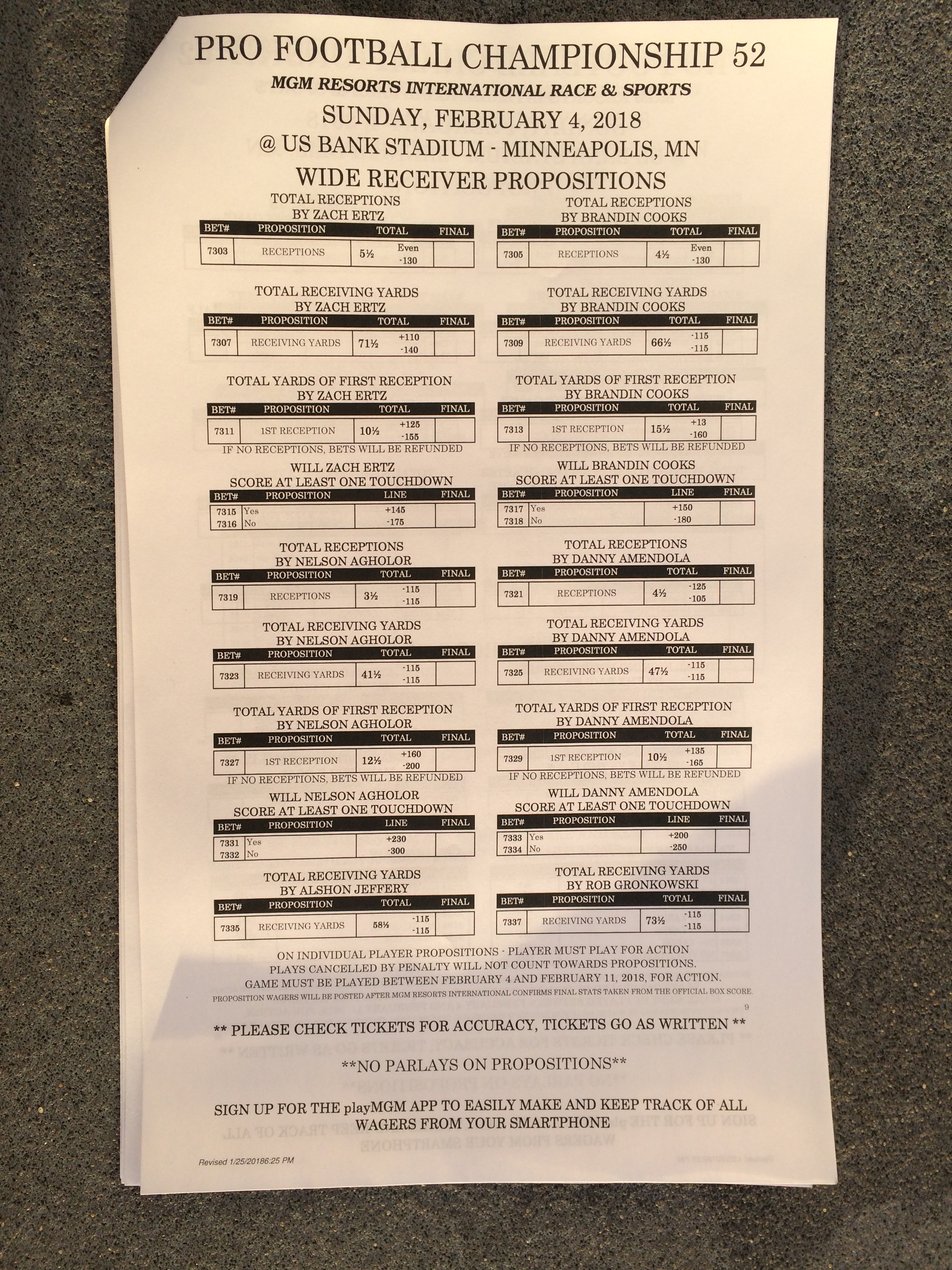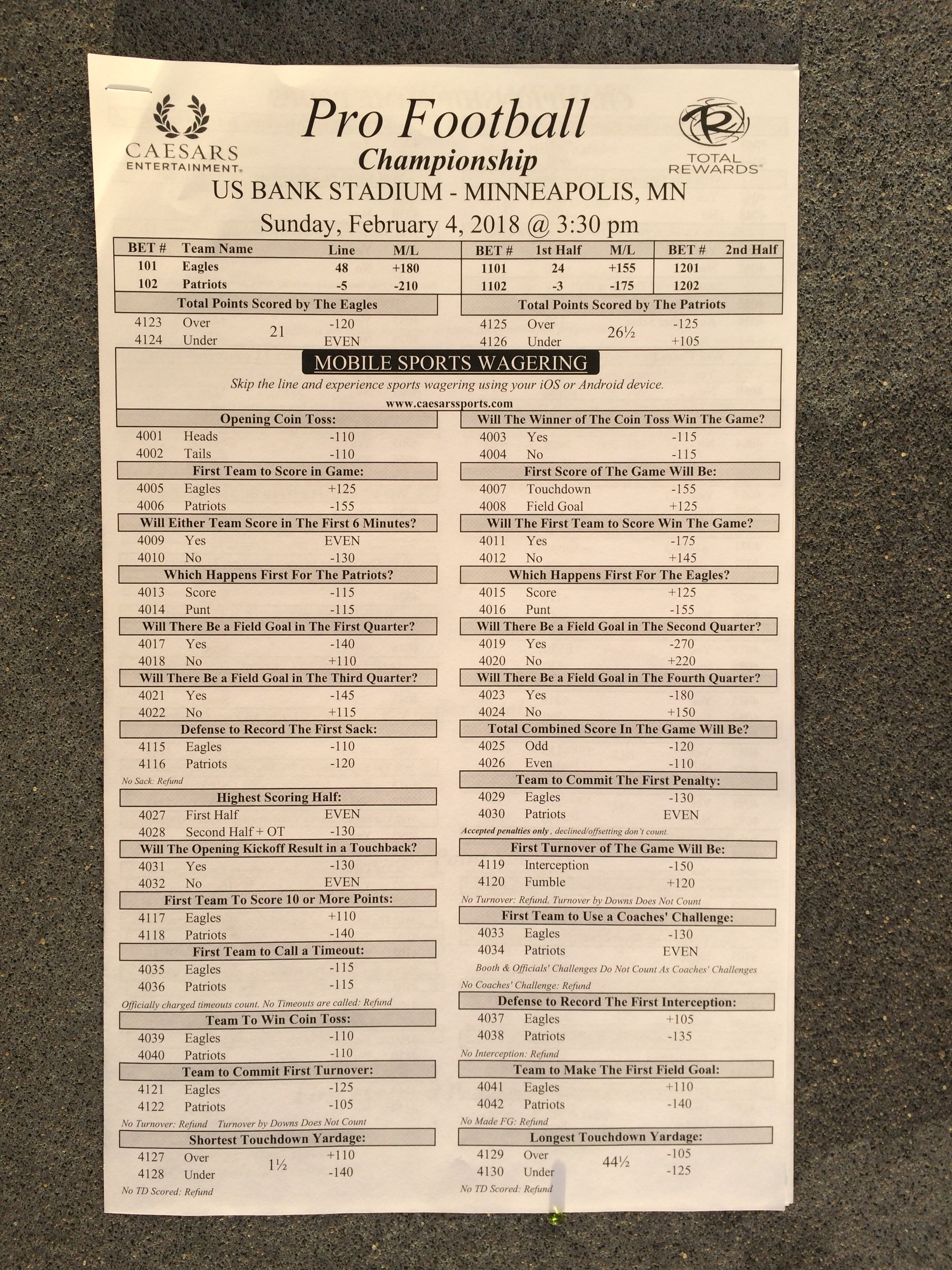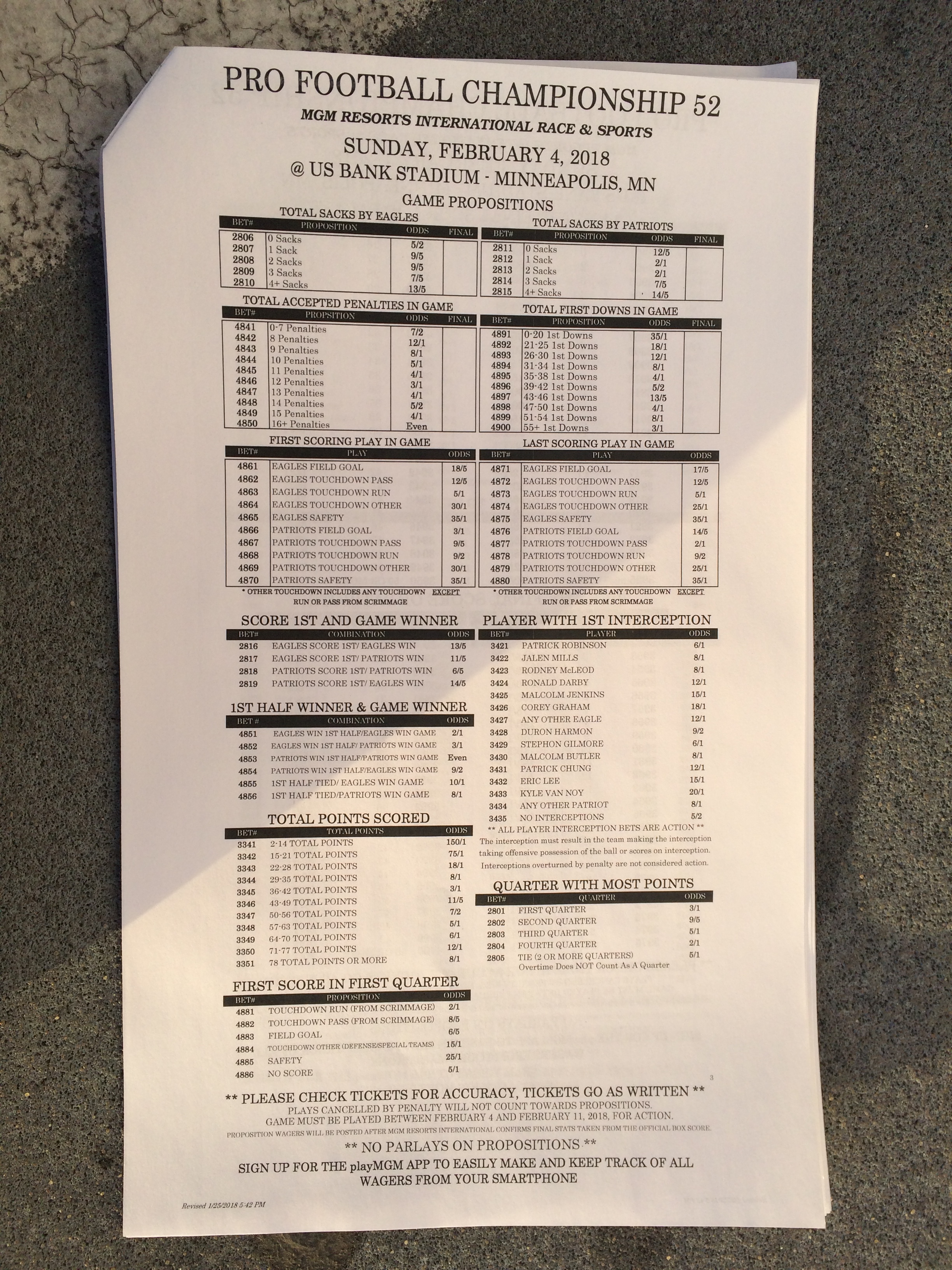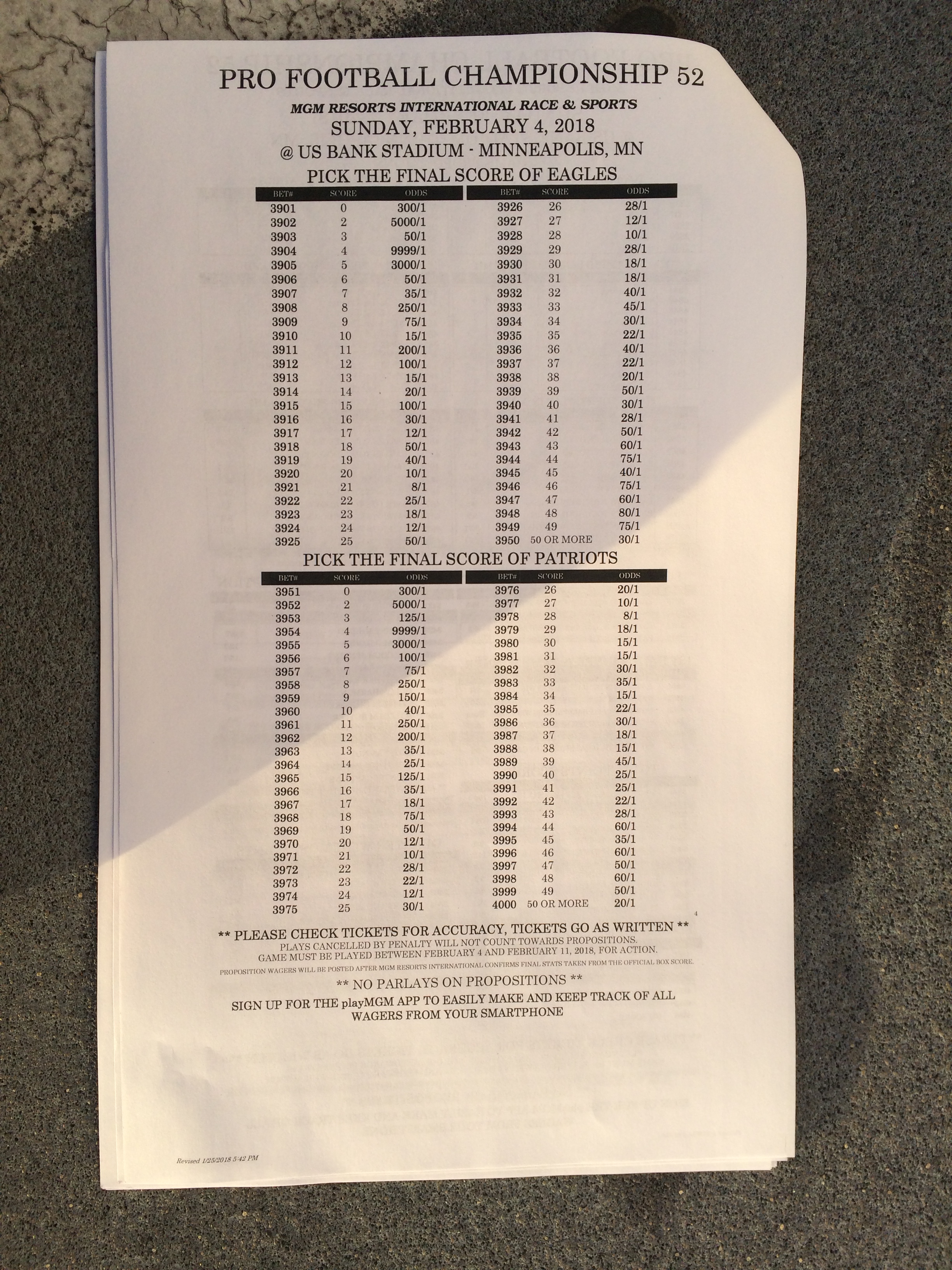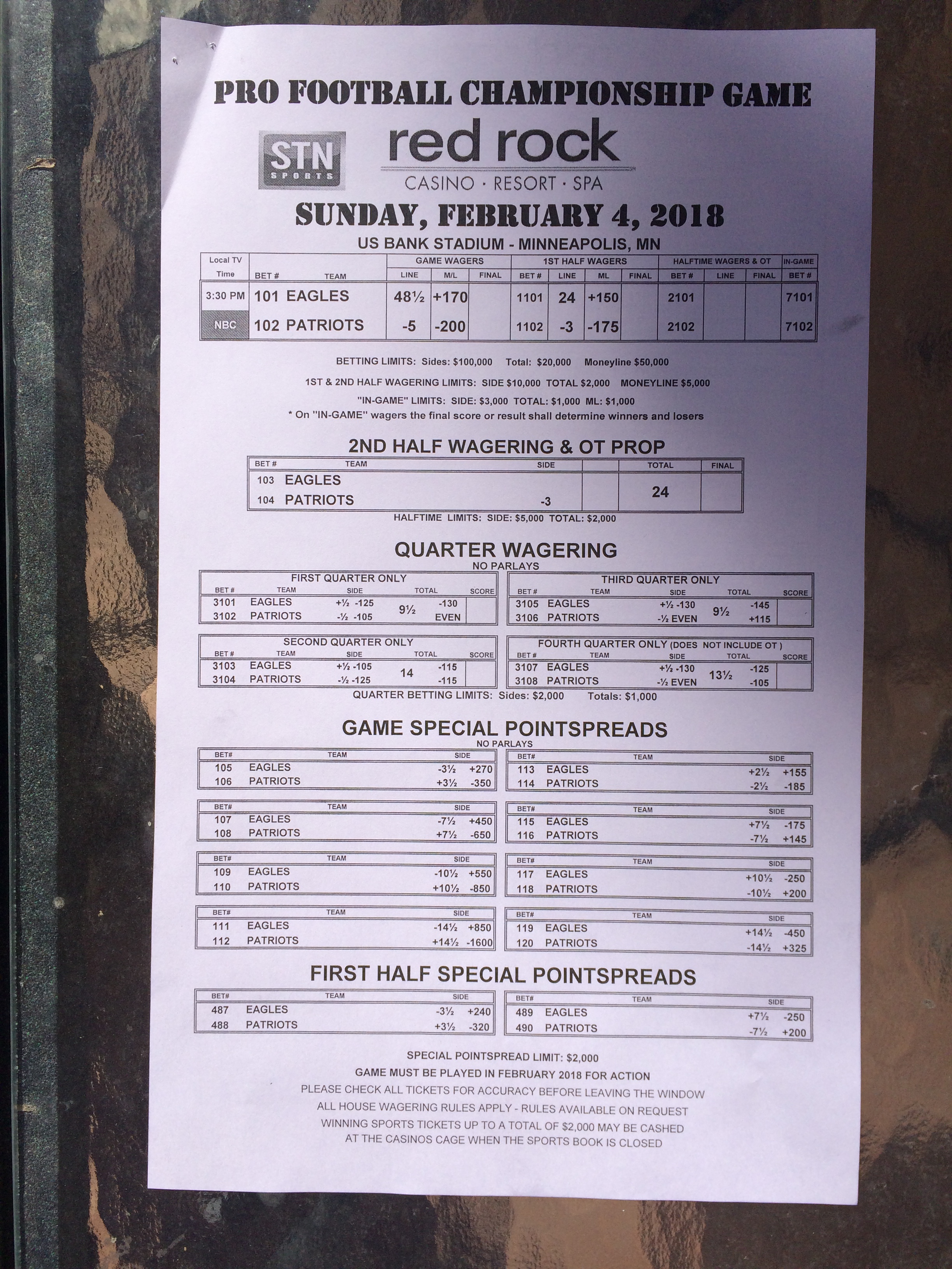 लास वेगास के कई खेल बुक फ़ैमिली में प्रस्तावित दांवों के हर पृष्ठ की तस्वीरें नीचे दी गई हैं। ये शीट्स 27 जनवरी, 2018 को, खेल से आठ दिन पहले, एकत्र की गई थीं।