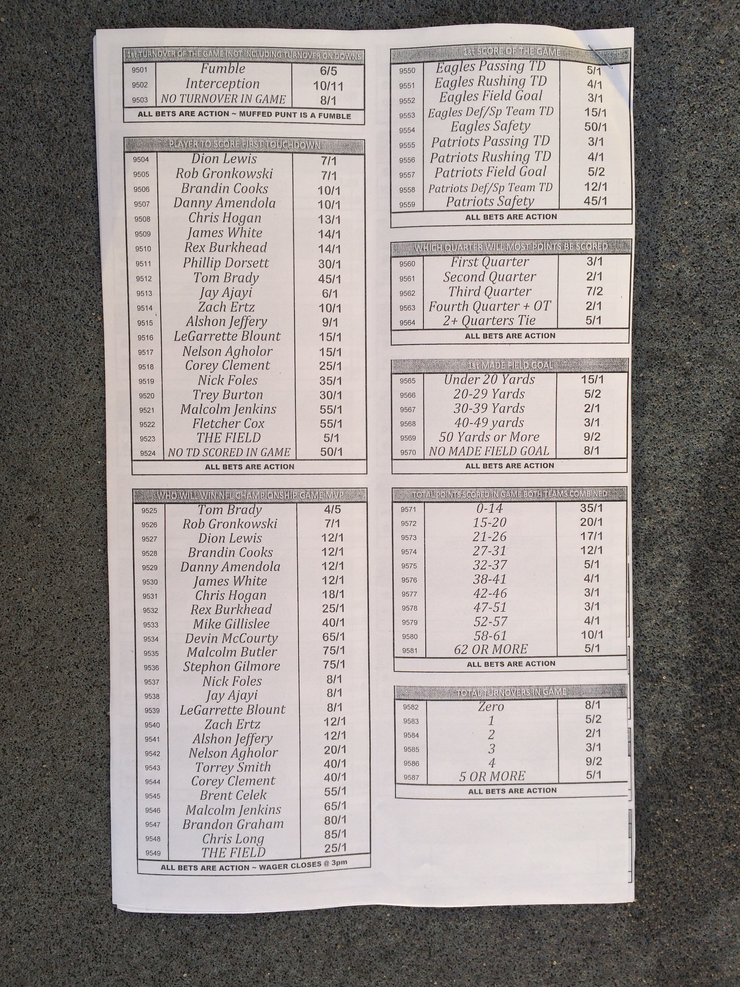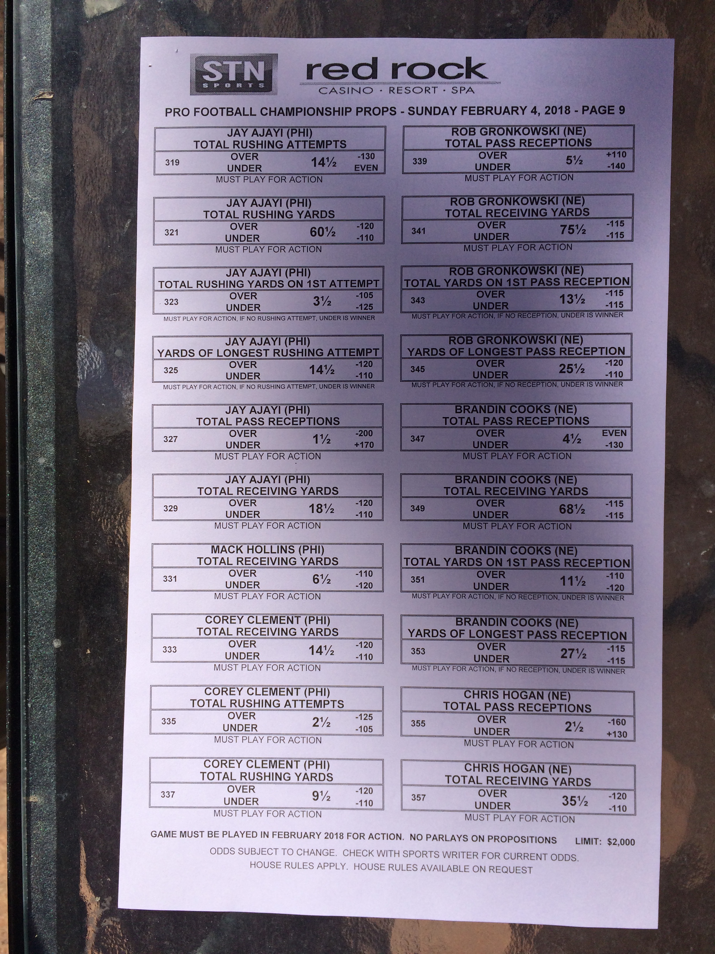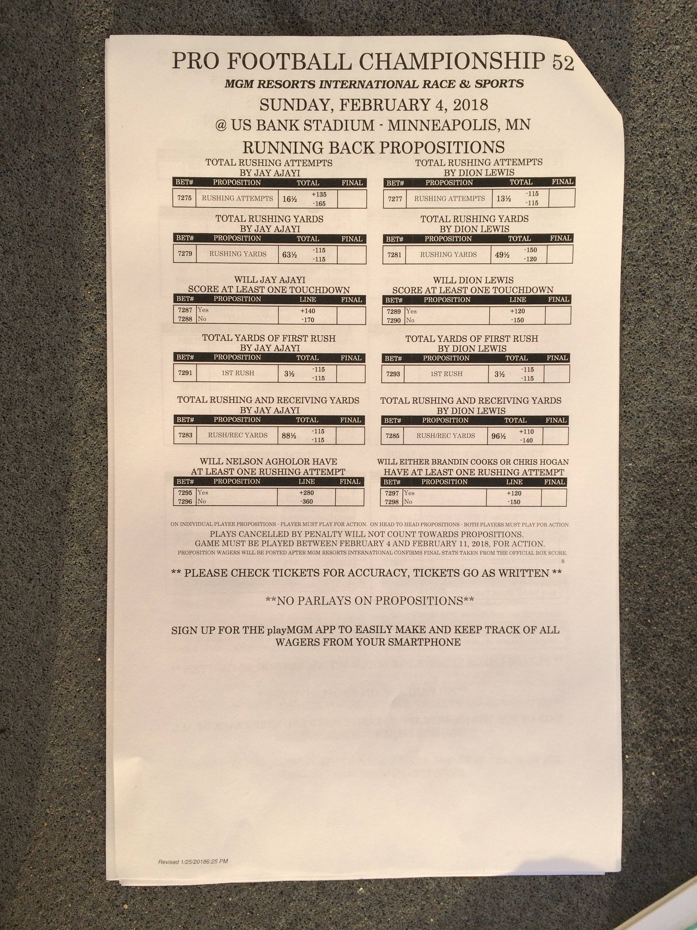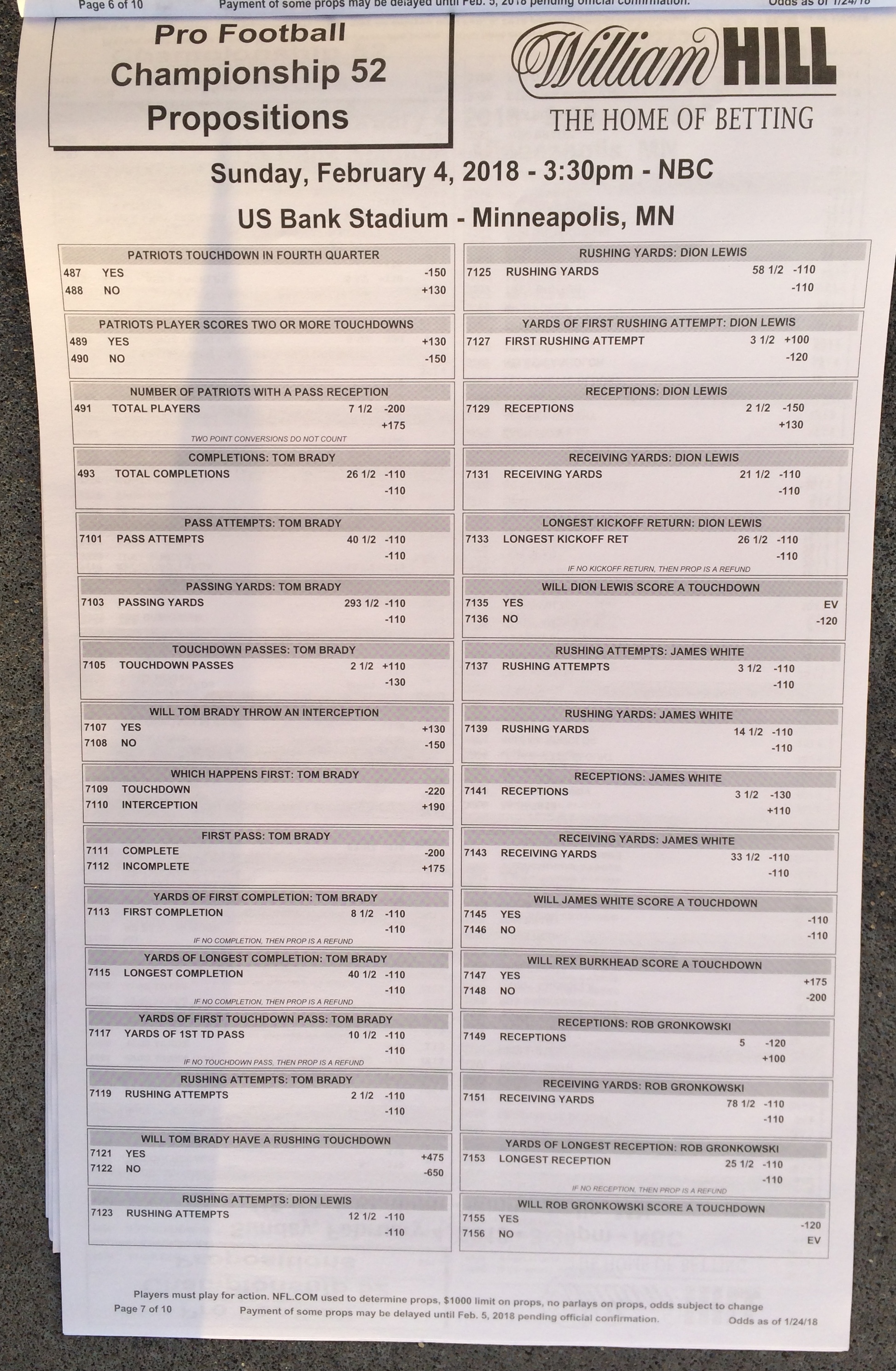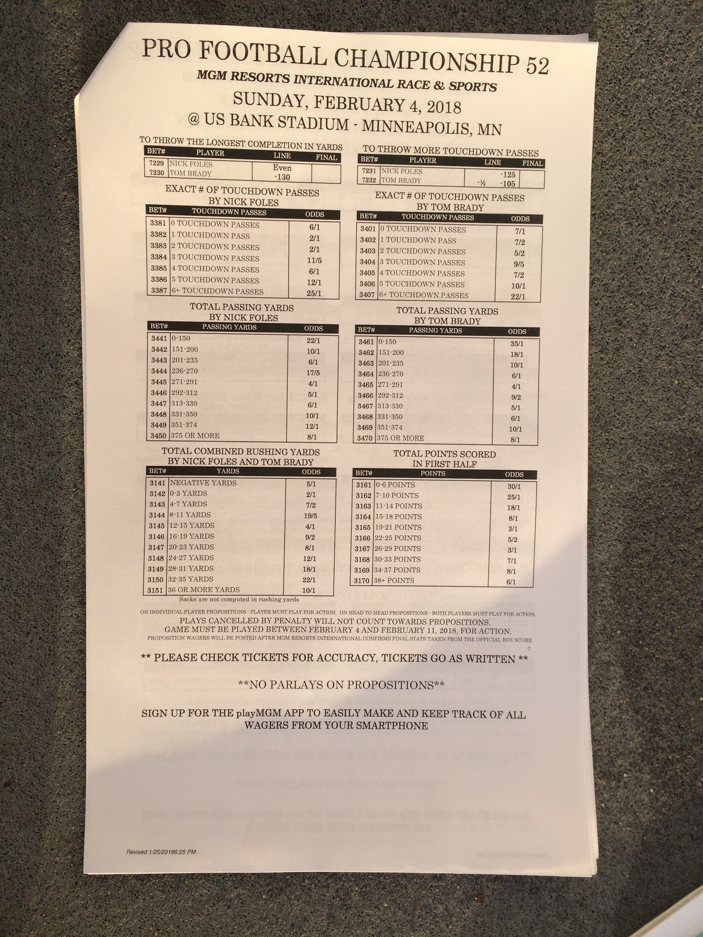 लास वेगास के कई खेल बुक फ़ैमिली में प्रस्तावित दांवों के हर पृष्ठ की तस्वीरें नीचे दी गई हैं। ये शीट्स 27 जनवरी, 2018 को, खेल से आठ दिन पहले, एकत्र की गई थीं।