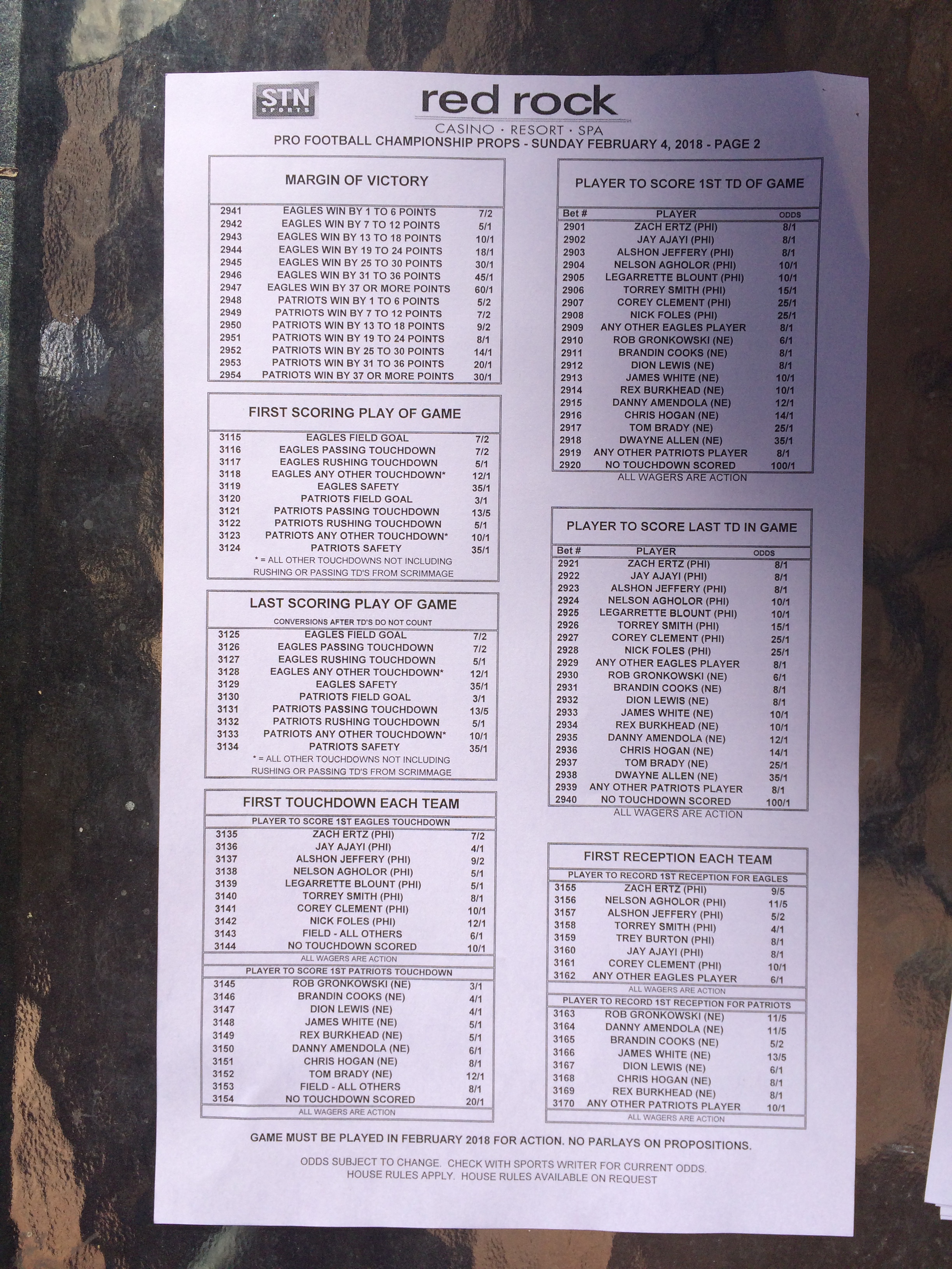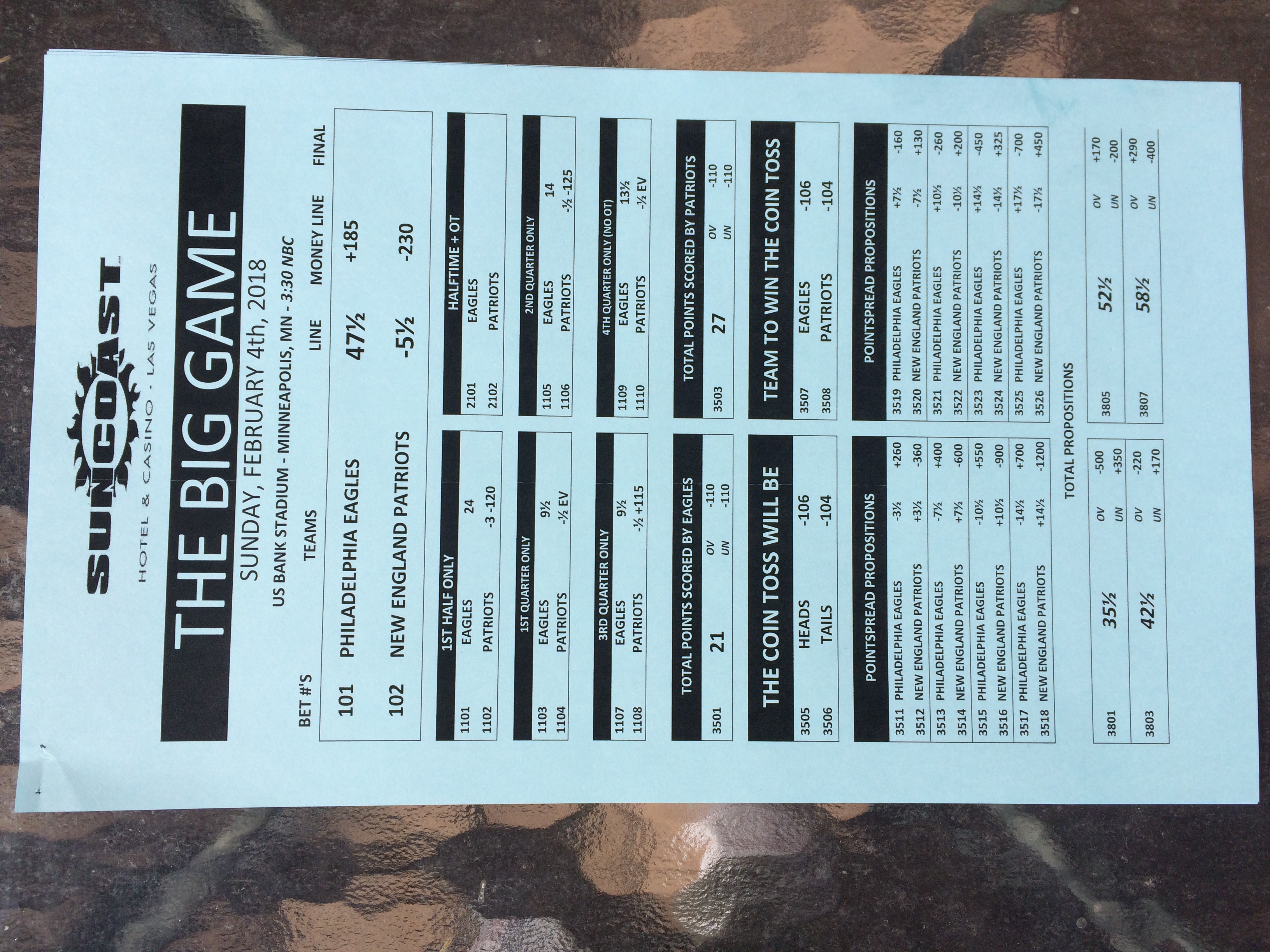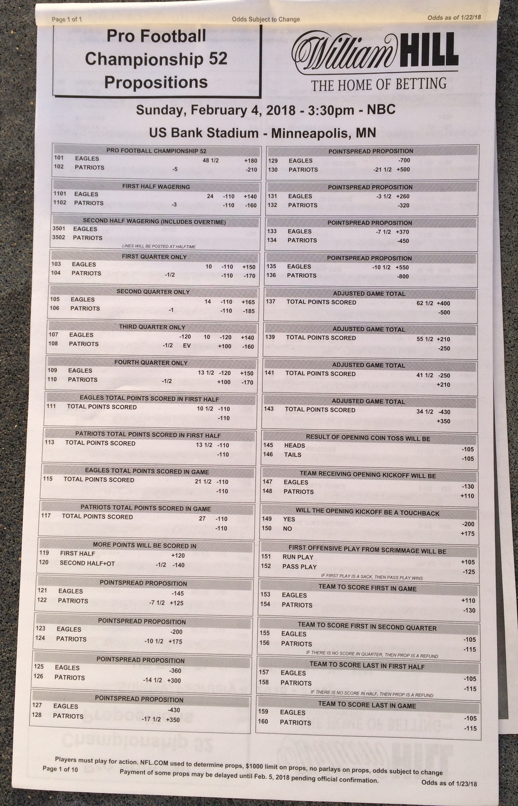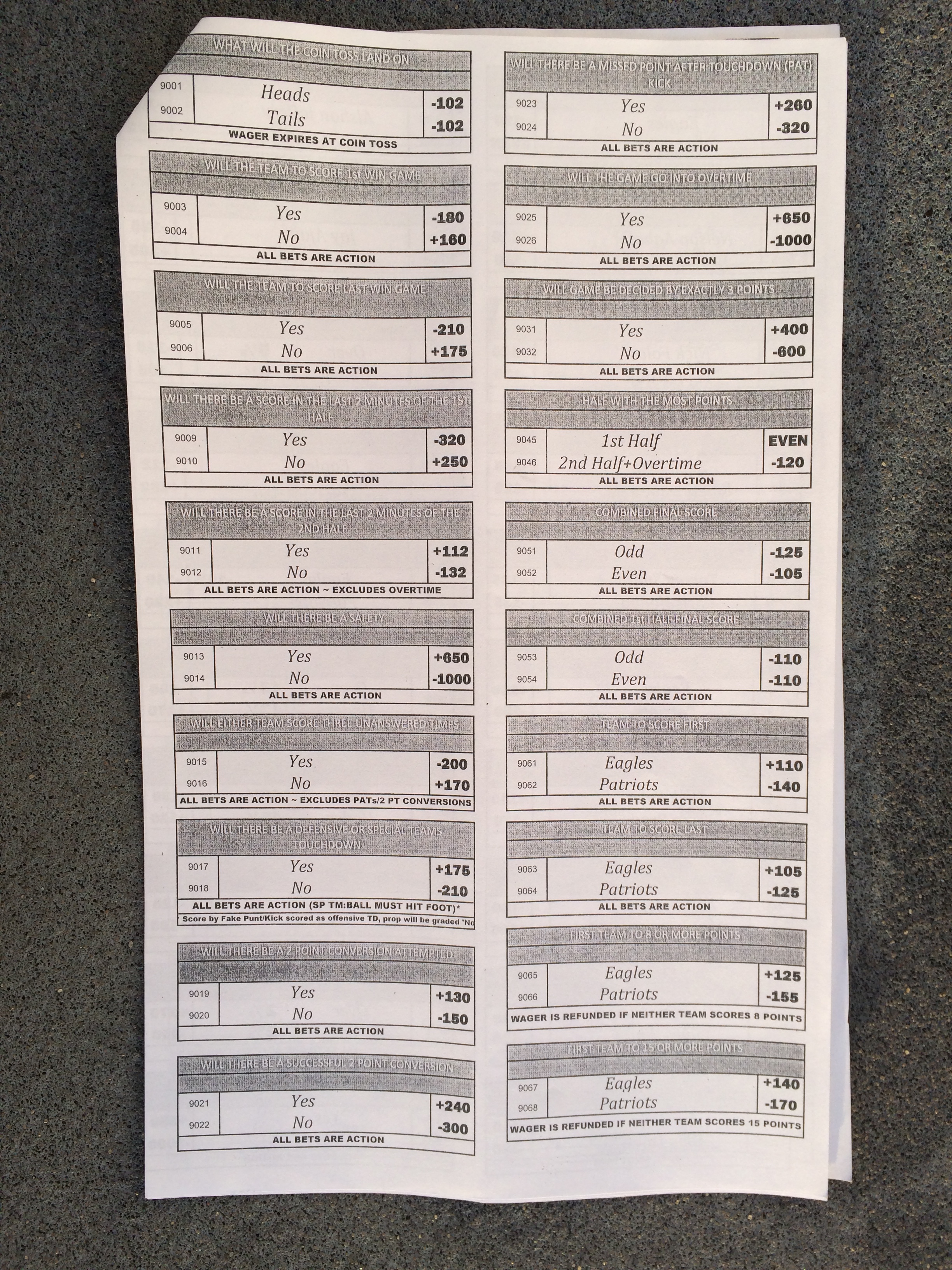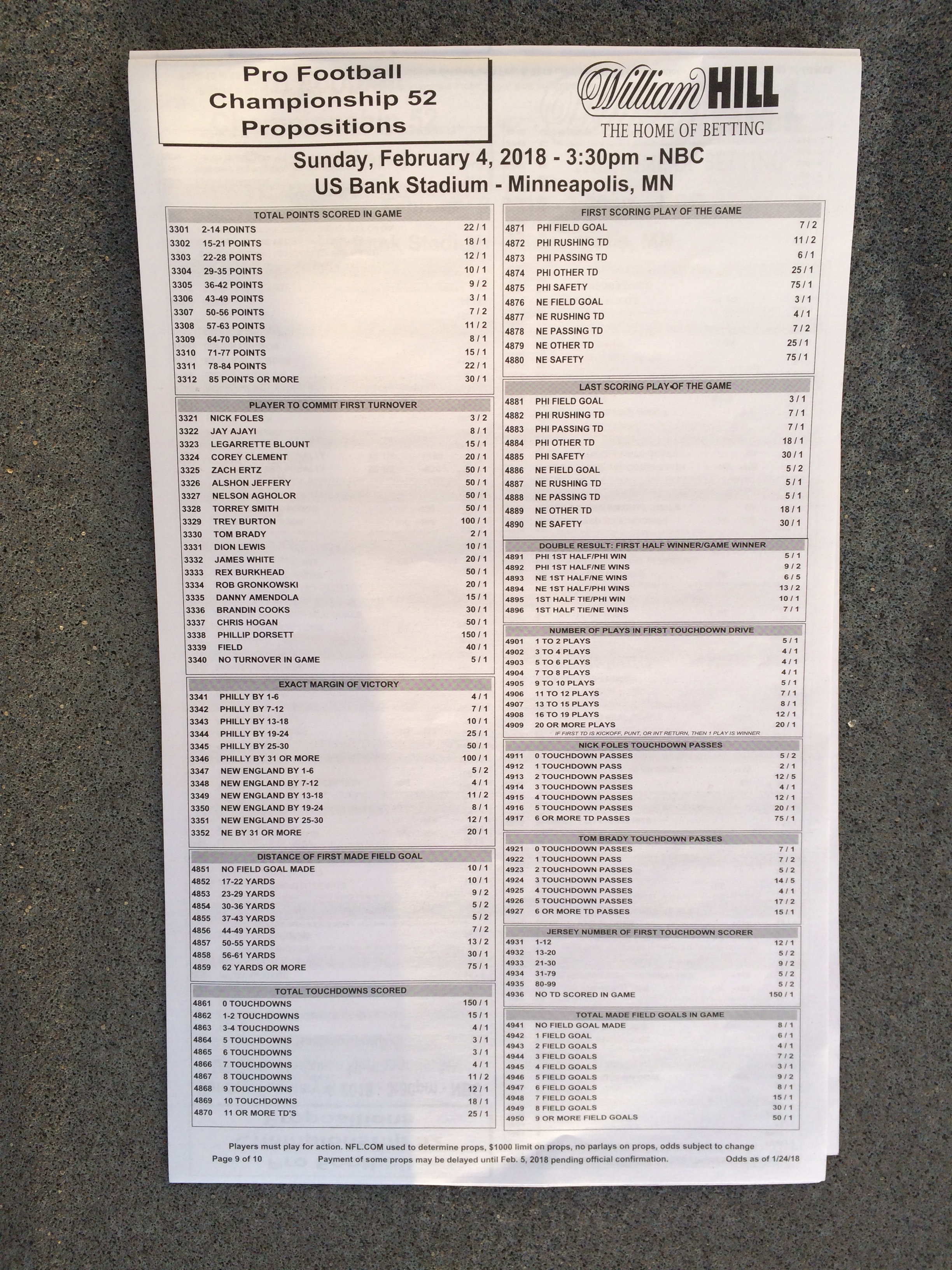 लास वेगास के कई खेल बुक फ़ैमिली में प्रस्तावित दांवों के हर पृष्ठ की तस्वीरें नीचे दी गई हैं। ये शीट्स 27 जनवरी, 2018 को, खेल से आठ दिन पहले, एकत्र की गई थीं।