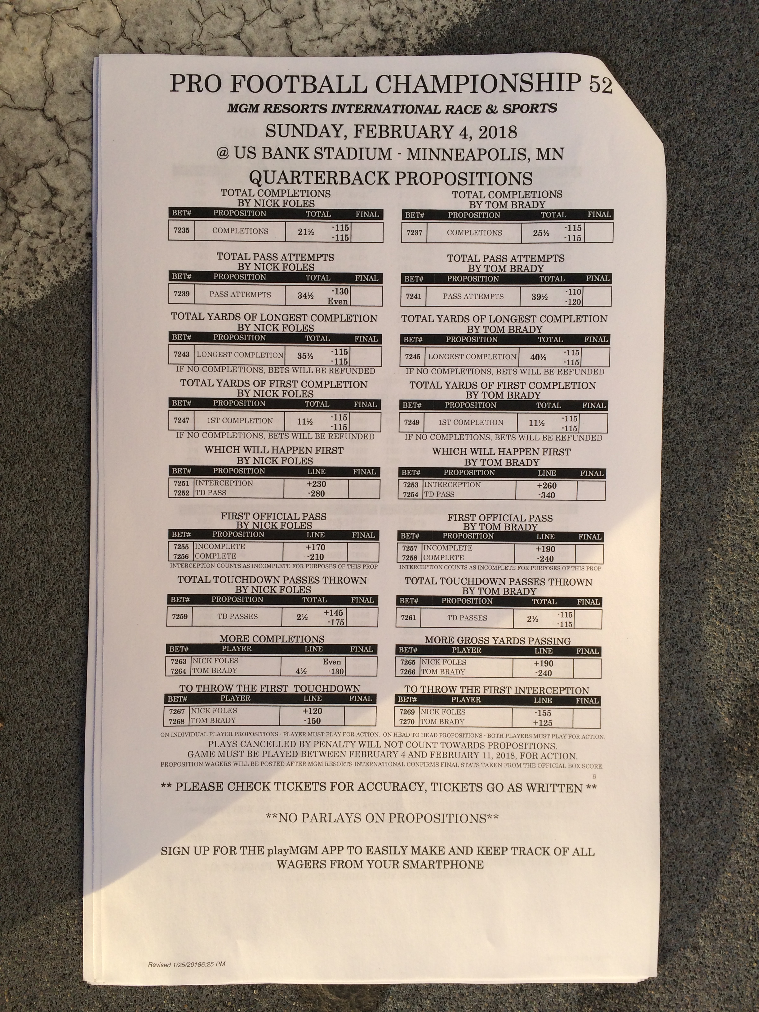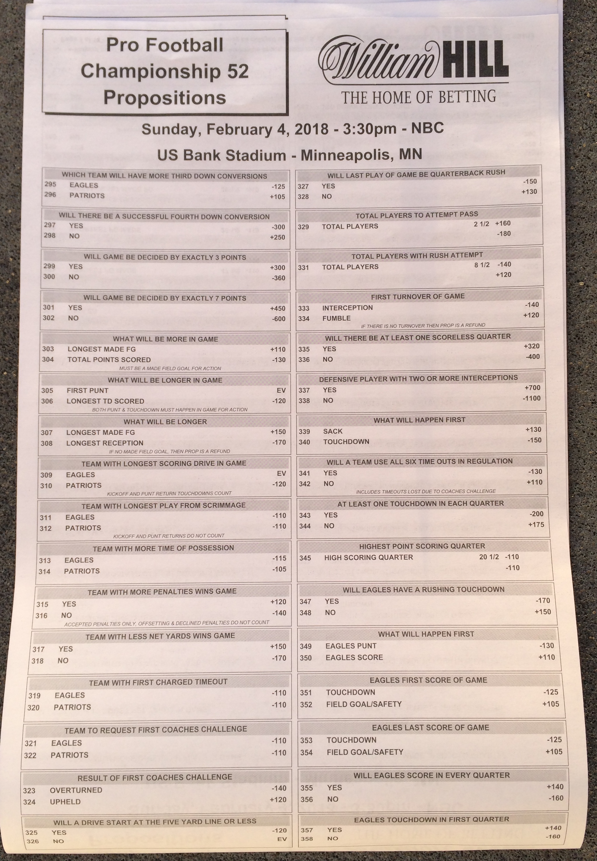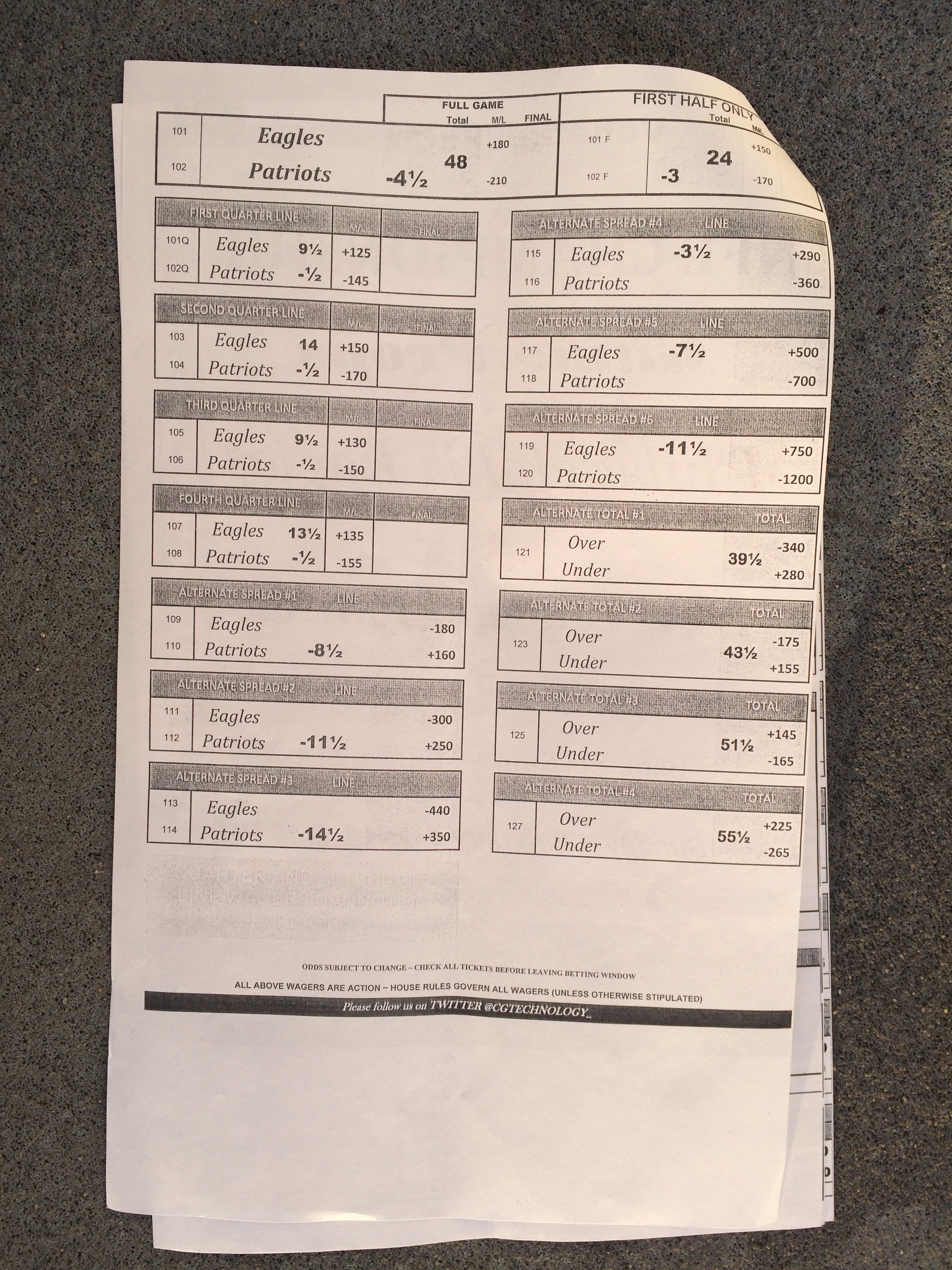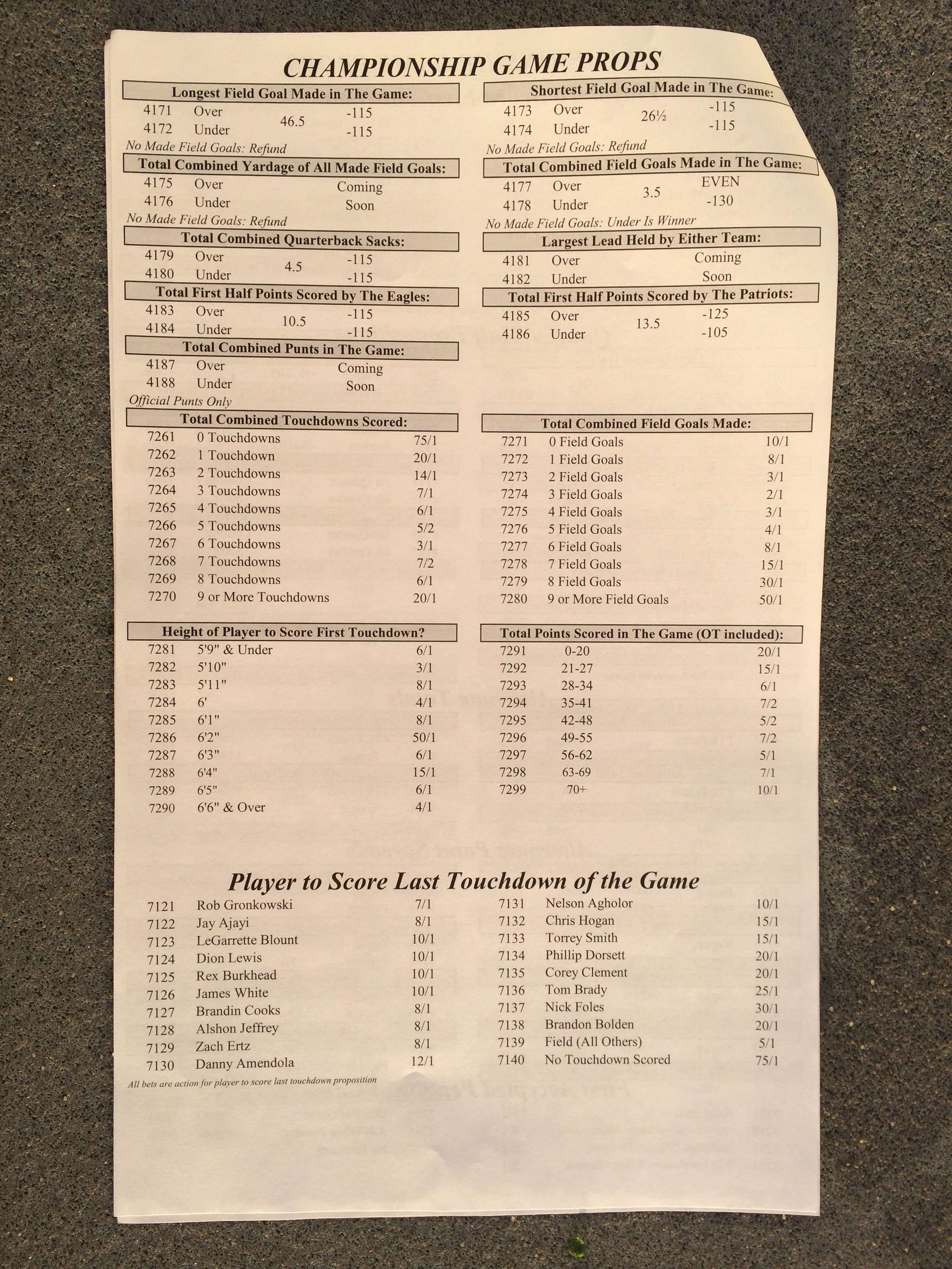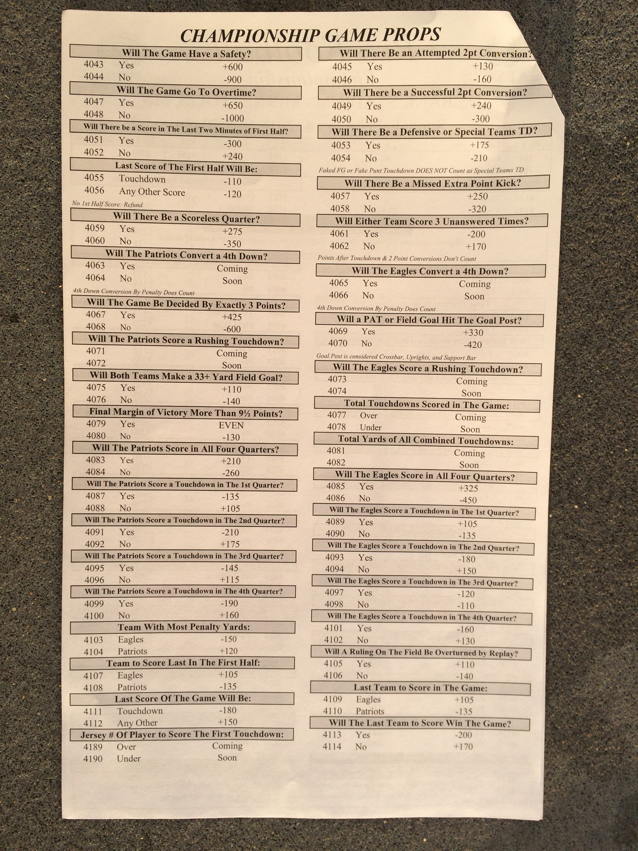 लास वेगास के कई खेल बुक फ़ैमिली में प्रस्तावित दांवों के हर पृष्ठ की तस्वीरें नीचे दी गई हैं। ये शीट्स 27 जनवरी, 2018 को, खेल से आठ दिन पहले, एकत्र की गई थीं।