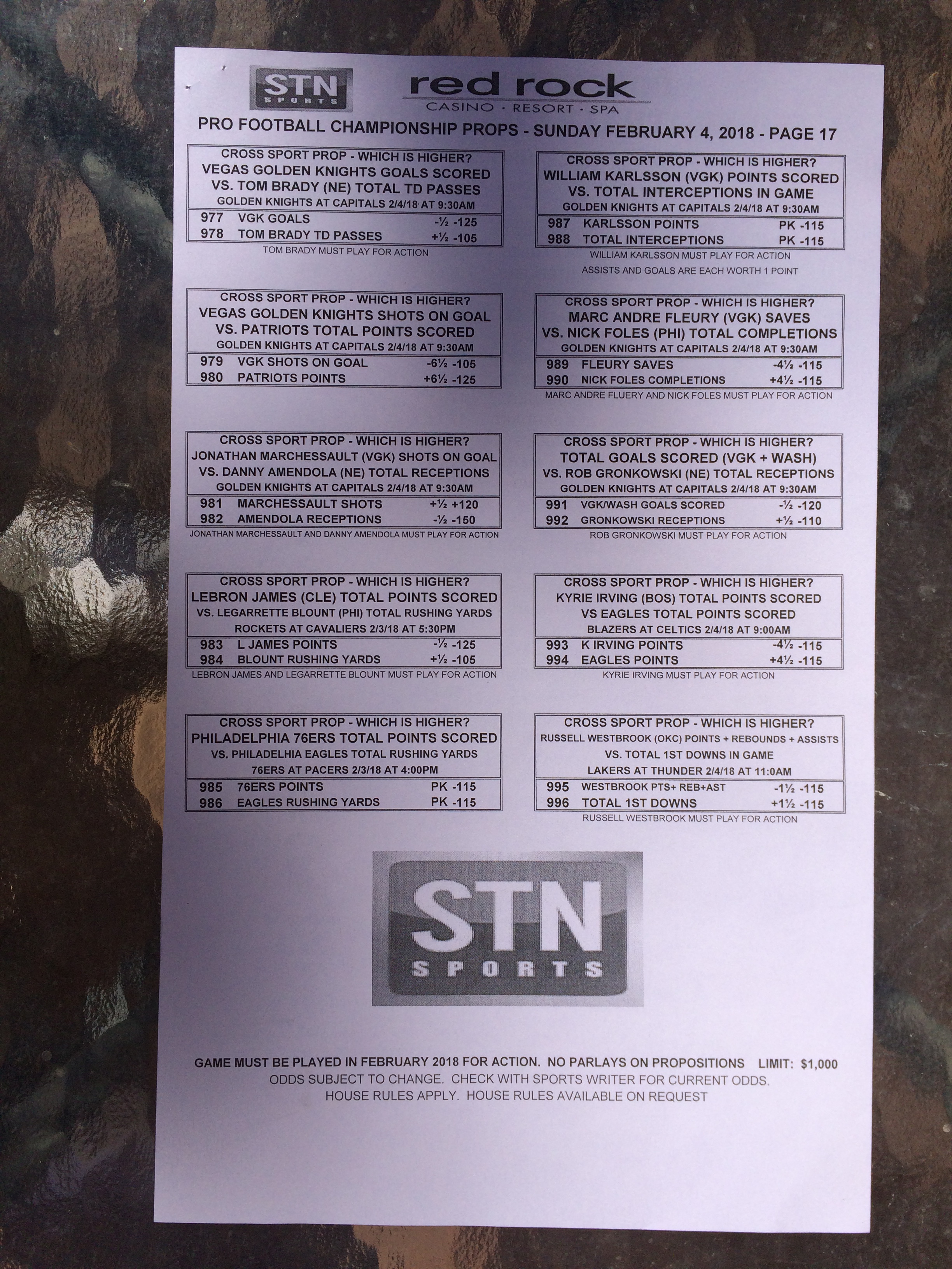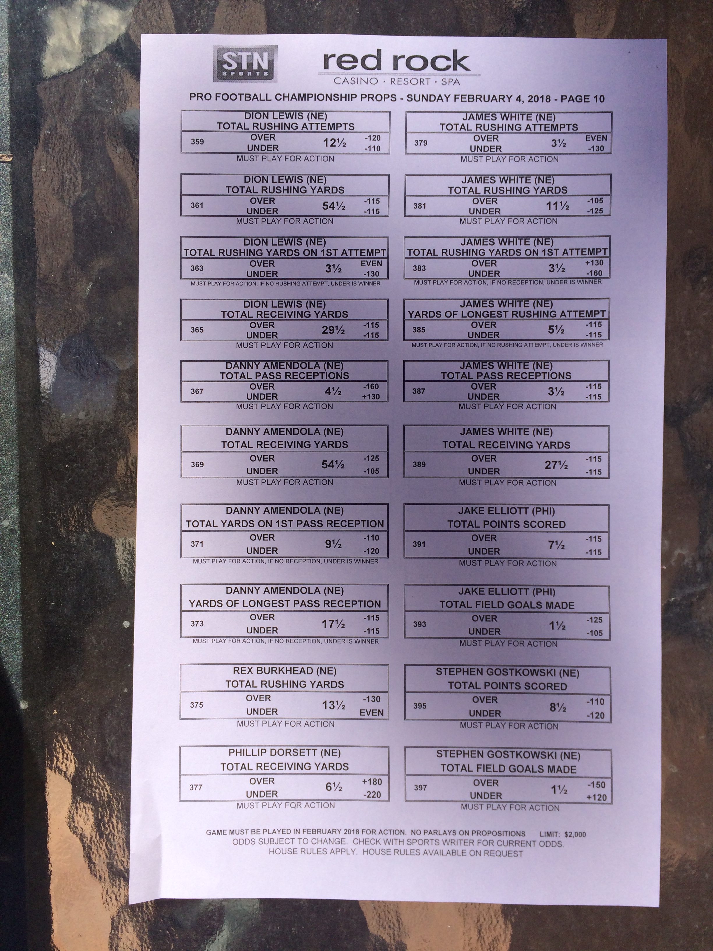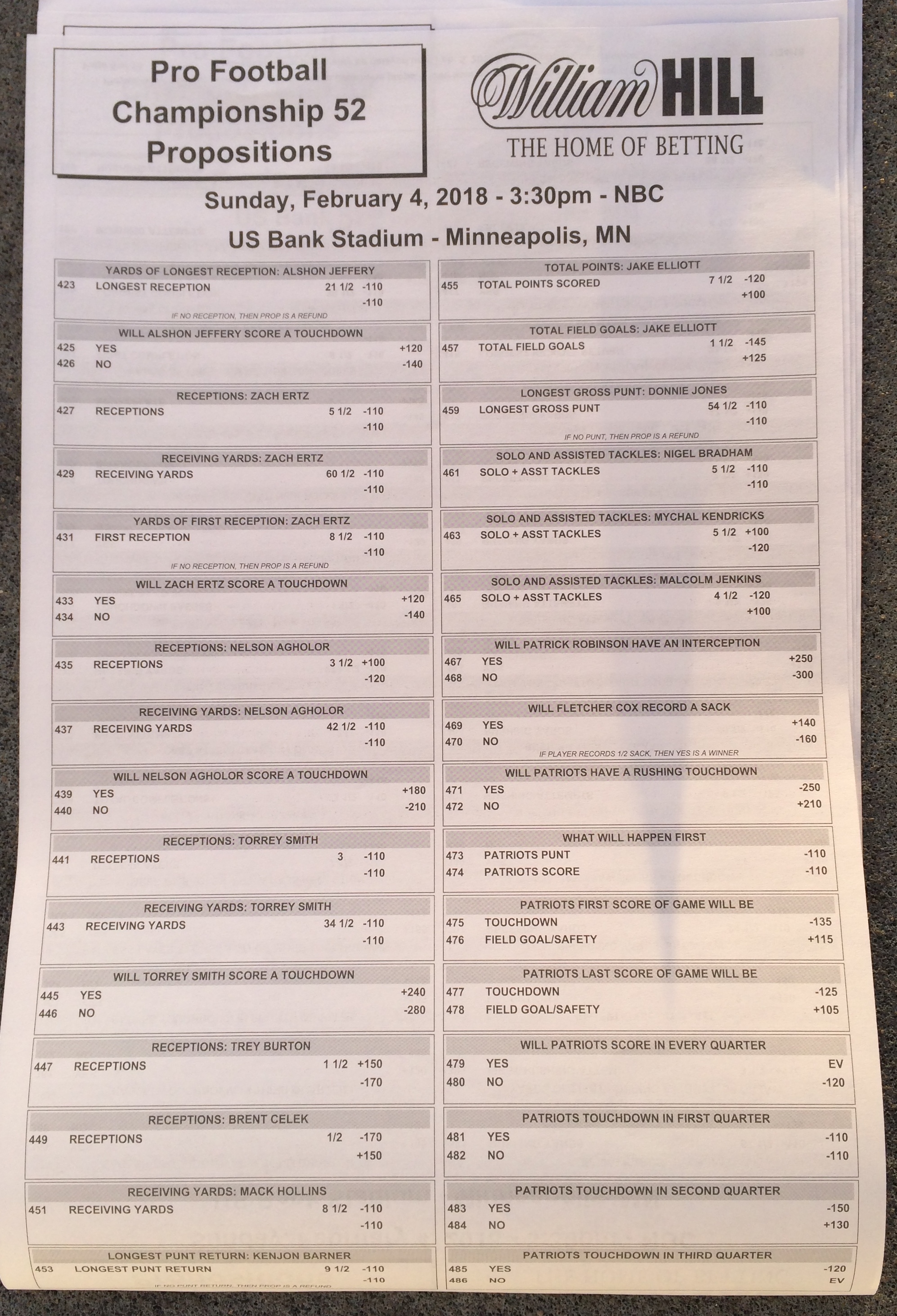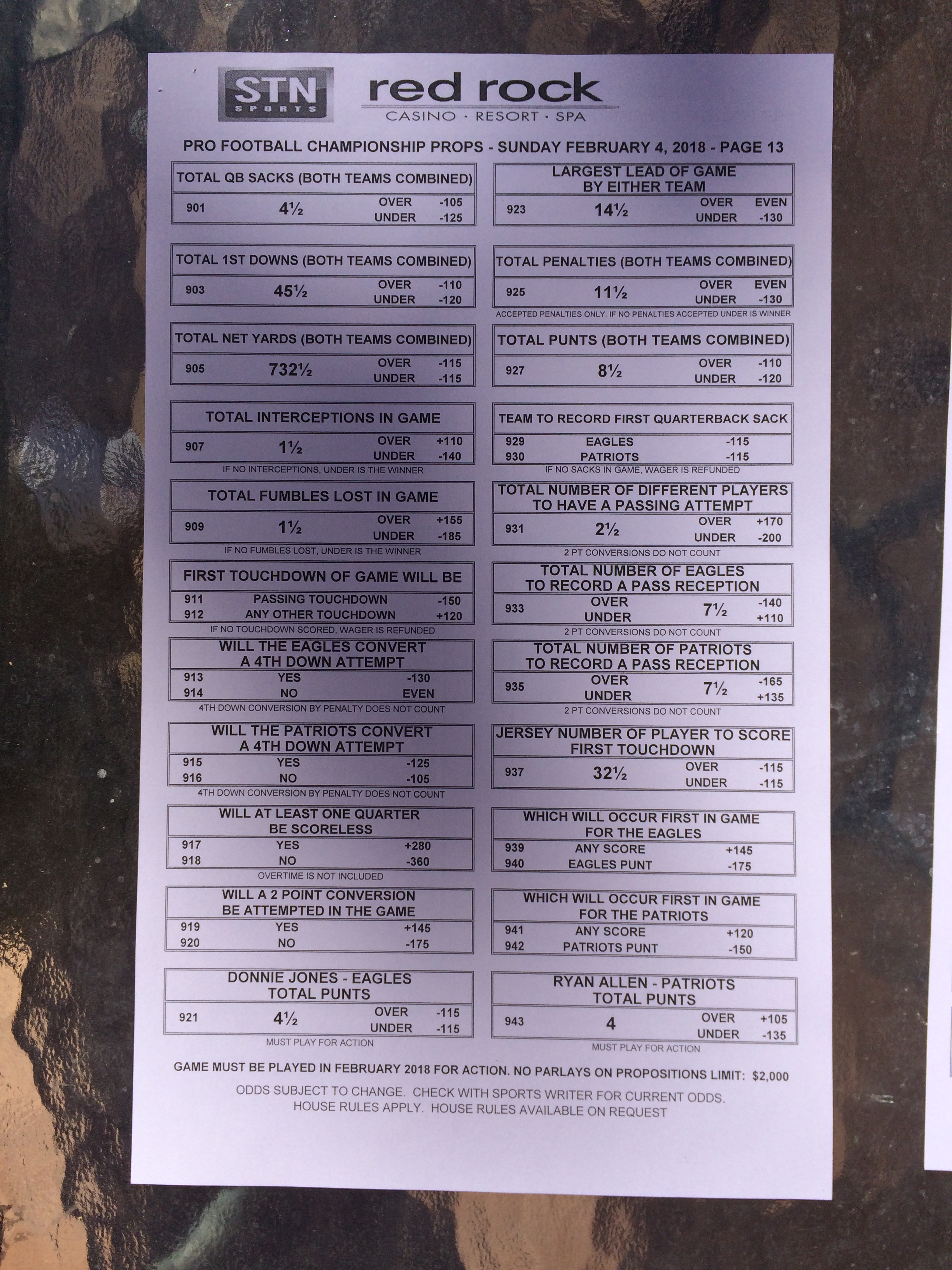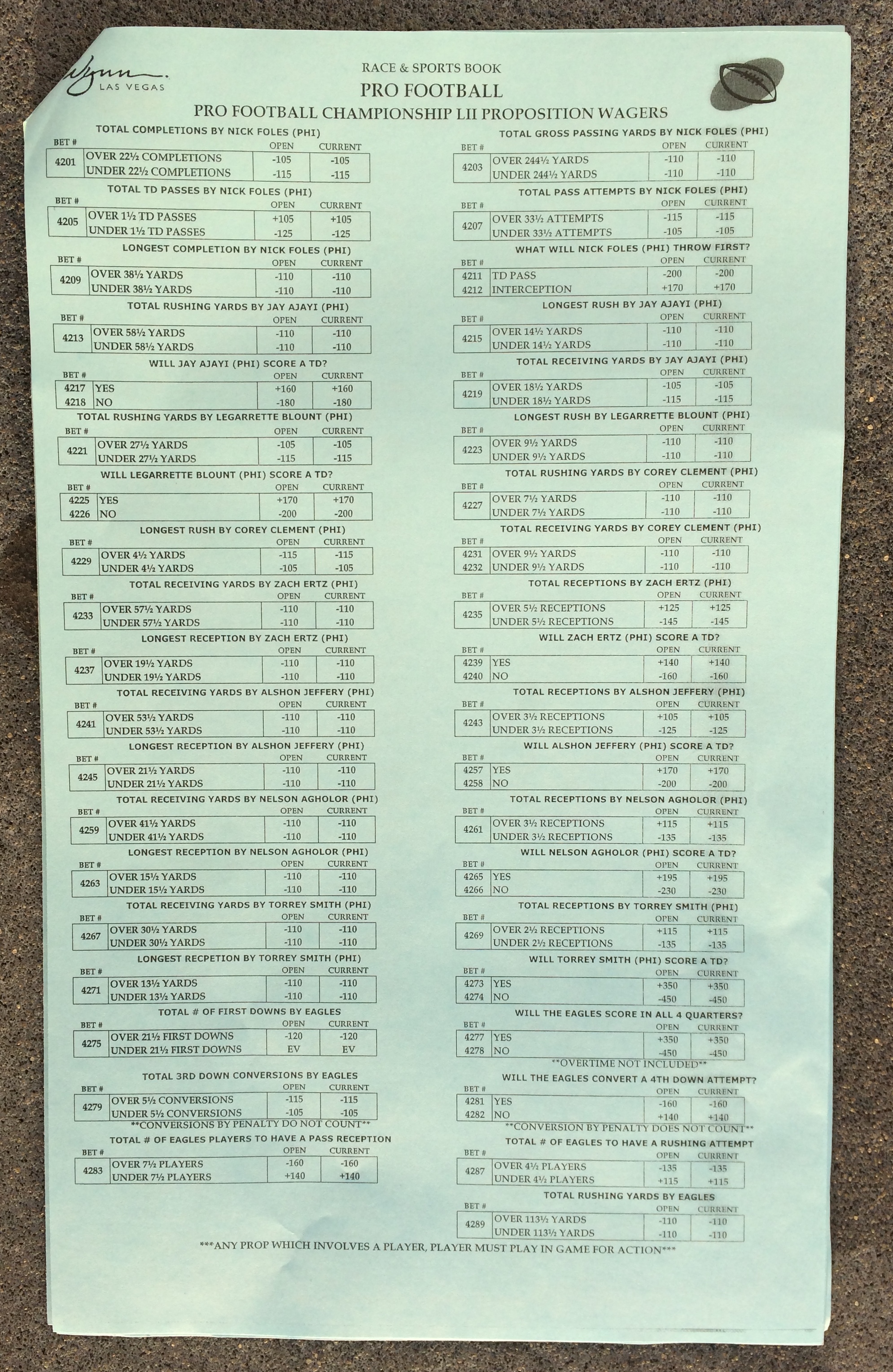 लास वेगास के कई खेल बुक फ़ैमिली में प्रस्तावित दांवों के हर पृष्ठ की तस्वीरें नीचे दी गई हैं। ये शीट्स 27 जनवरी, 2018 को, खेल से आठ दिन पहले, एकत्र की गई थीं।