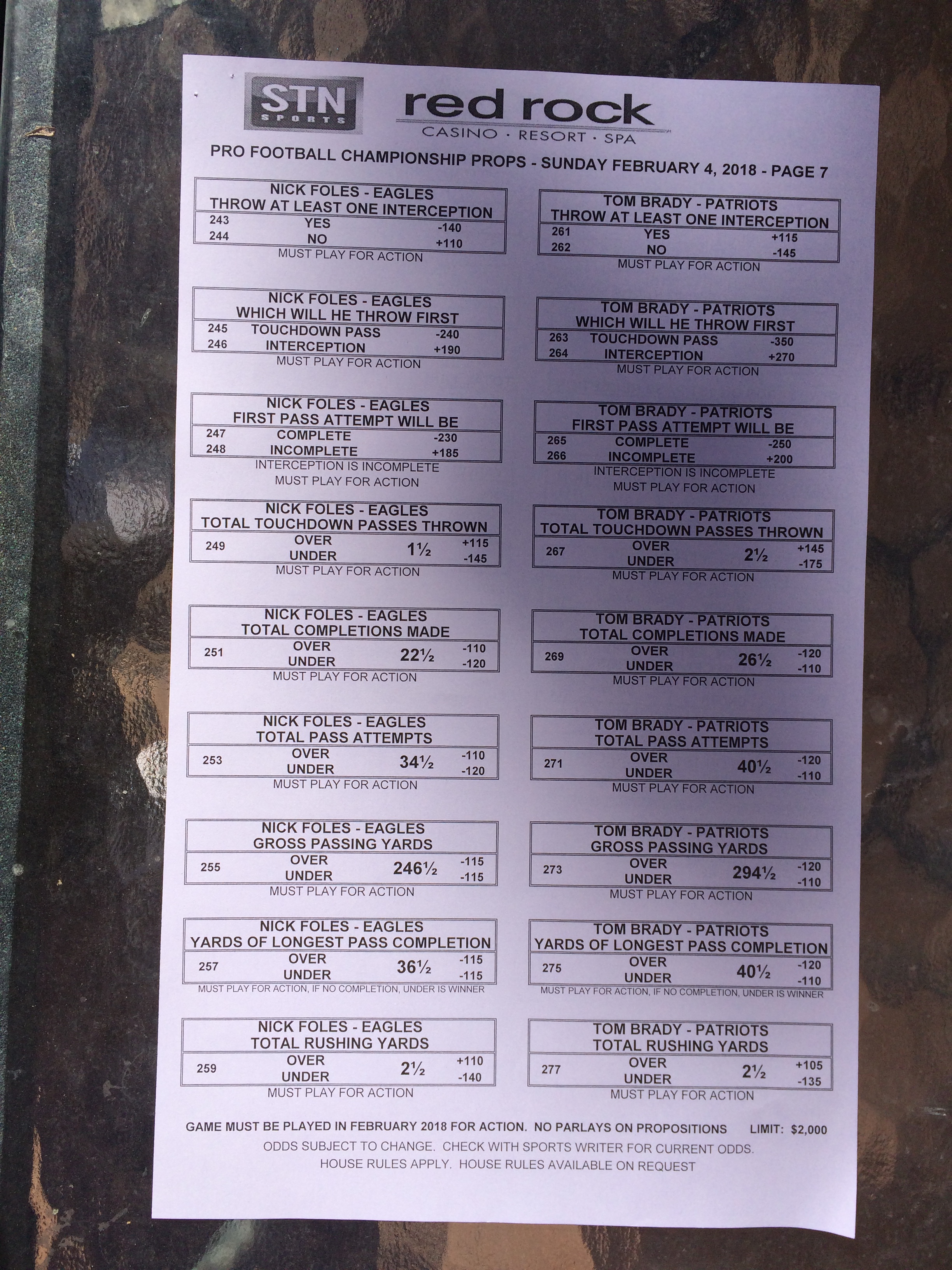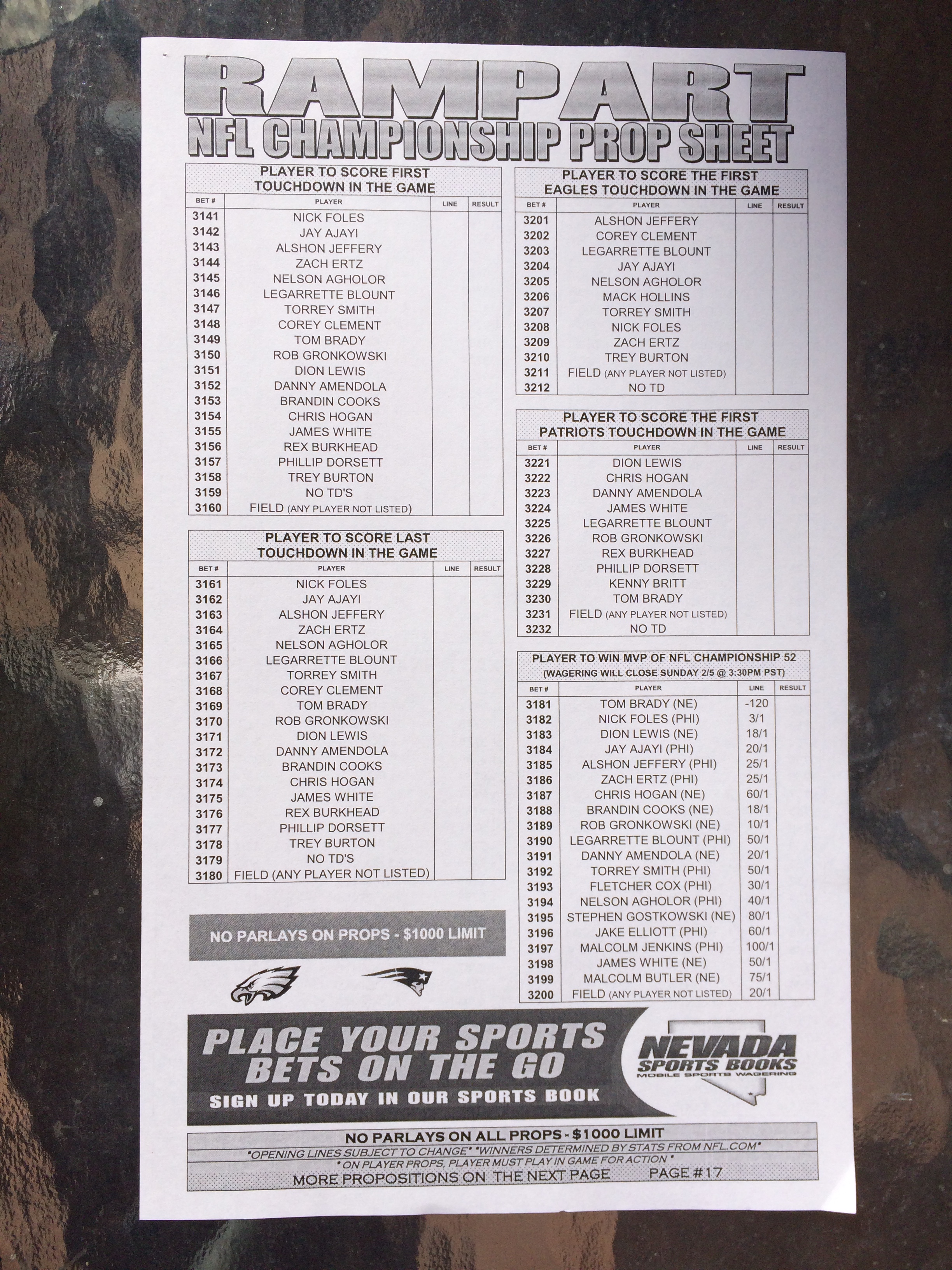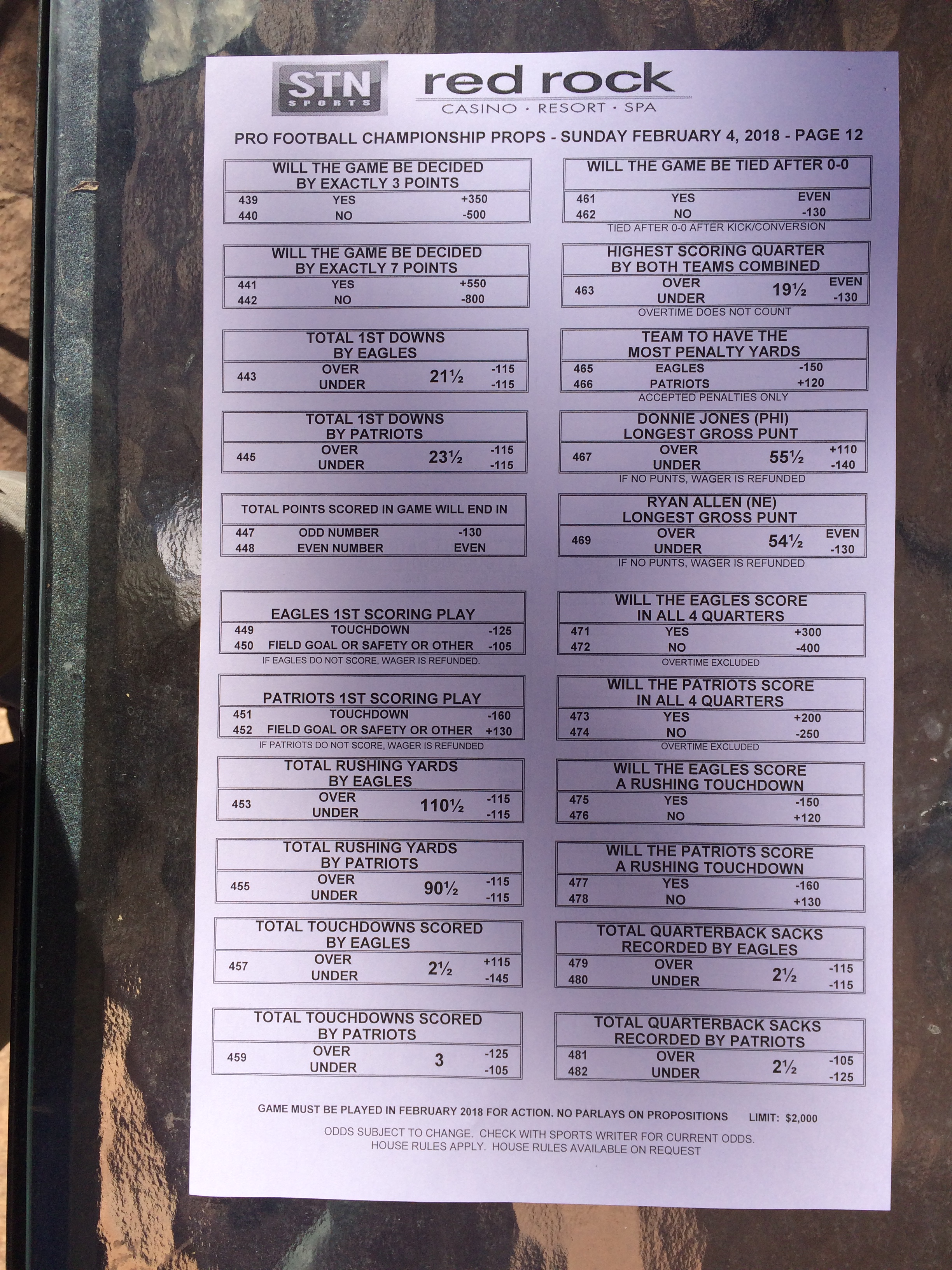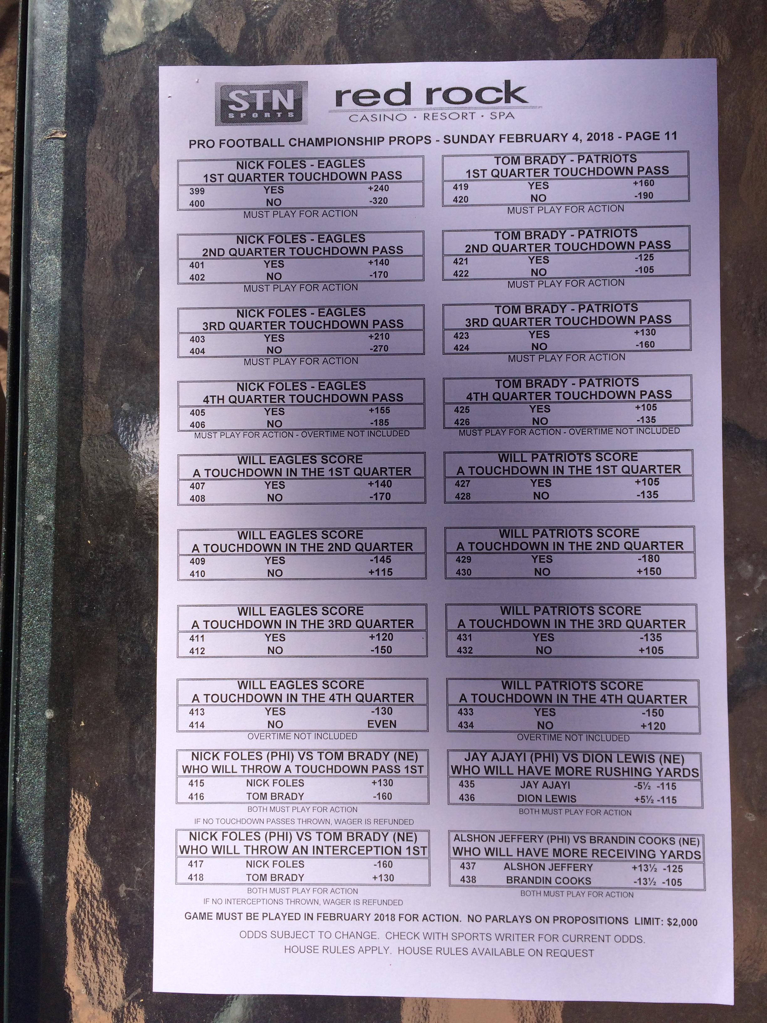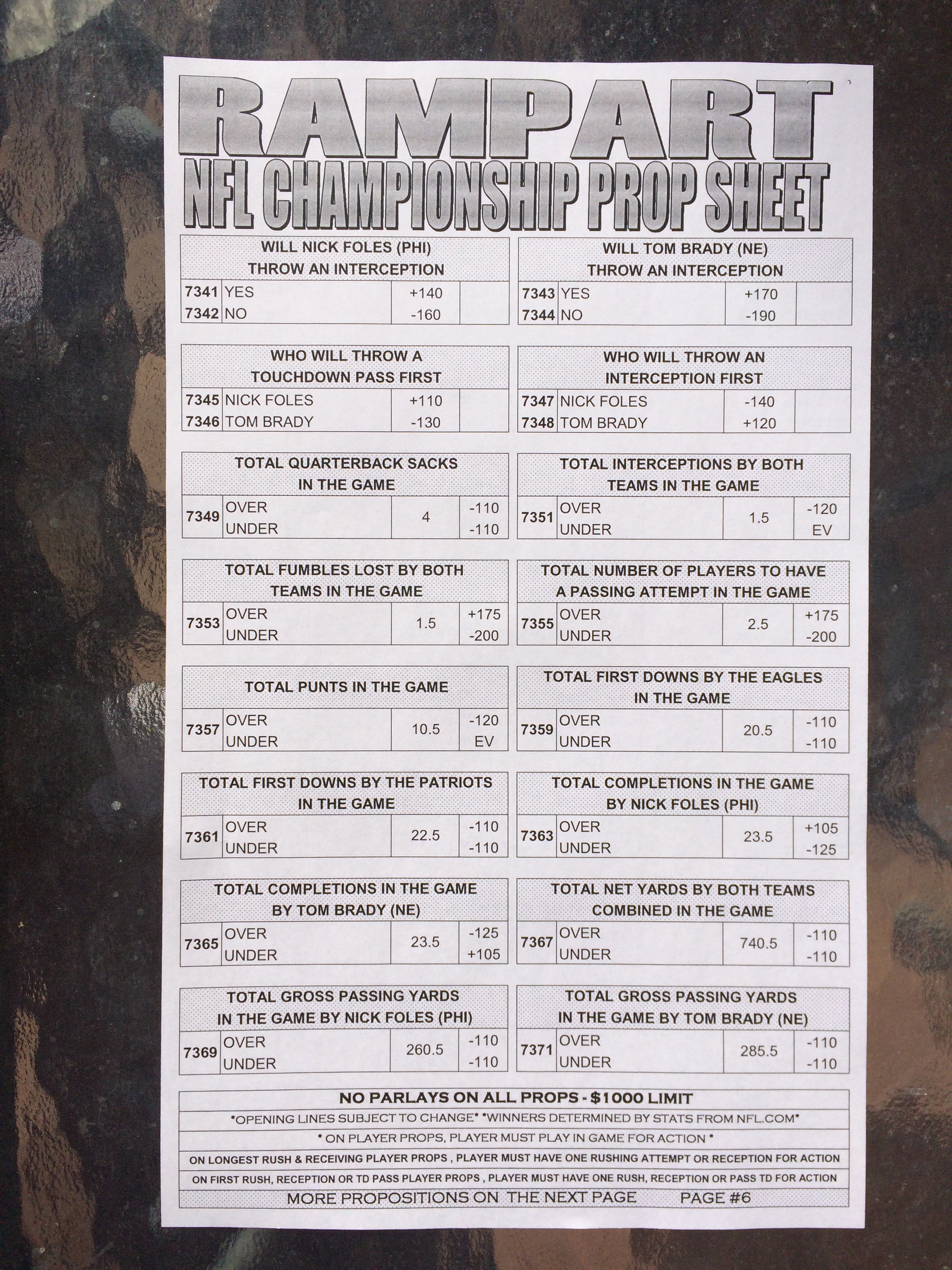 लास वेगास के कई खेल बुक फ़ैमिली में प्रस्तावित दांवों के हर पृष्ठ की तस्वीरें नीचे दी गई हैं। ये शीट्स 27 जनवरी, 2018 को, खेल से आठ दिन पहले, एकत्र की गई थीं।