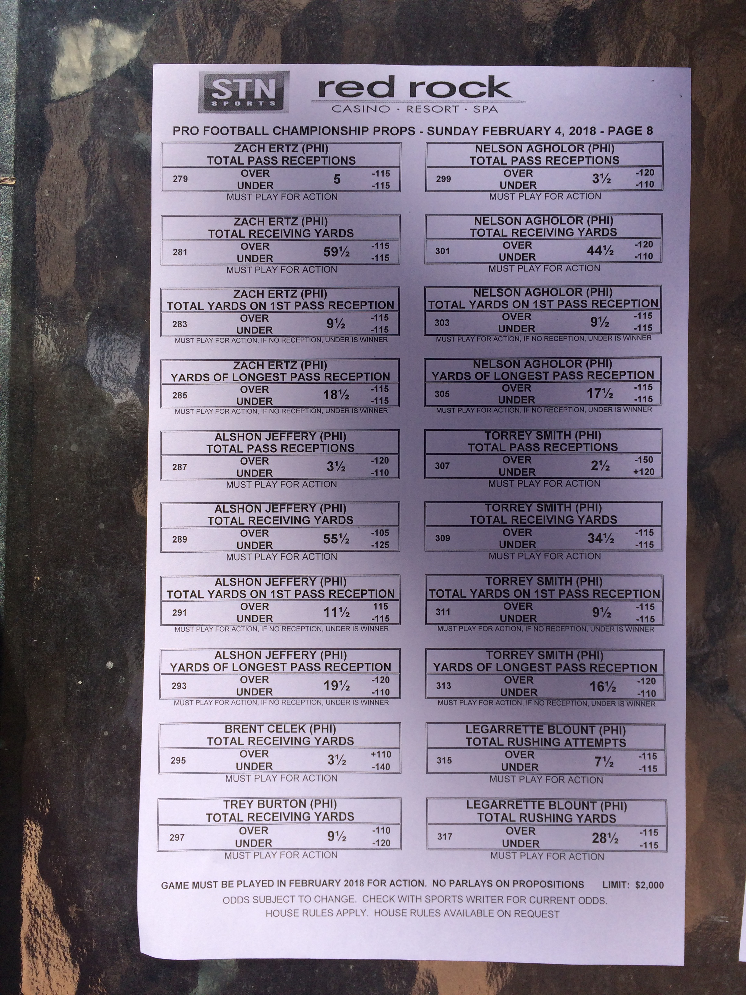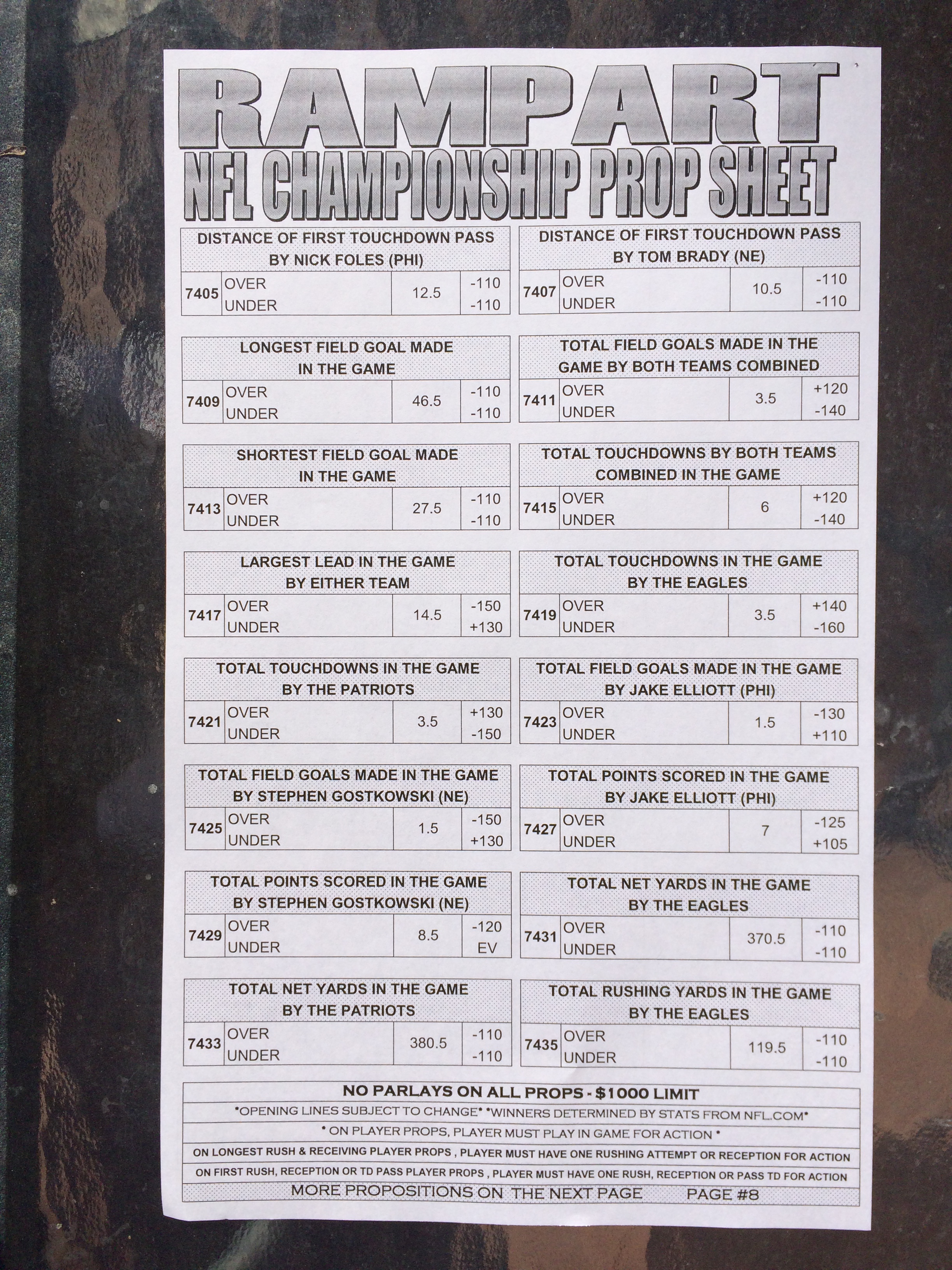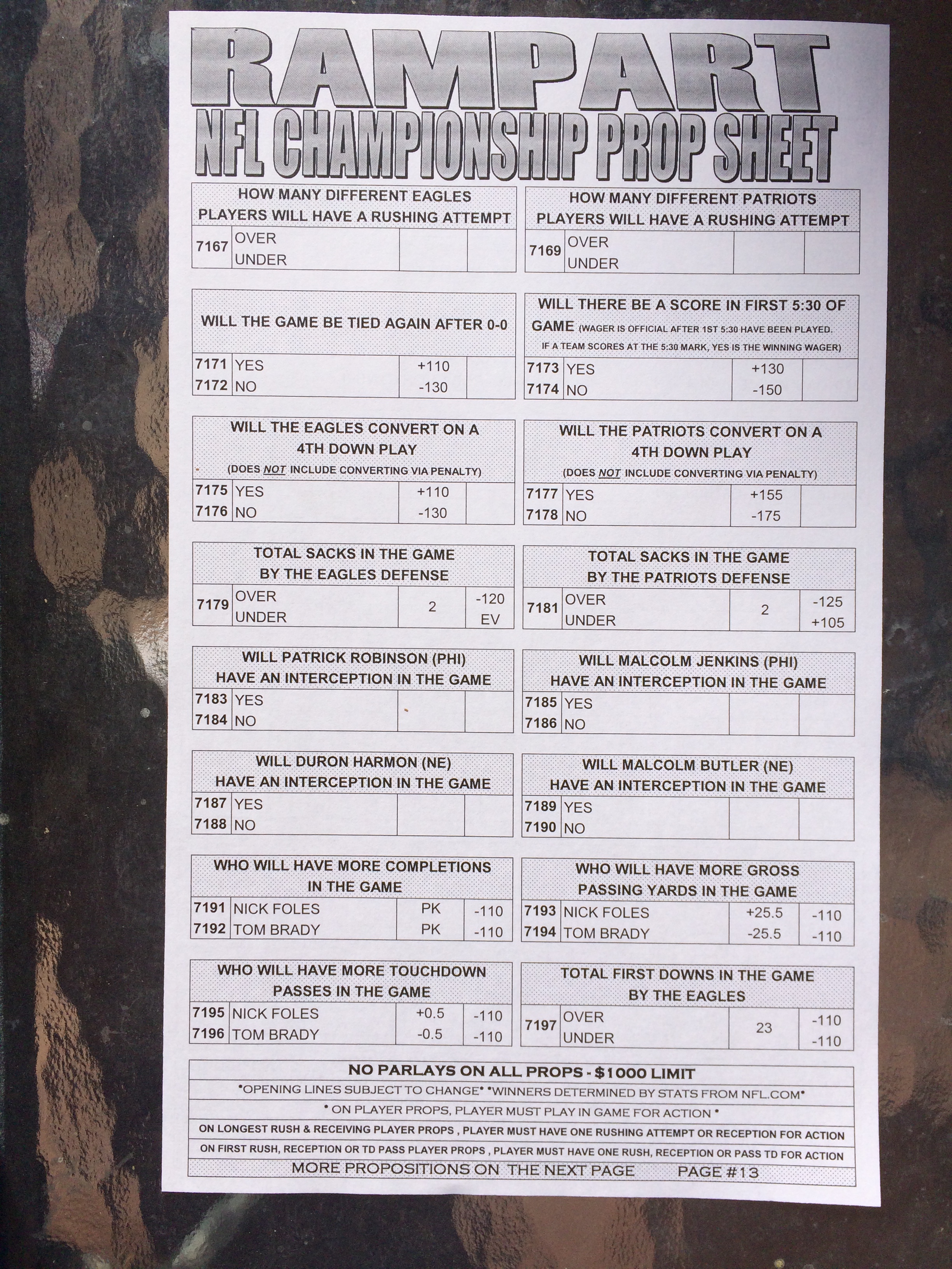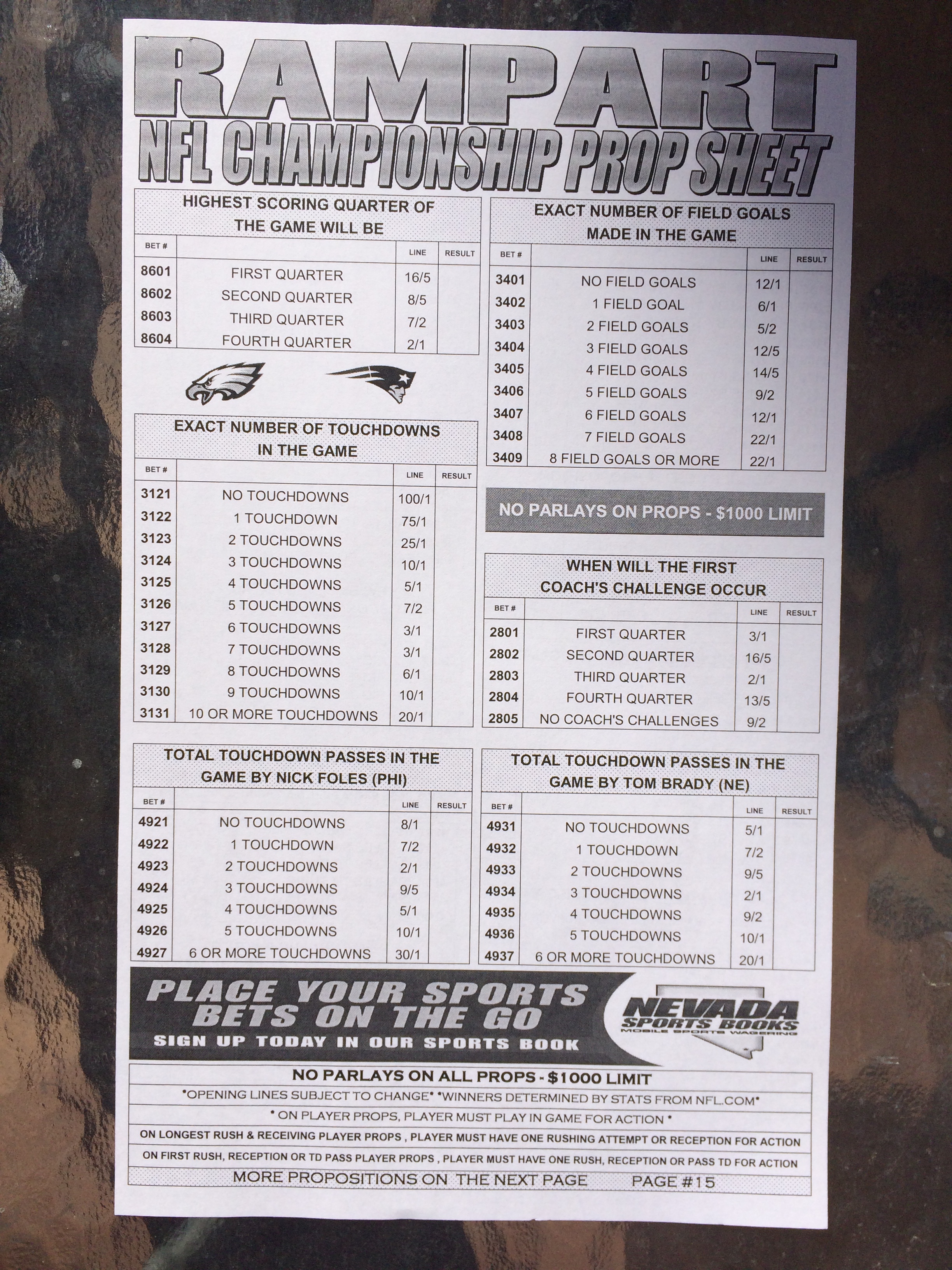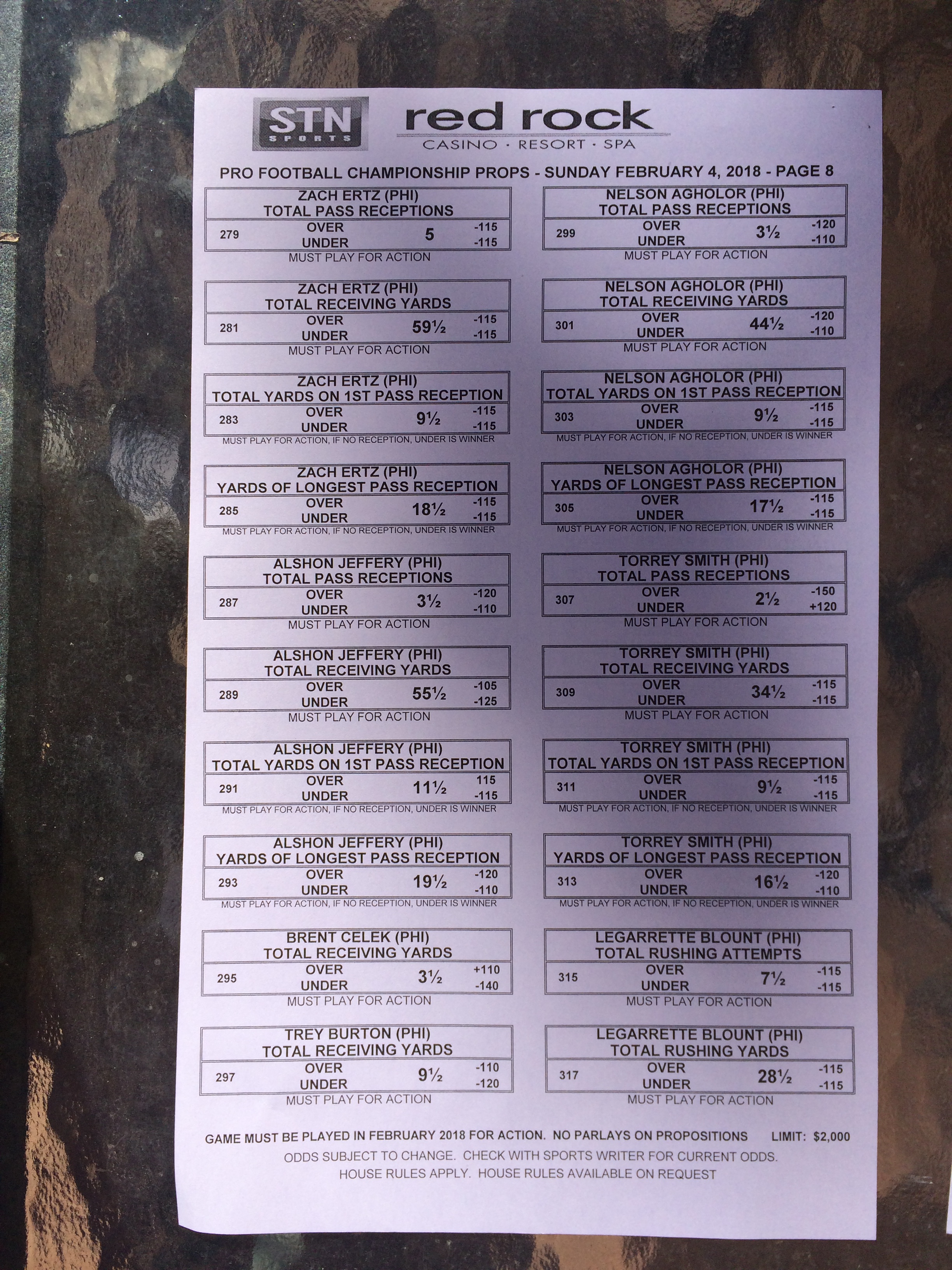 लास वेगास के कई खेल बुक फ़ैमिली में प्रस्तावित दांवों के हर पृष्ठ की तस्वीरें नीचे दी गई हैं। ये शीट्स 27 जनवरी, 2018 को, खेल से आठ दिन पहले, एकत्र की गई थीं।