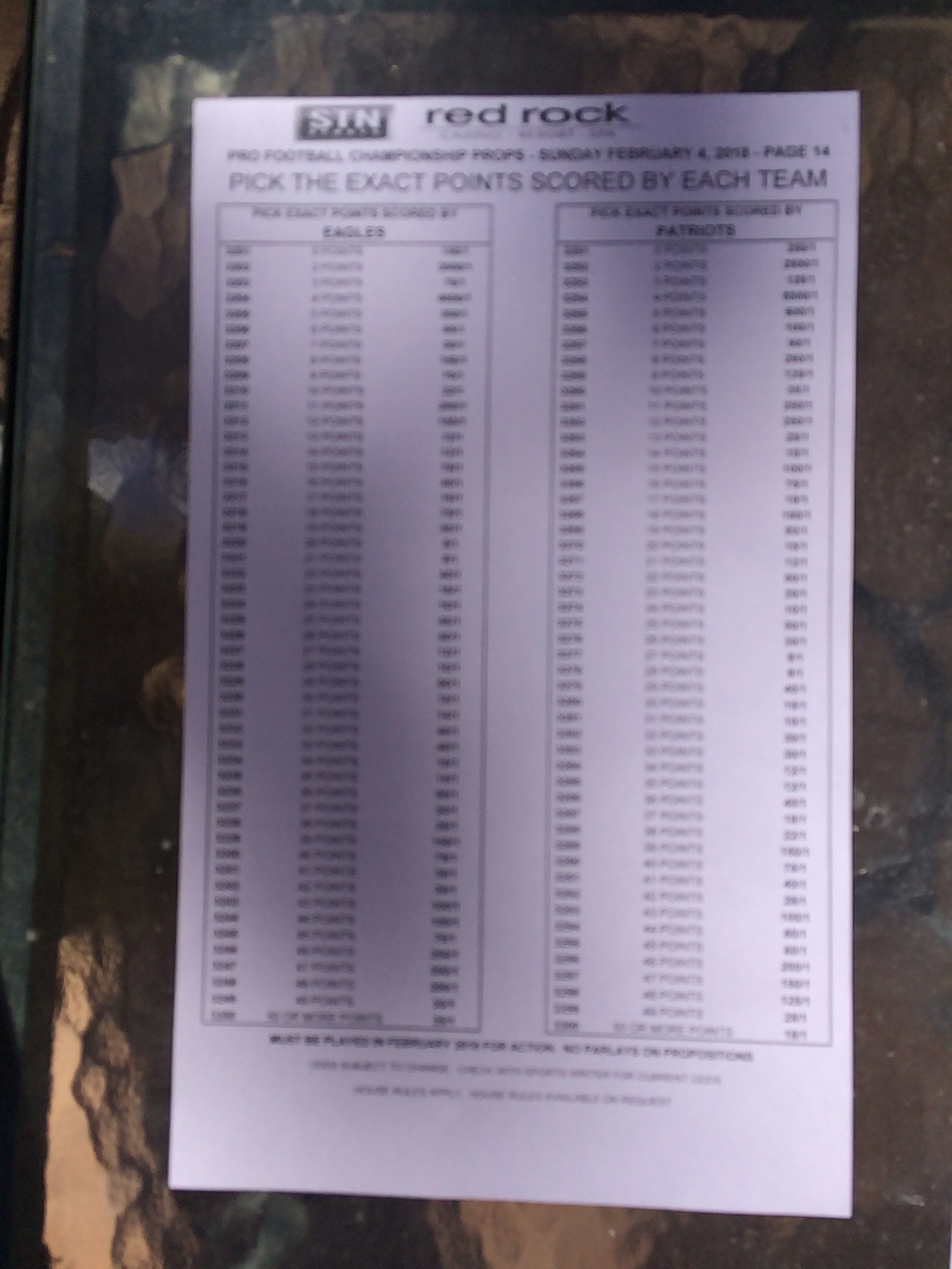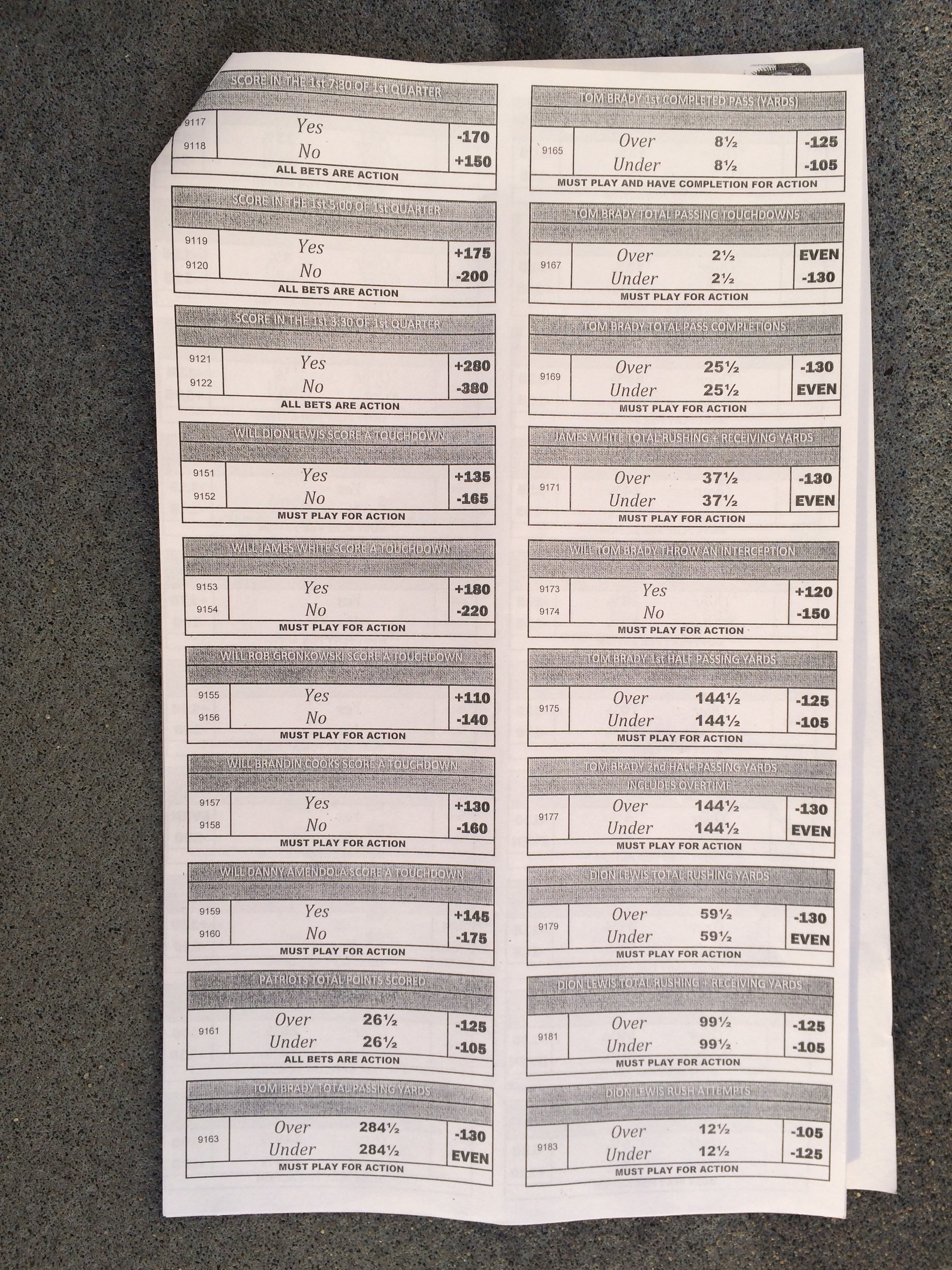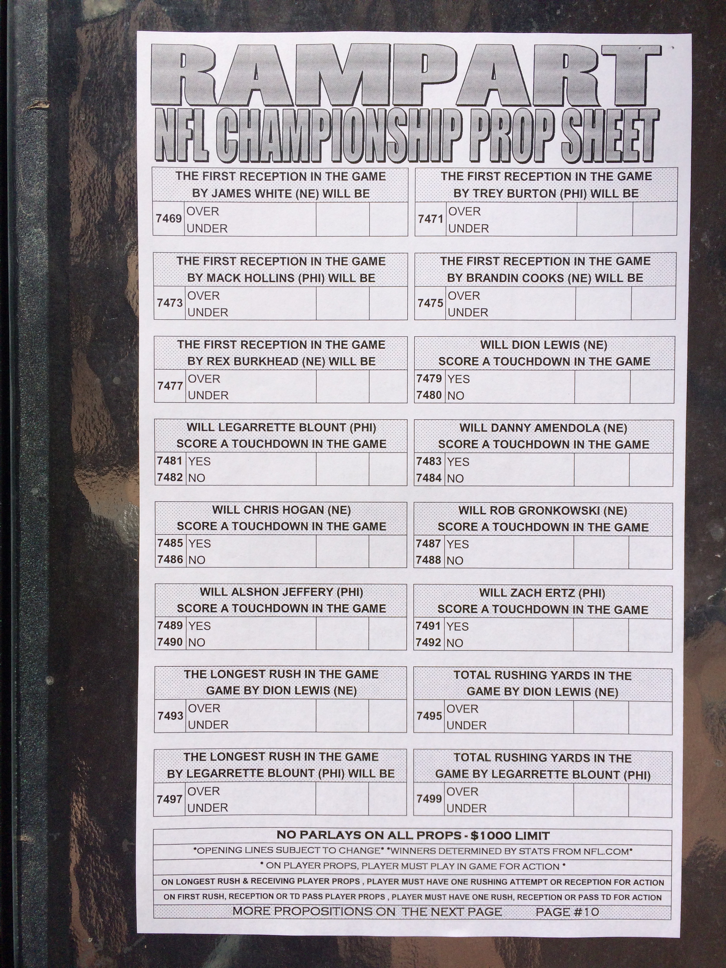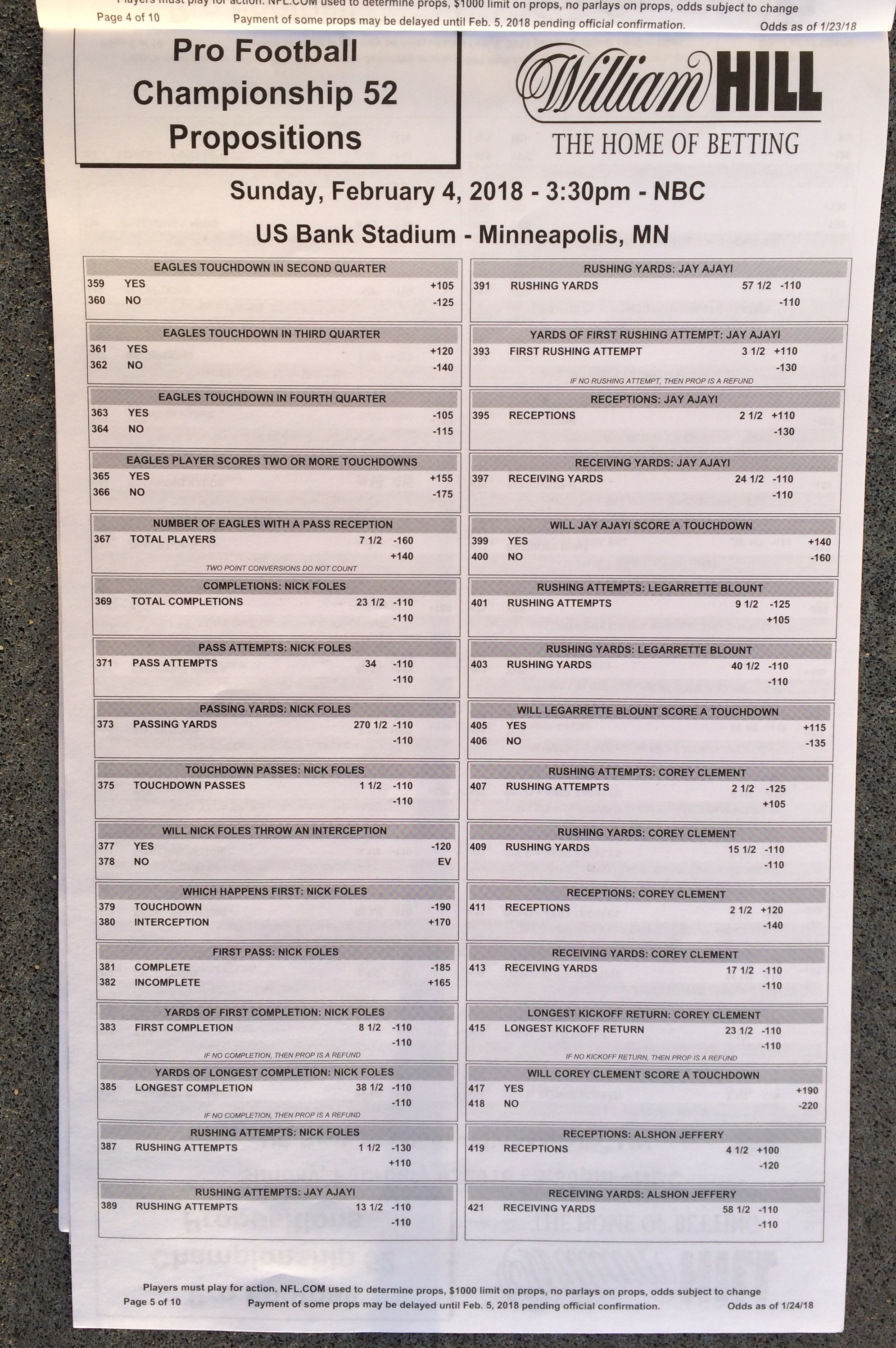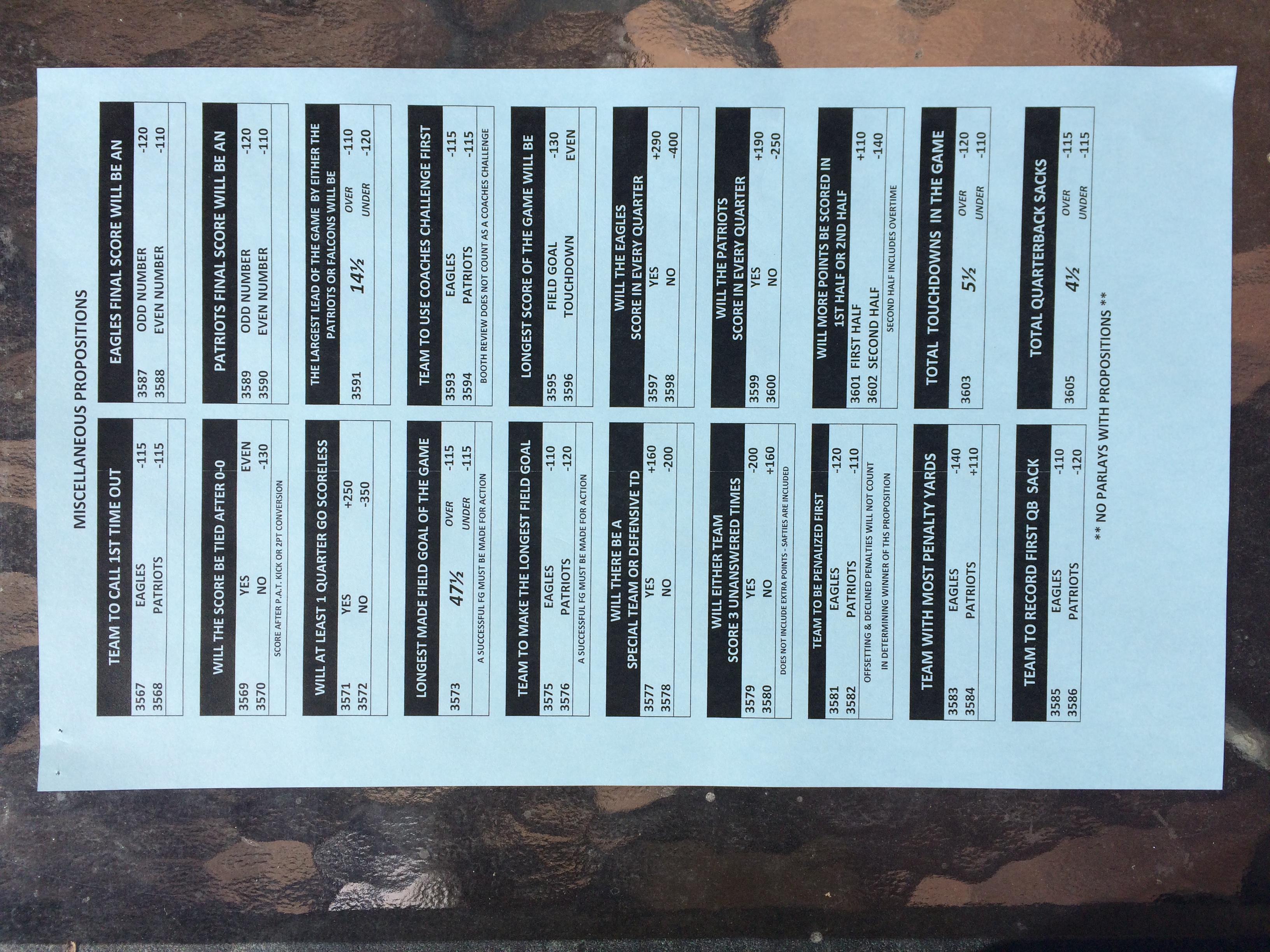 लास वेगास के कई खेल बुक फ़ैमिली में प्रस्तावित दांवों के हर पृष्ठ की तस्वीरें नीचे दी गई हैं। ये शीट्स 27 जनवरी, 2018 को, खेल से आठ दिन पहले, एकत्र की गई थीं।