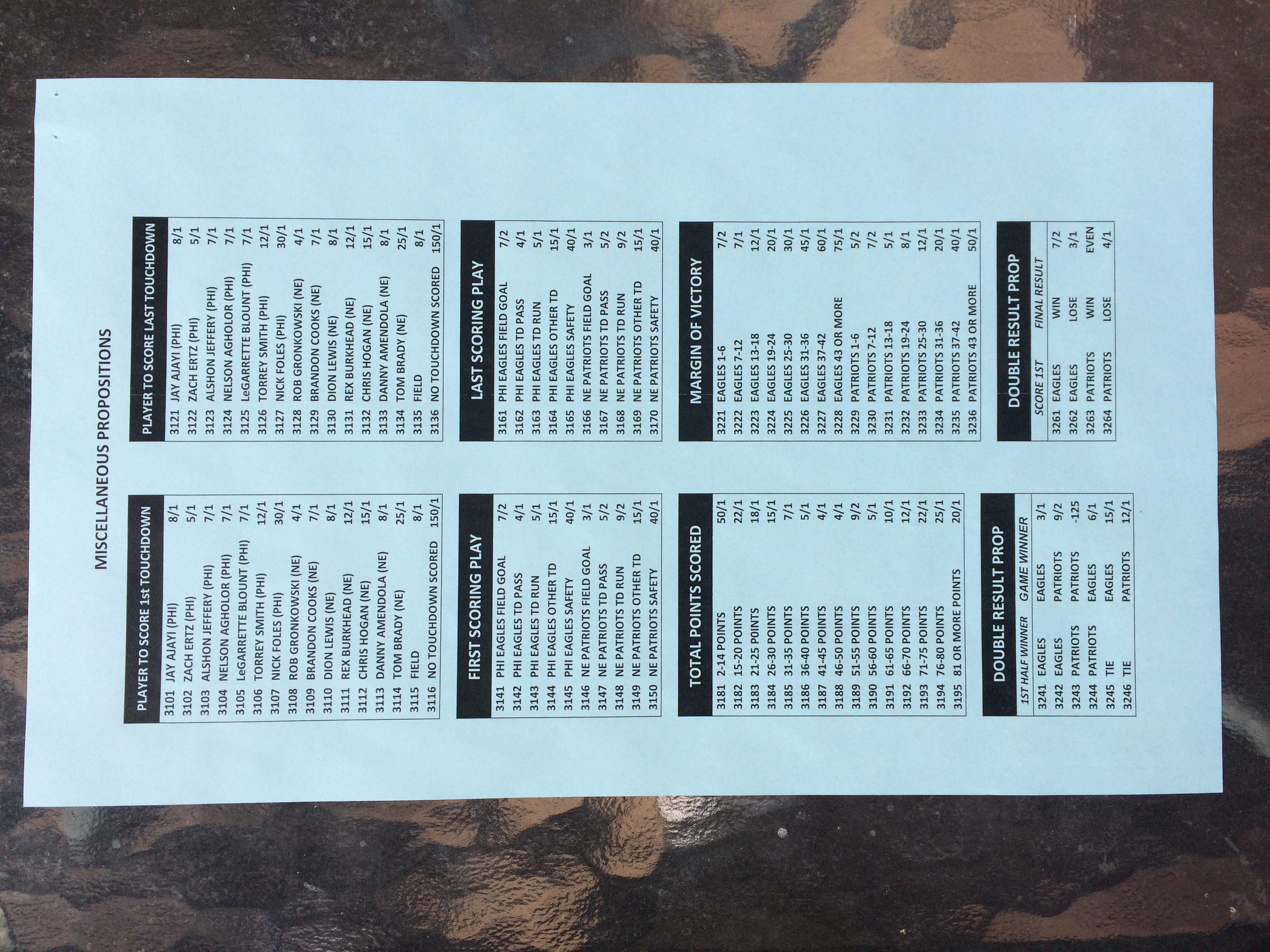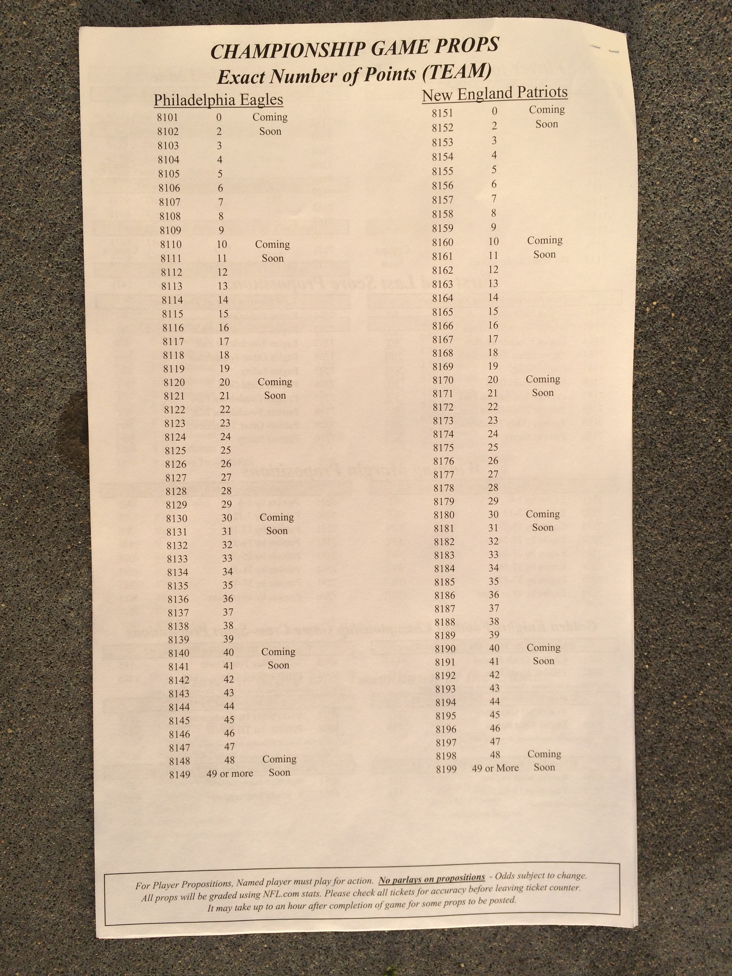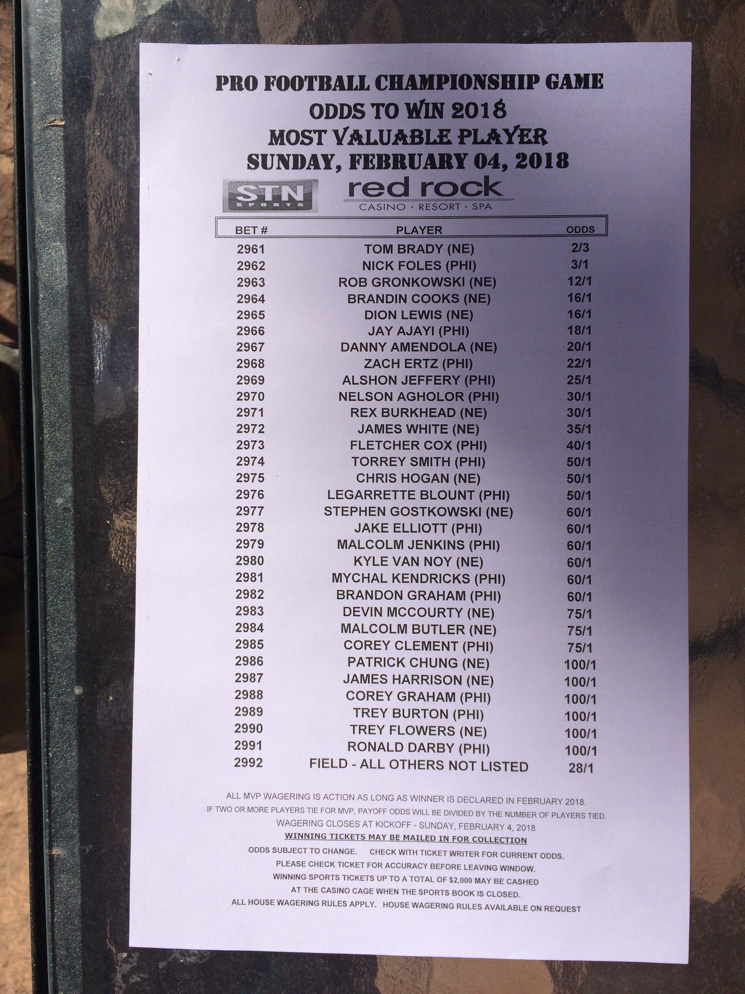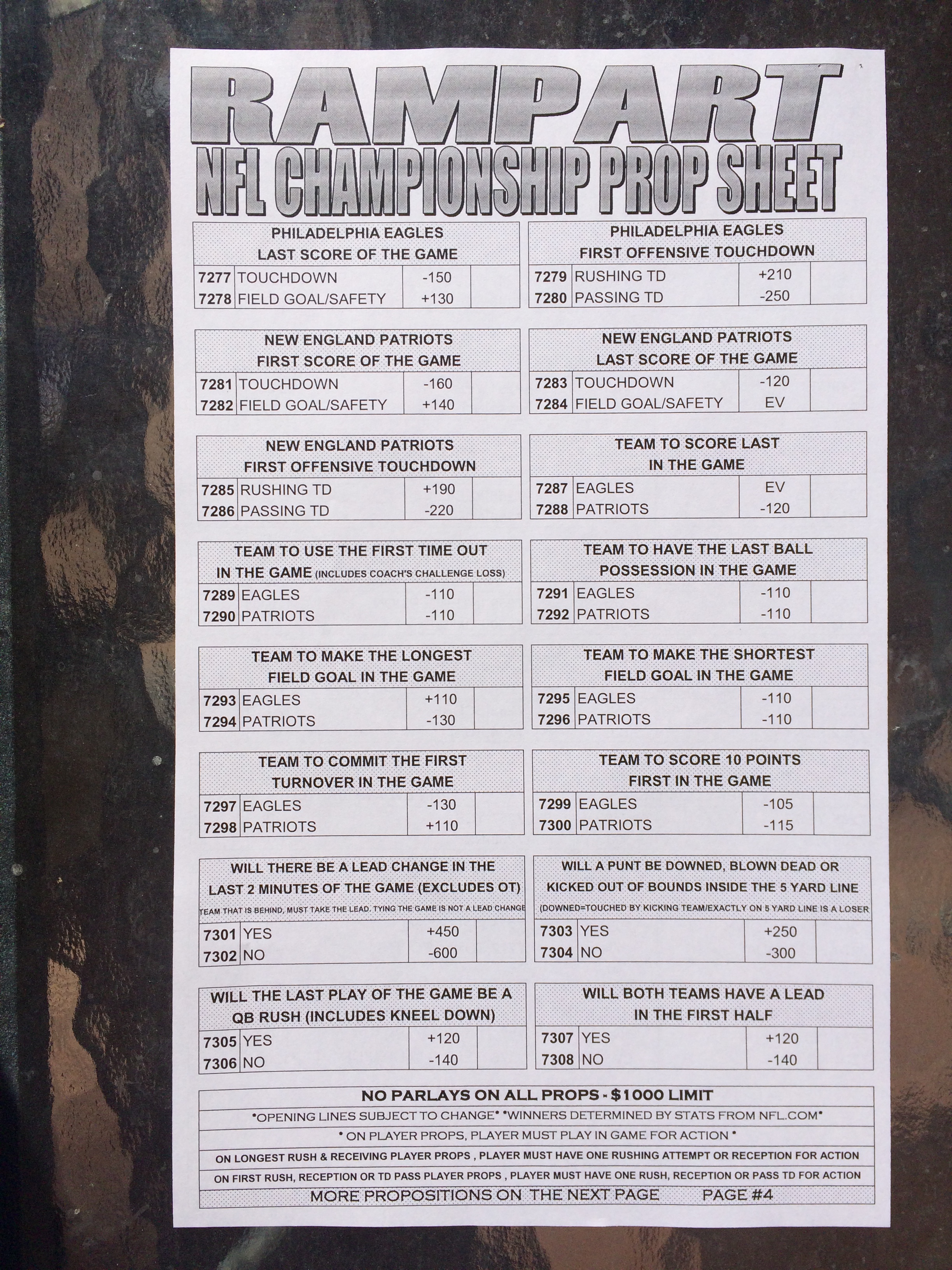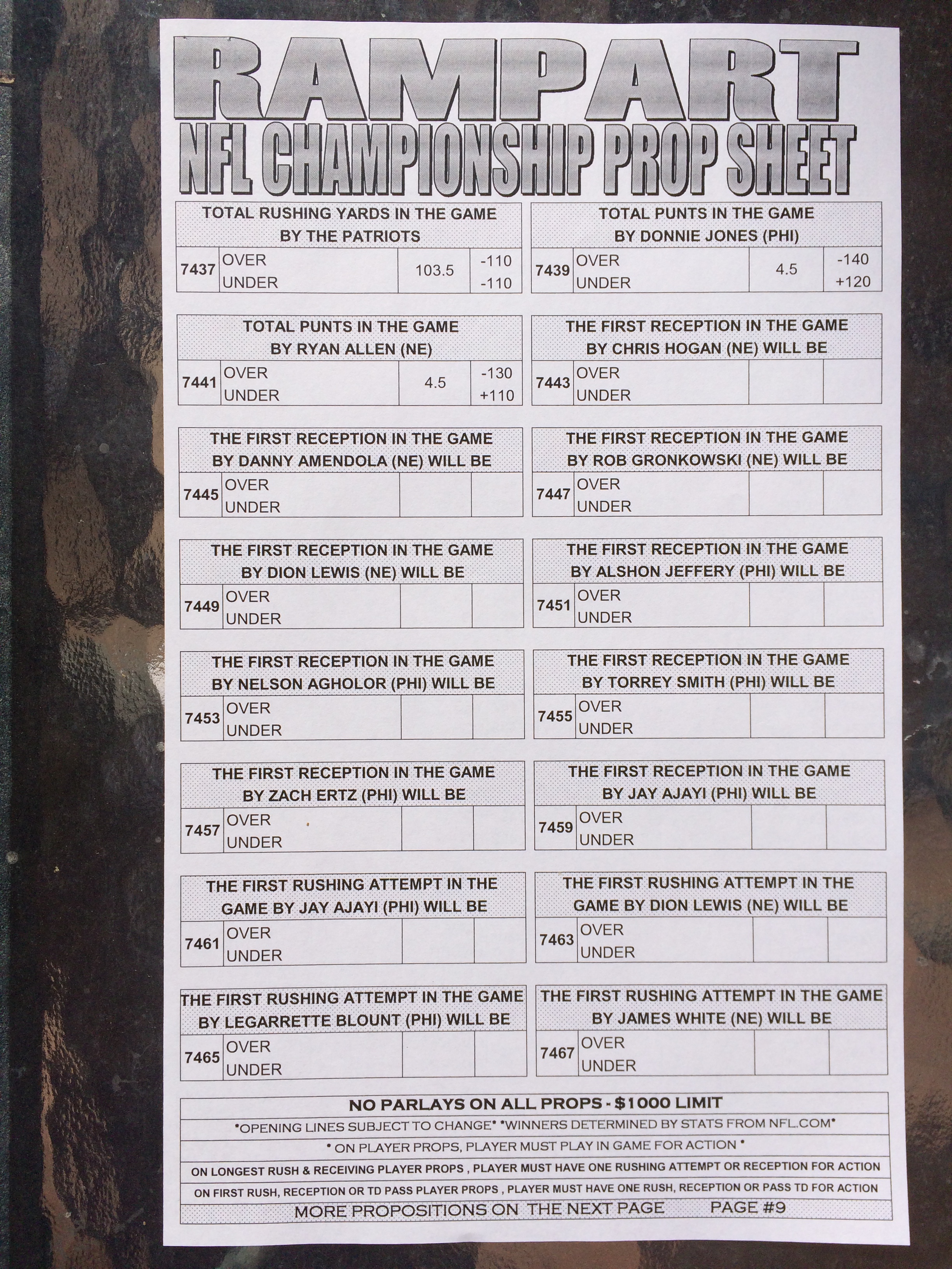 लास वेगास के कई खेल बुक फ़ैमिली में प्रस्तावित दांवों के हर पृष्ठ की तस्वीरें नीचे दी गई हैं। ये शीट्स 27 जनवरी, 2018 को, खेल से आठ दिन पहले, एकत्र की गई थीं।