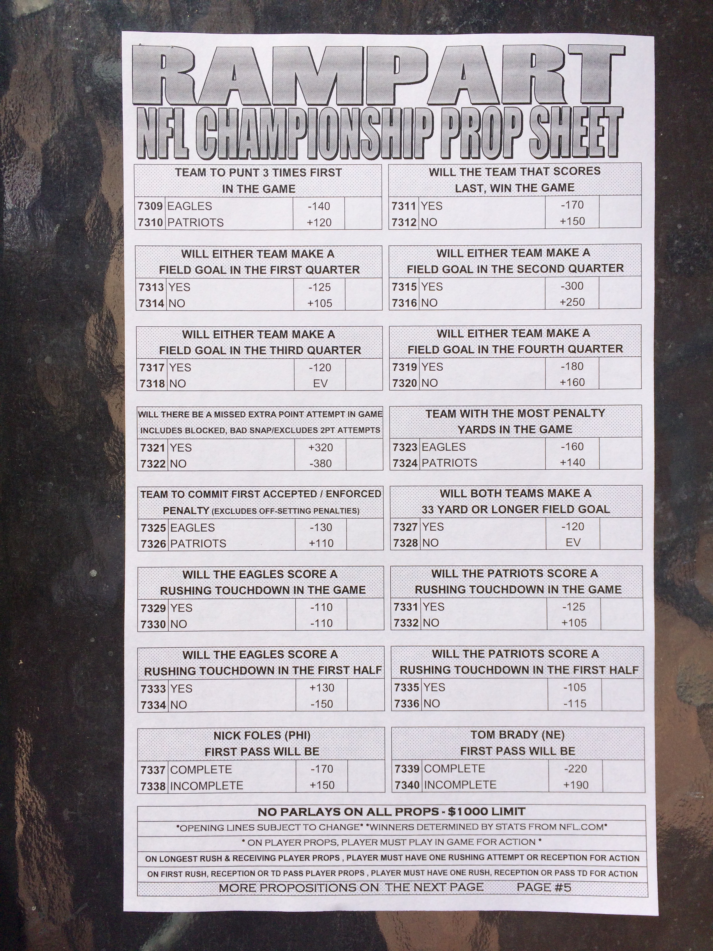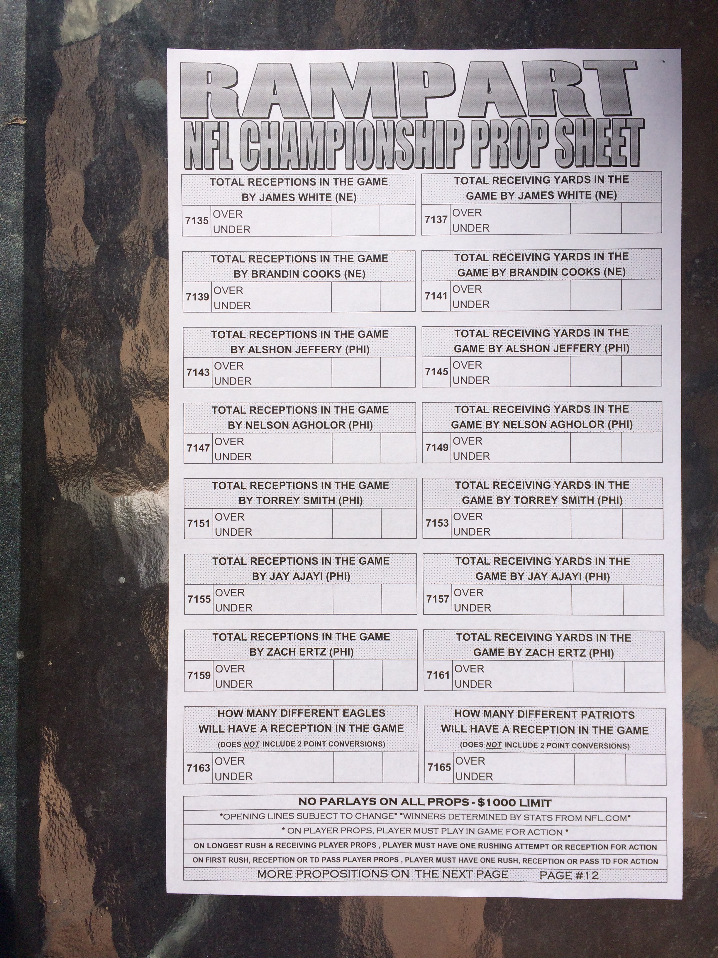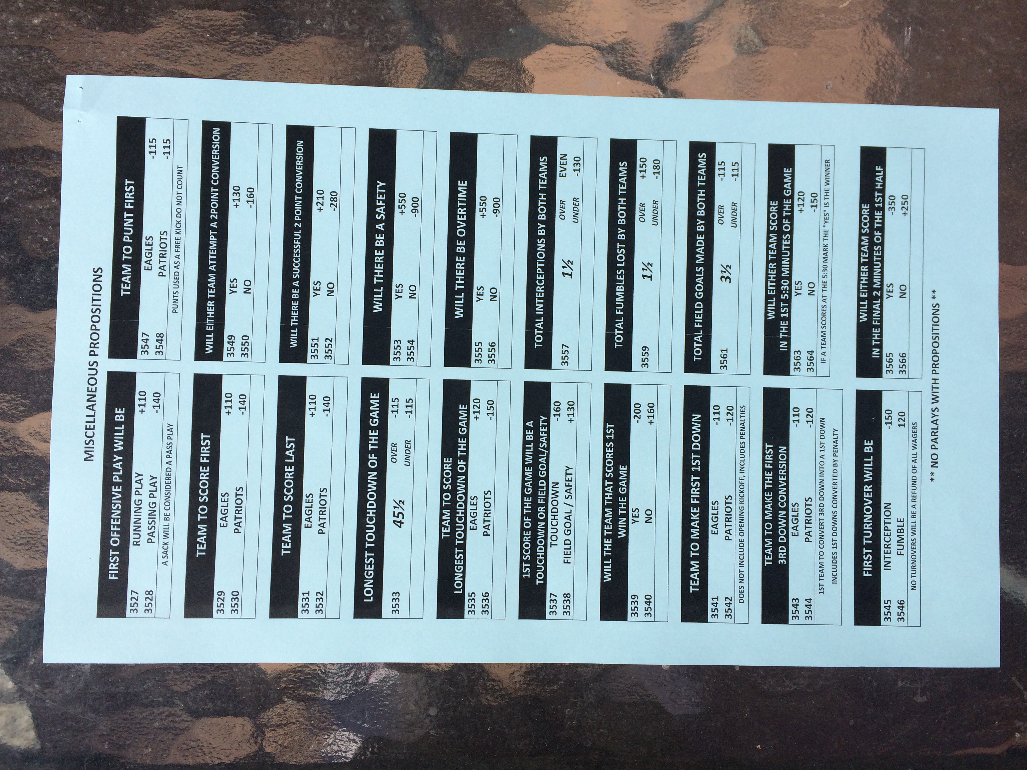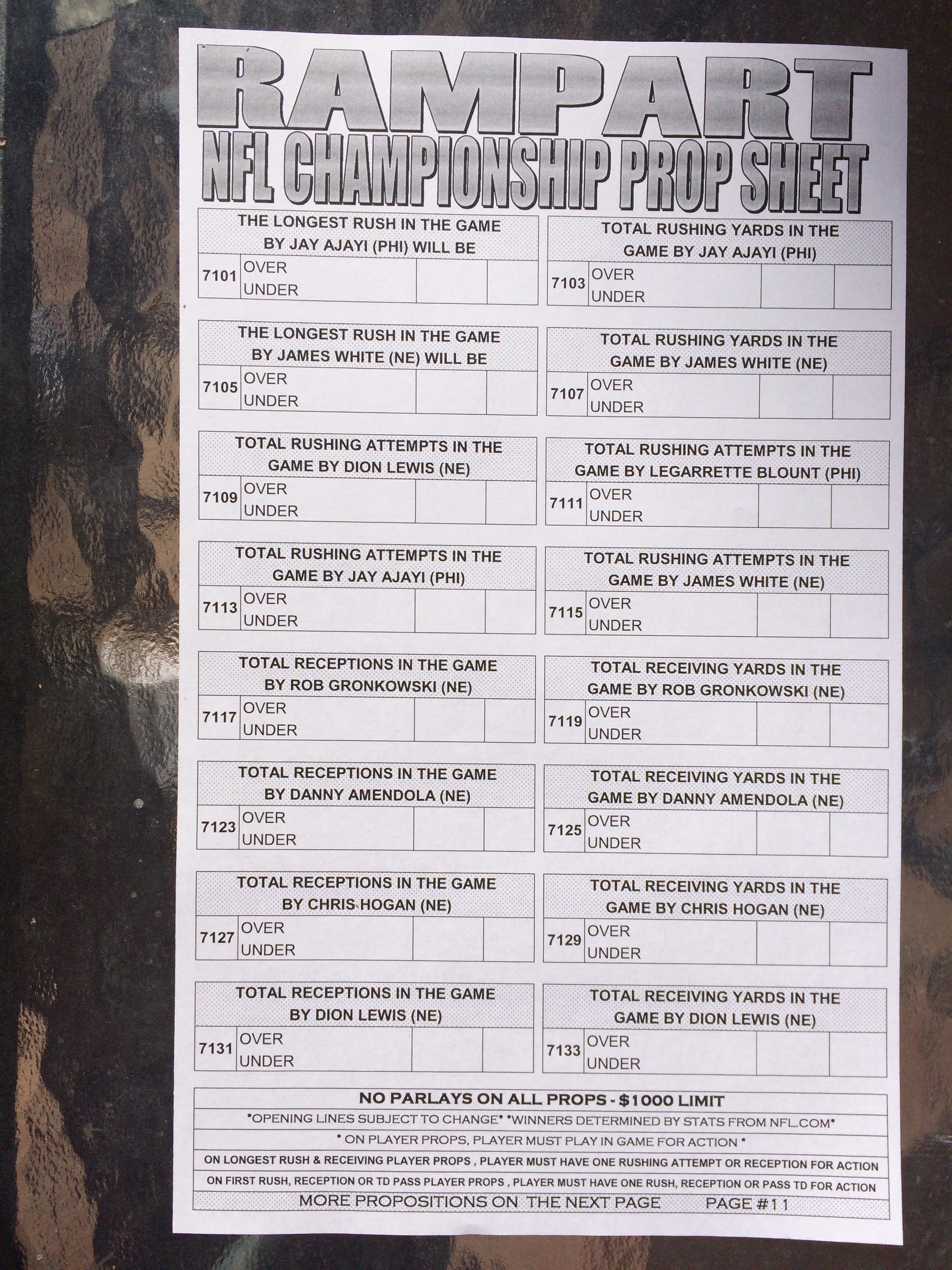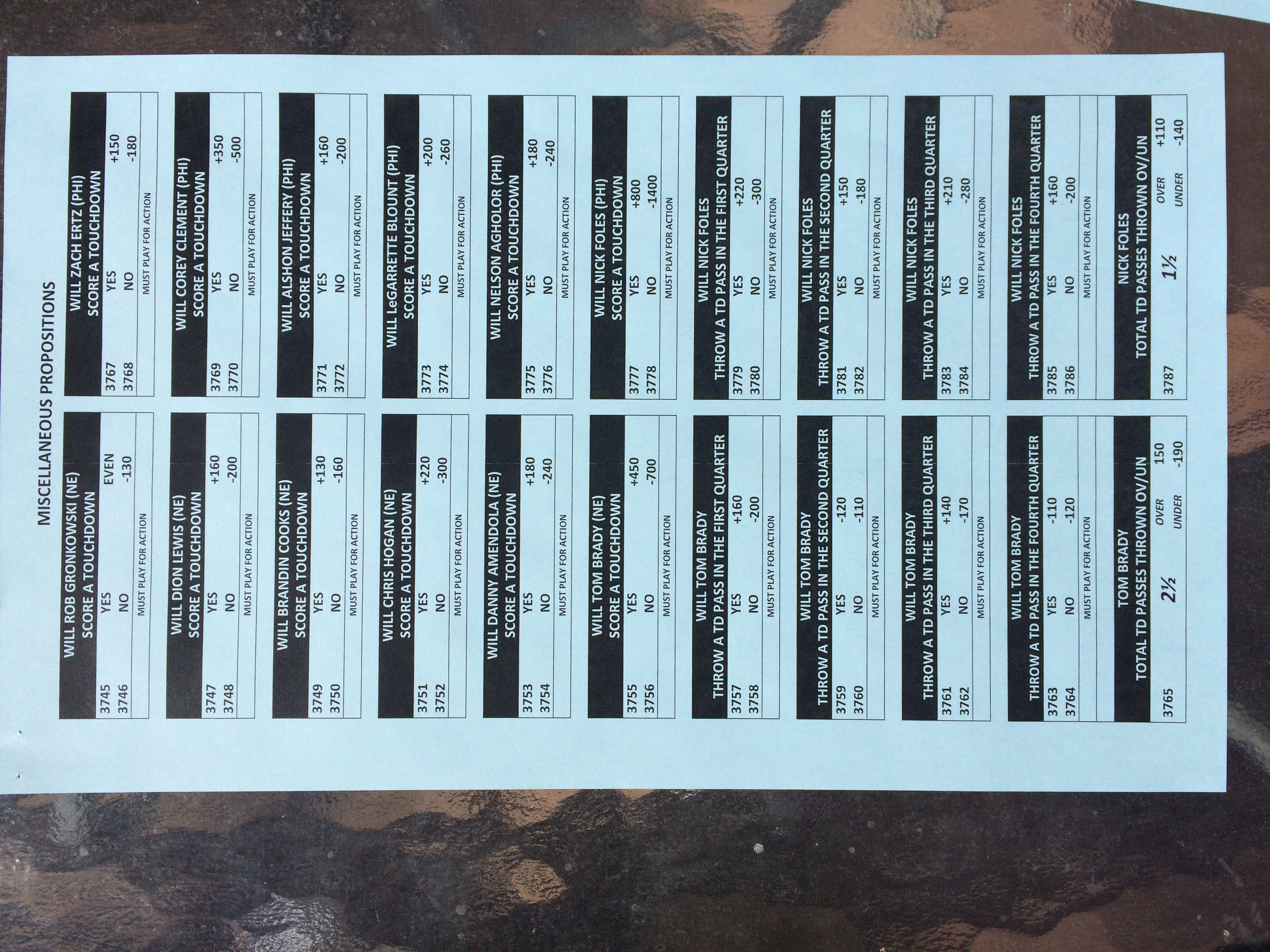 लास वेगास के कई खेल बुक फ़ैमिली में प्रस्तावित दांवों के हर पृष्ठ की तस्वीरें नीचे दी गई हैं। ये शीट्स 27 जनवरी, 2018 को, खेल से आठ दिन पहले, एकत्र की गई थीं।