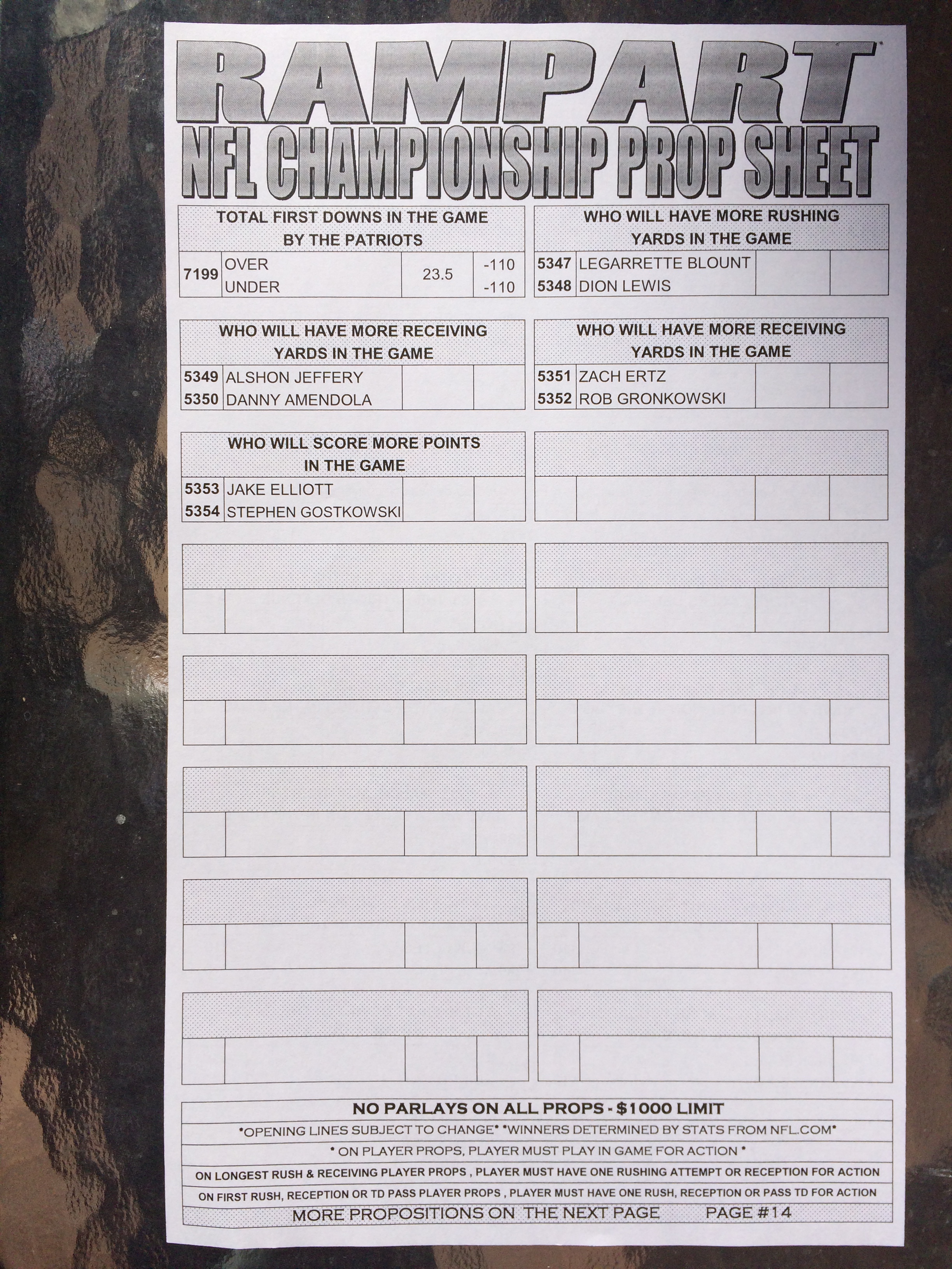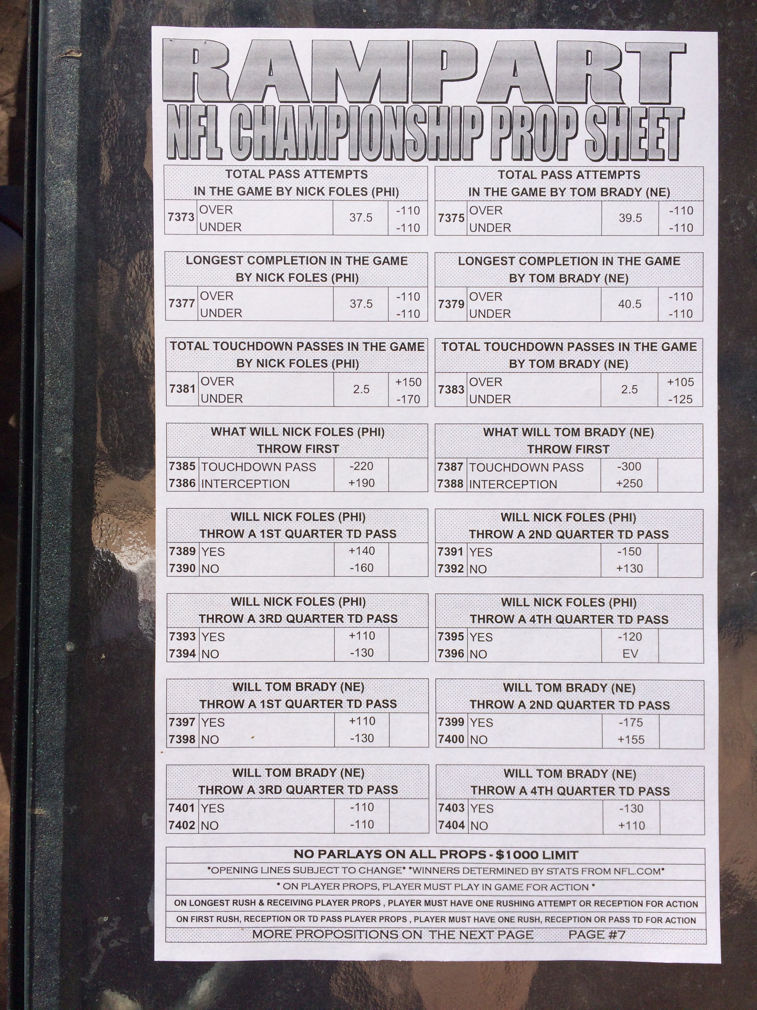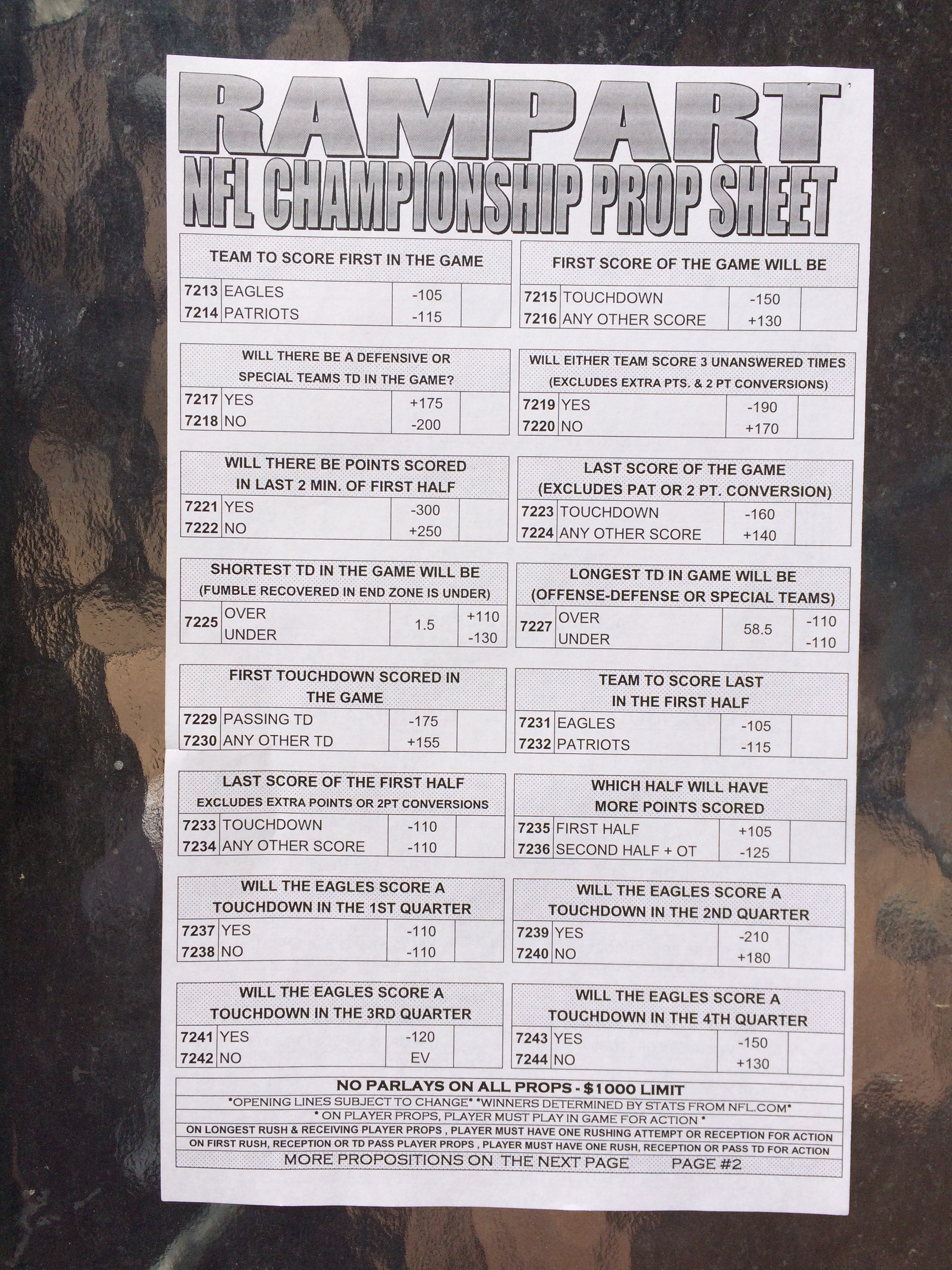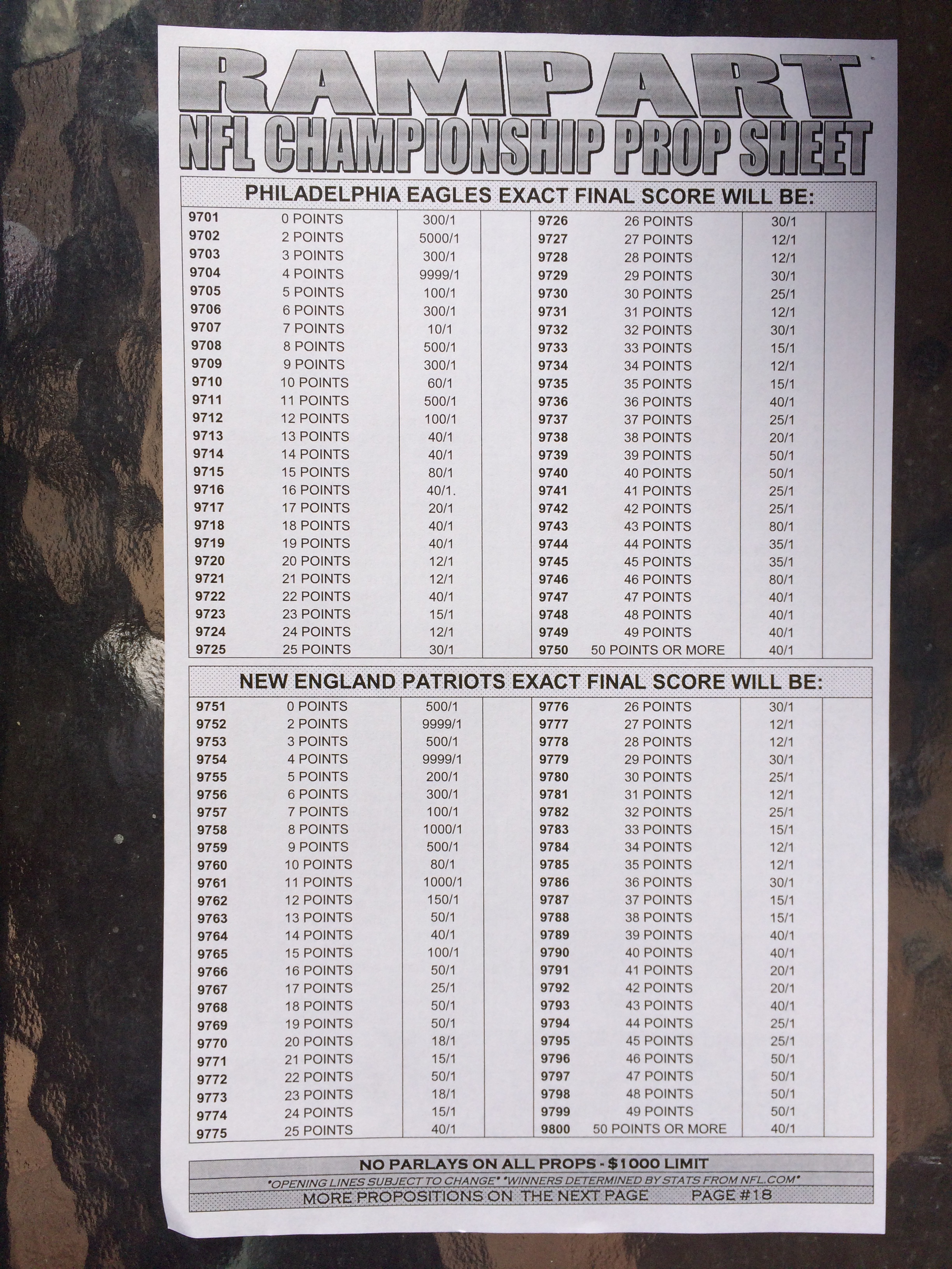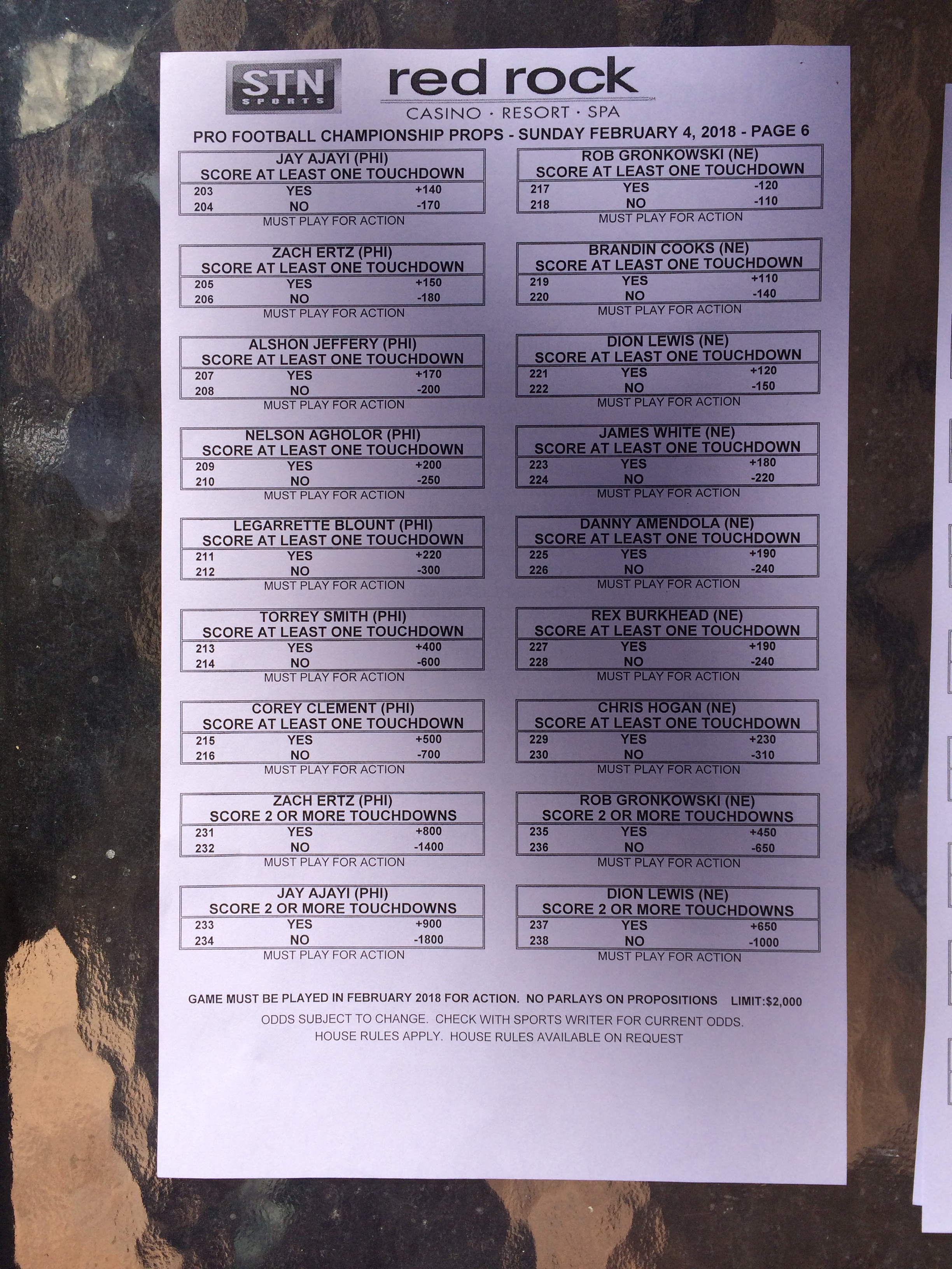लास वेगास के कई खेल बुक फ़ैमिली में प्रस्तावित दांवों के हर पृष्ठ की तस्वीरें नीचे दी गई हैं। ये शीट्स 27 जनवरी, 2018 को, खेल से आठ दिन पहले, एकत्र की गई थीं।