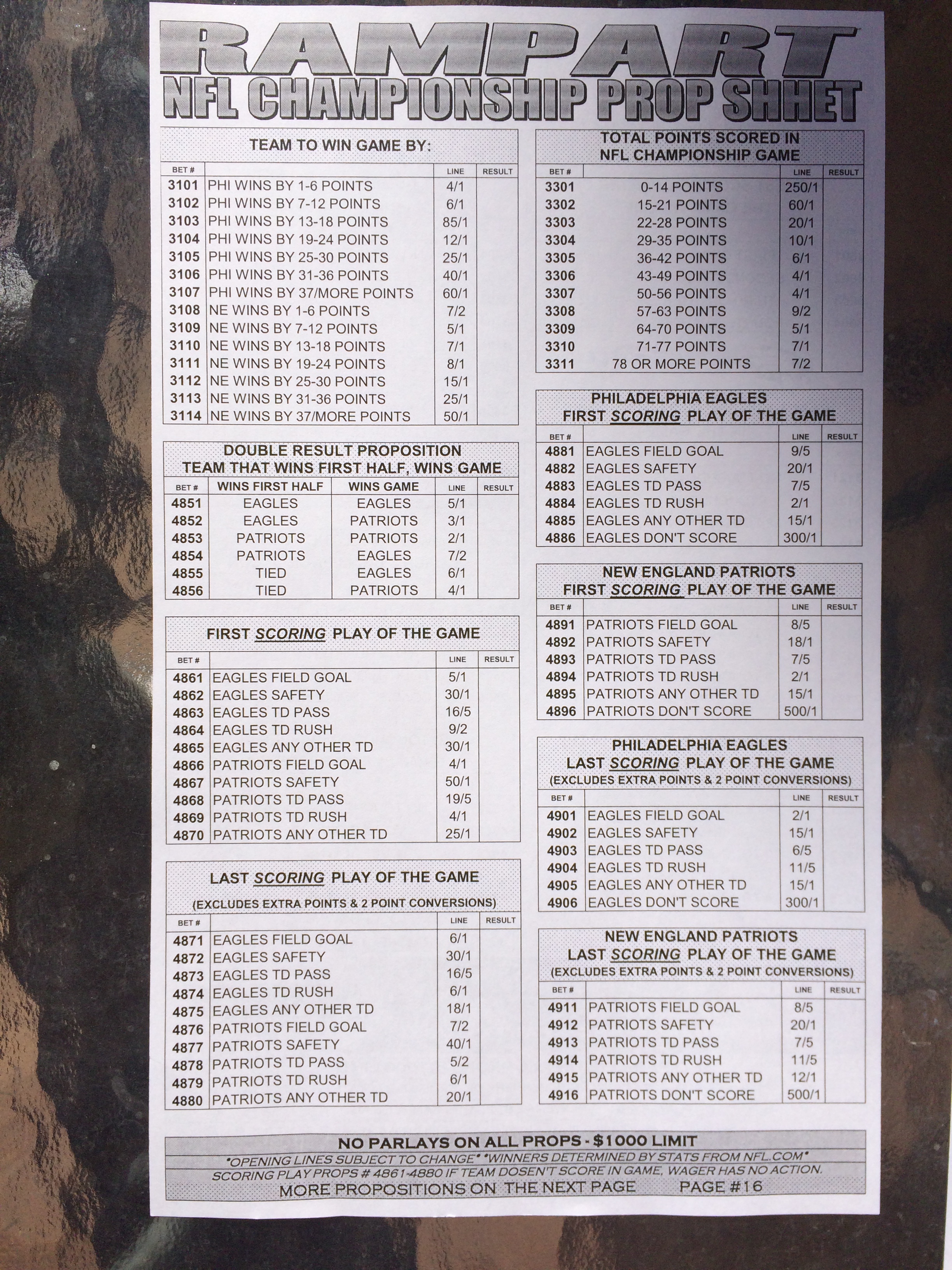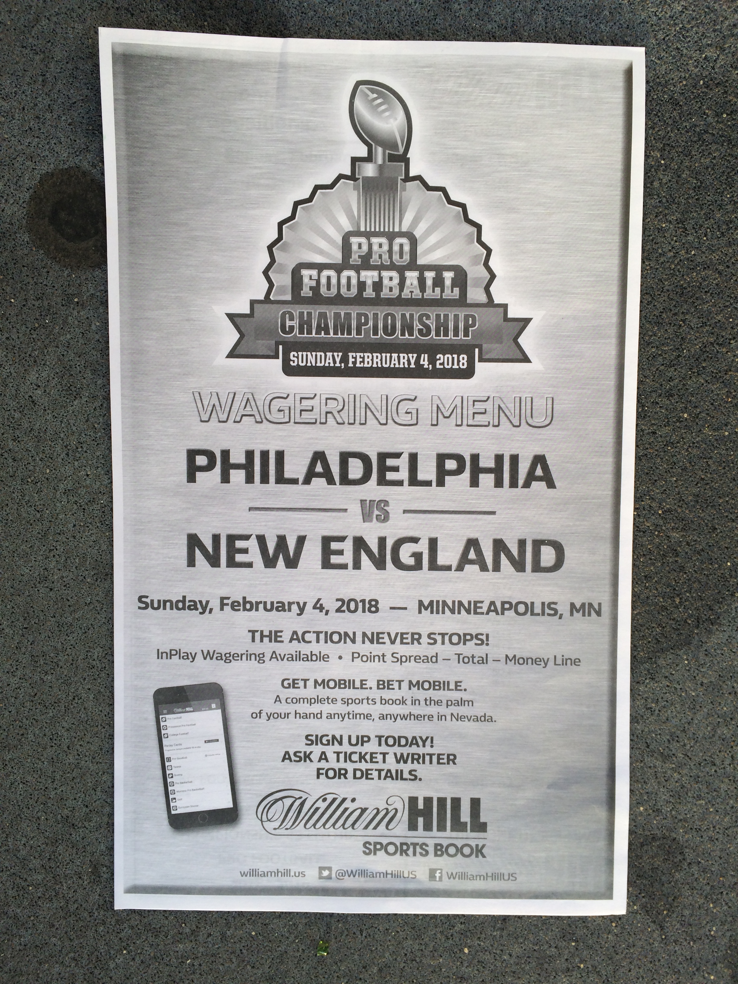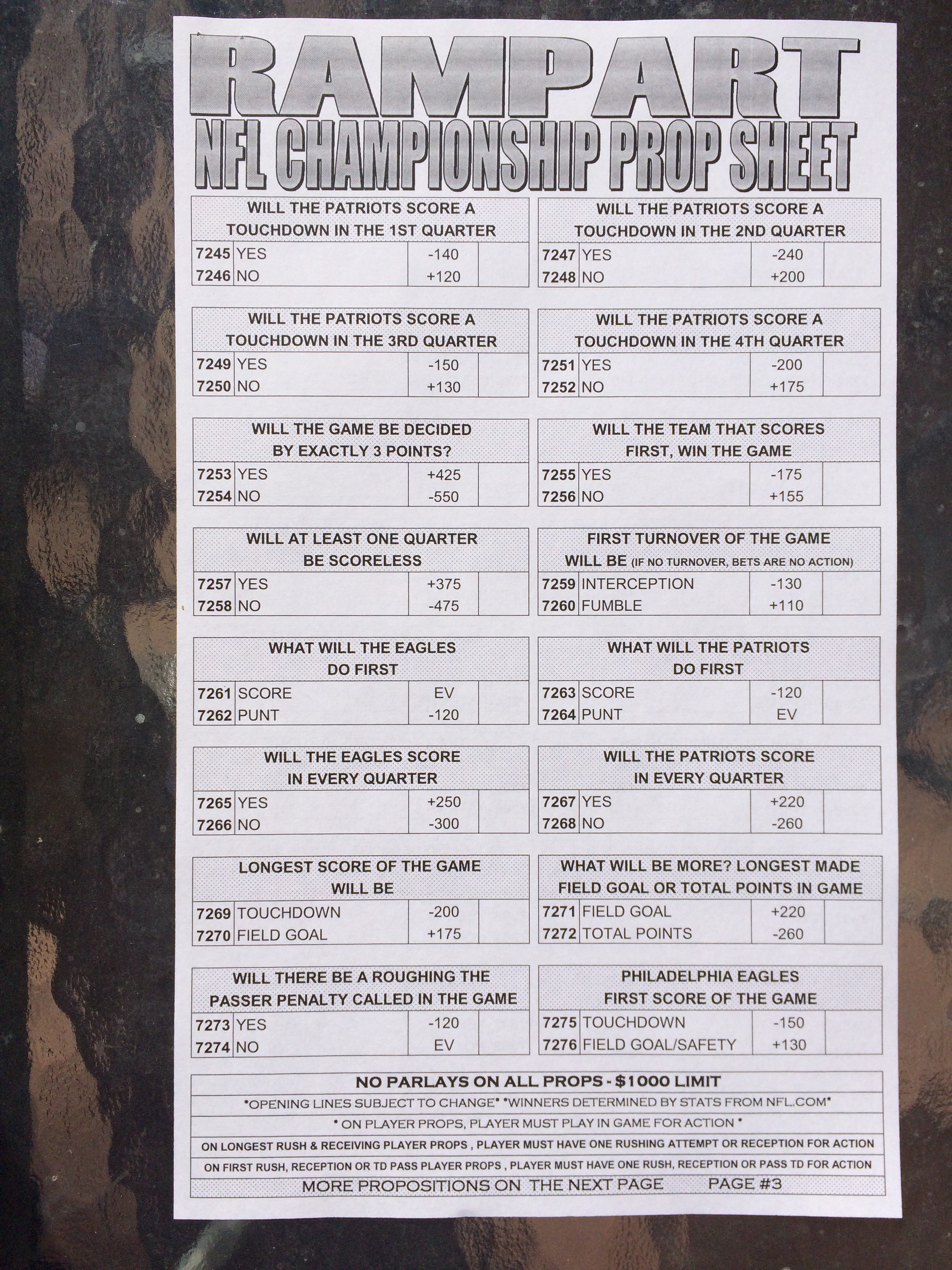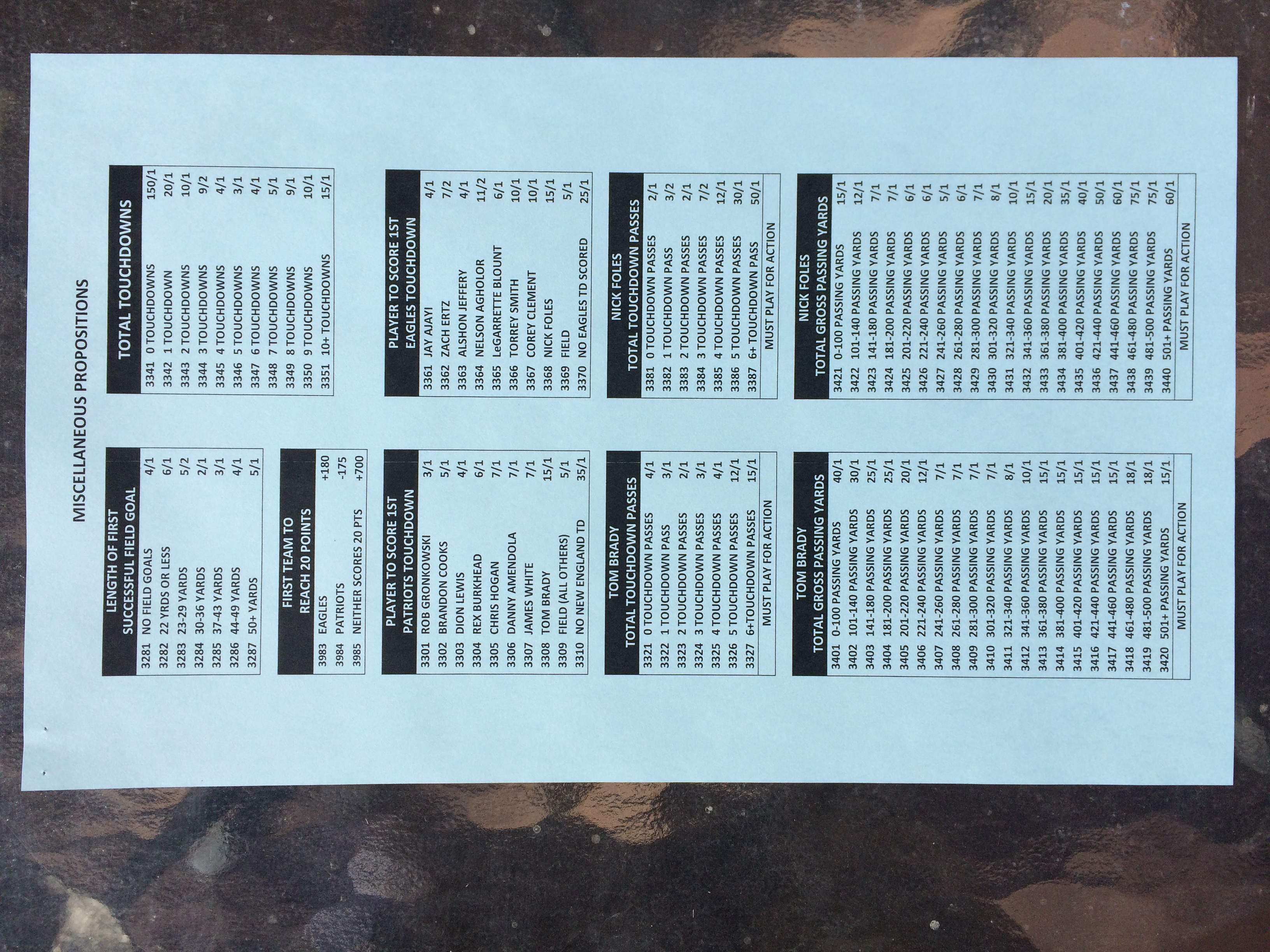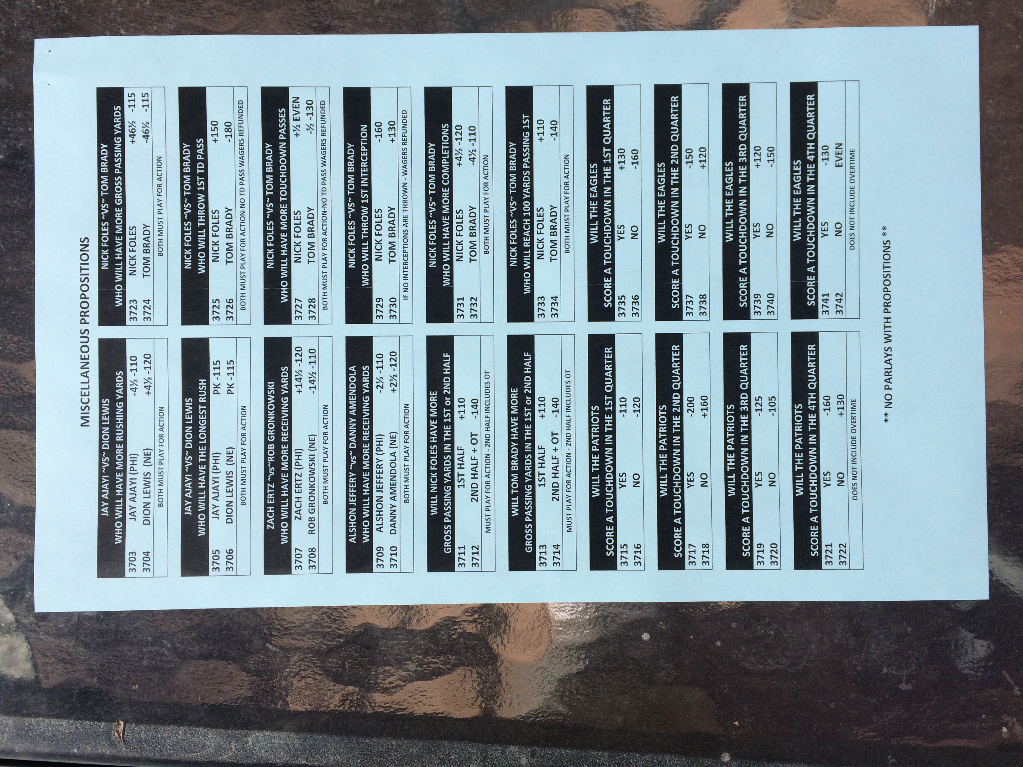 लास वेगास के कई खेल बुक फ़ैमिली में प्रस्तावित दांवों के हर पृष्ठ की तस्वीरें नीचे दी गई हैं। ये शीट्स 27 जनवरी, 2018 को, खेल से आठ दिन पहले, एकत्र की गई थीं।