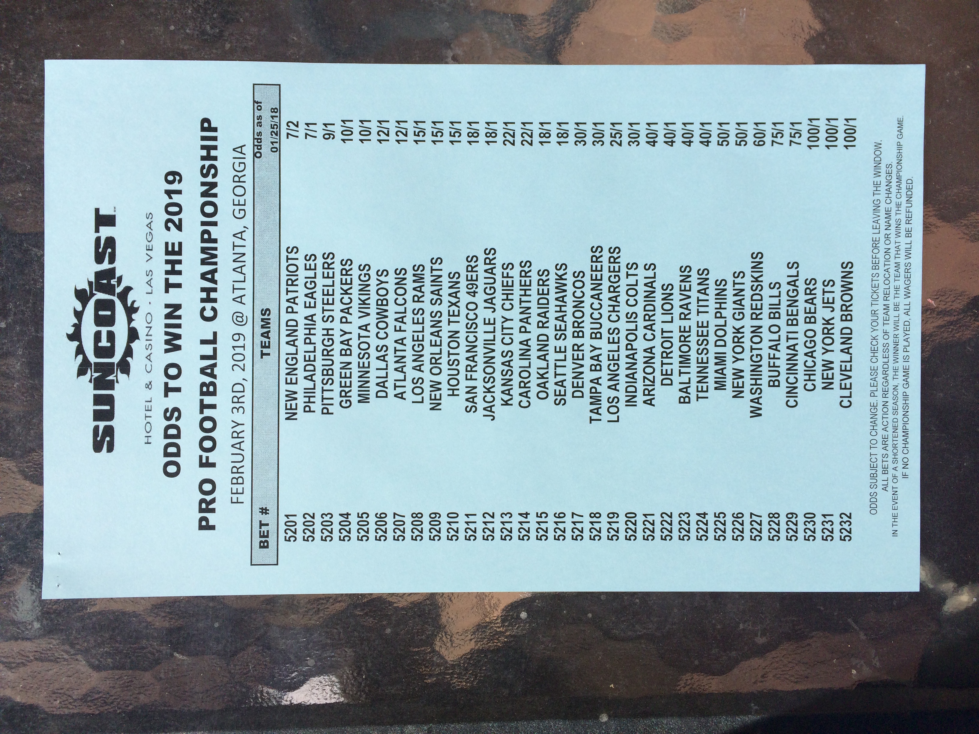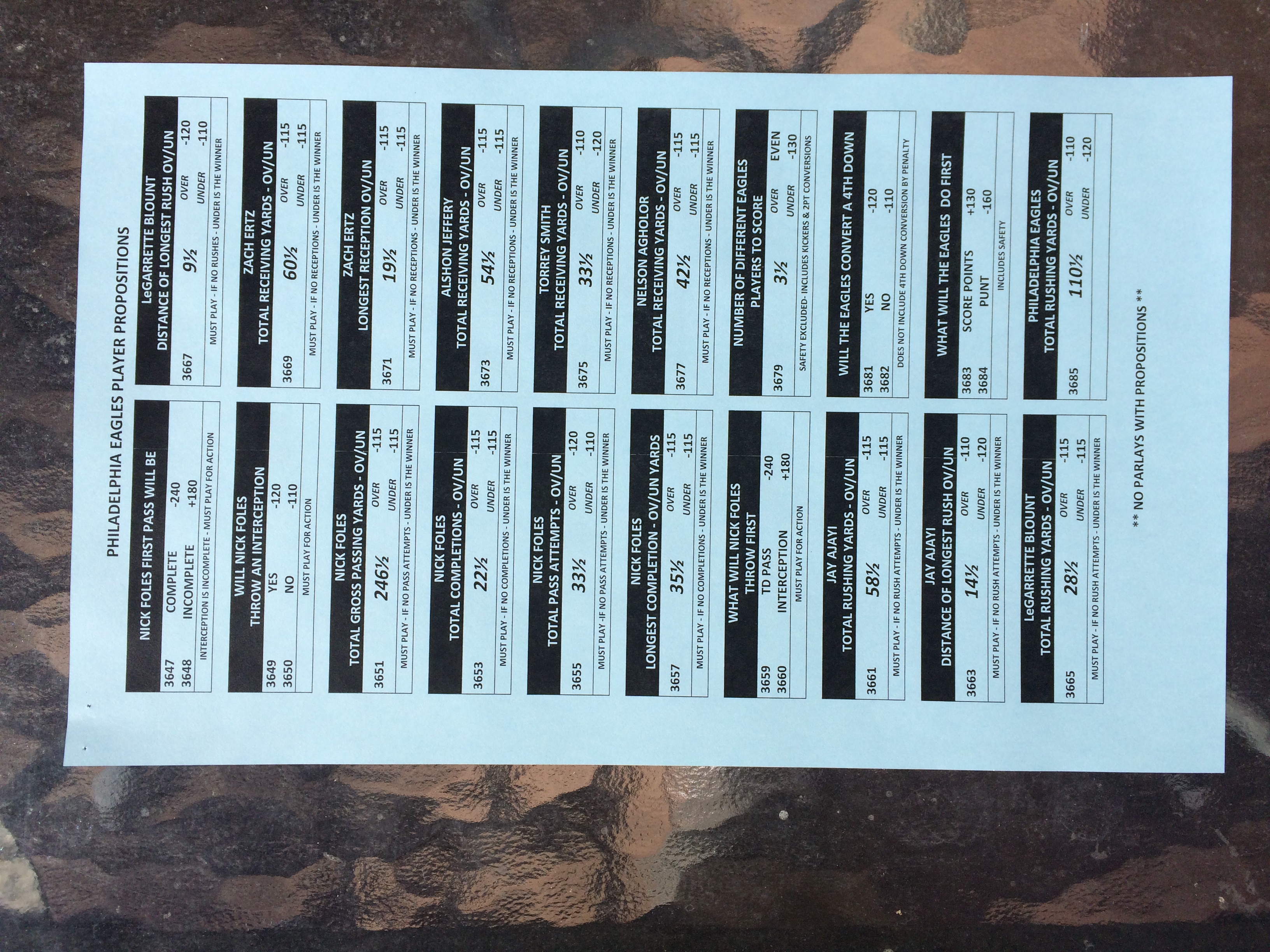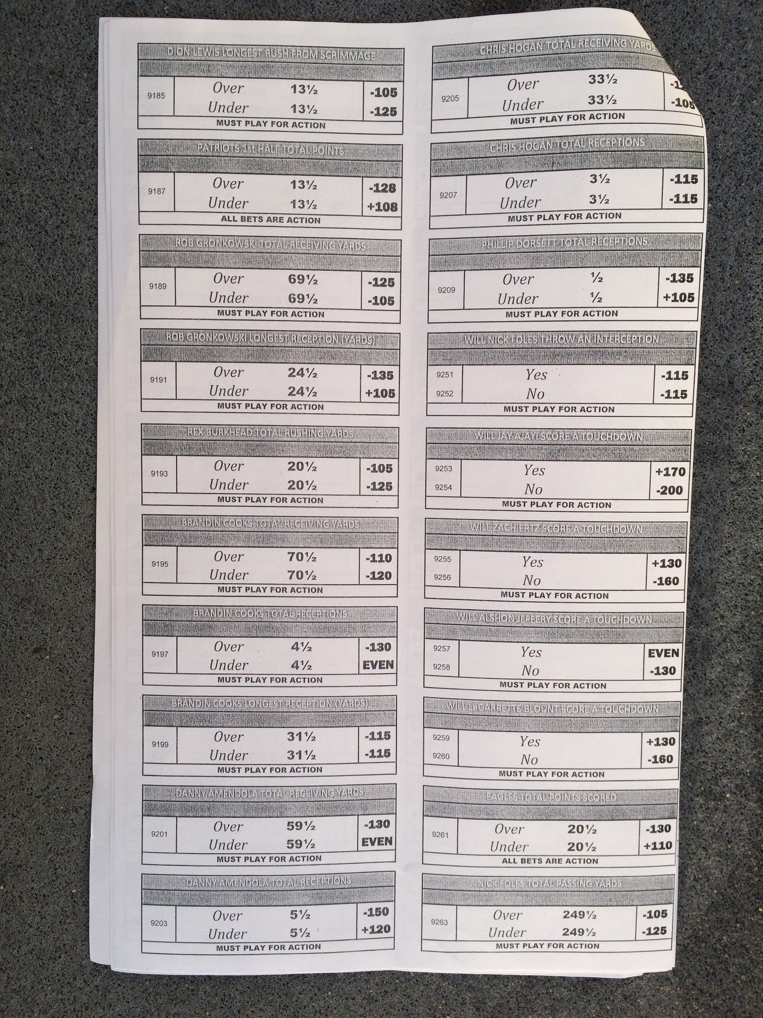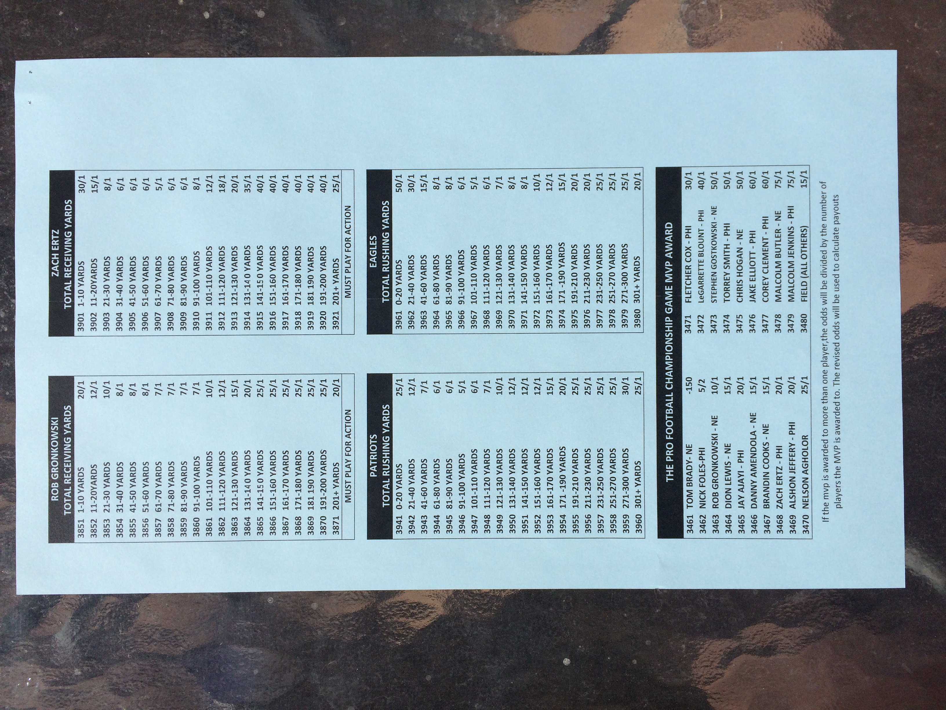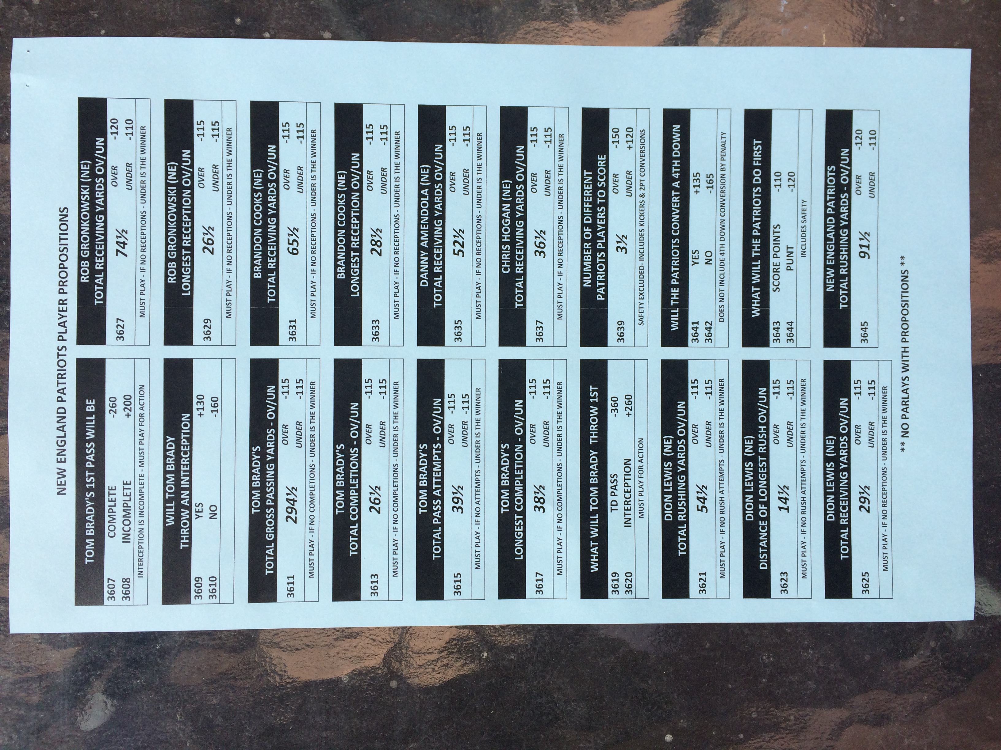 लास वेगास के कई खेल बुक फ़ैमिली में प्रस्तावित दांवों के हर पृष्ठ की तस्वीरें नीचे दी गई हैं। ये शीट्स 27 जनवरी, 2018 को, खेल से आठ दिन पहले, एकत्र की गई थीं।