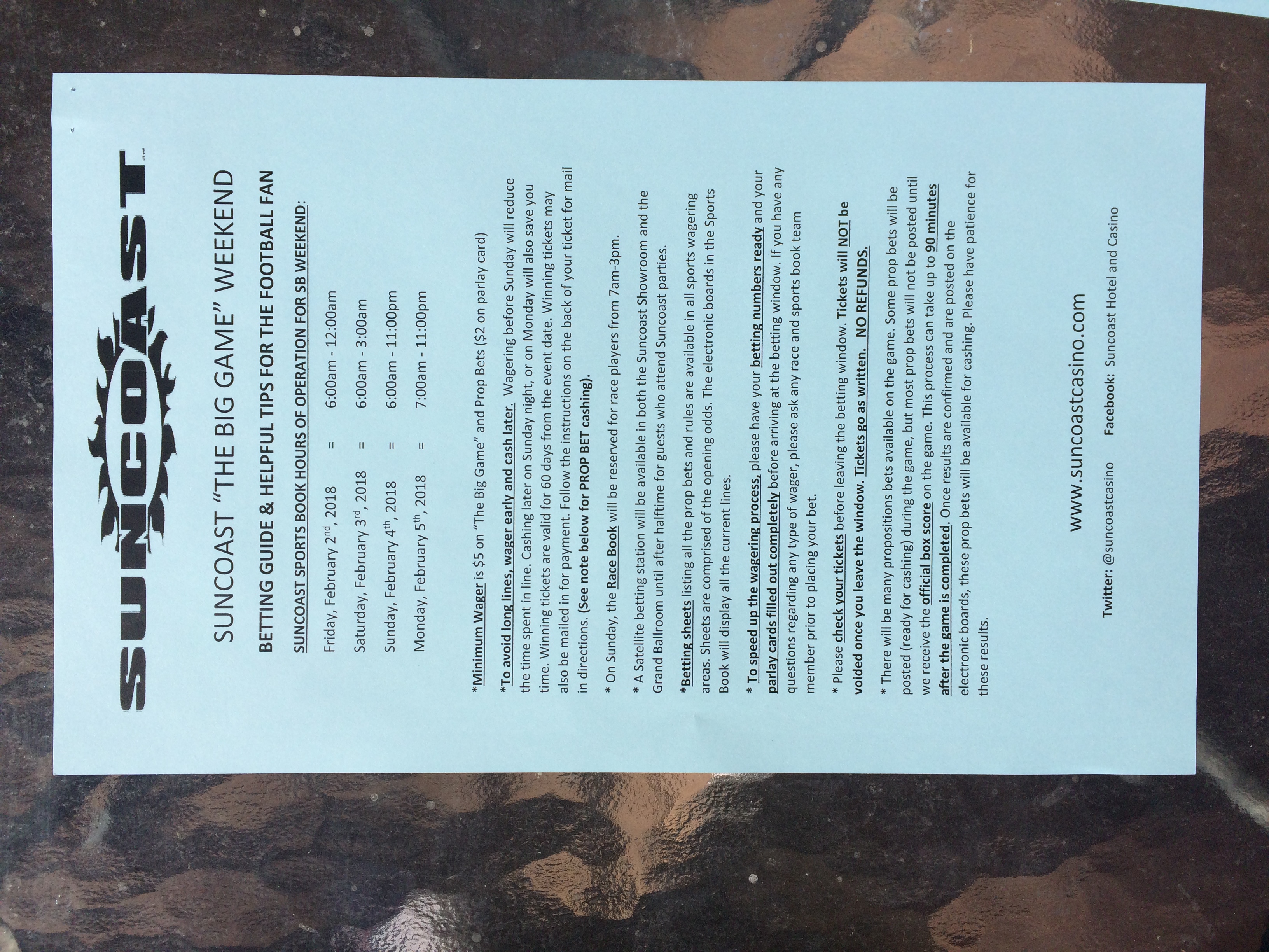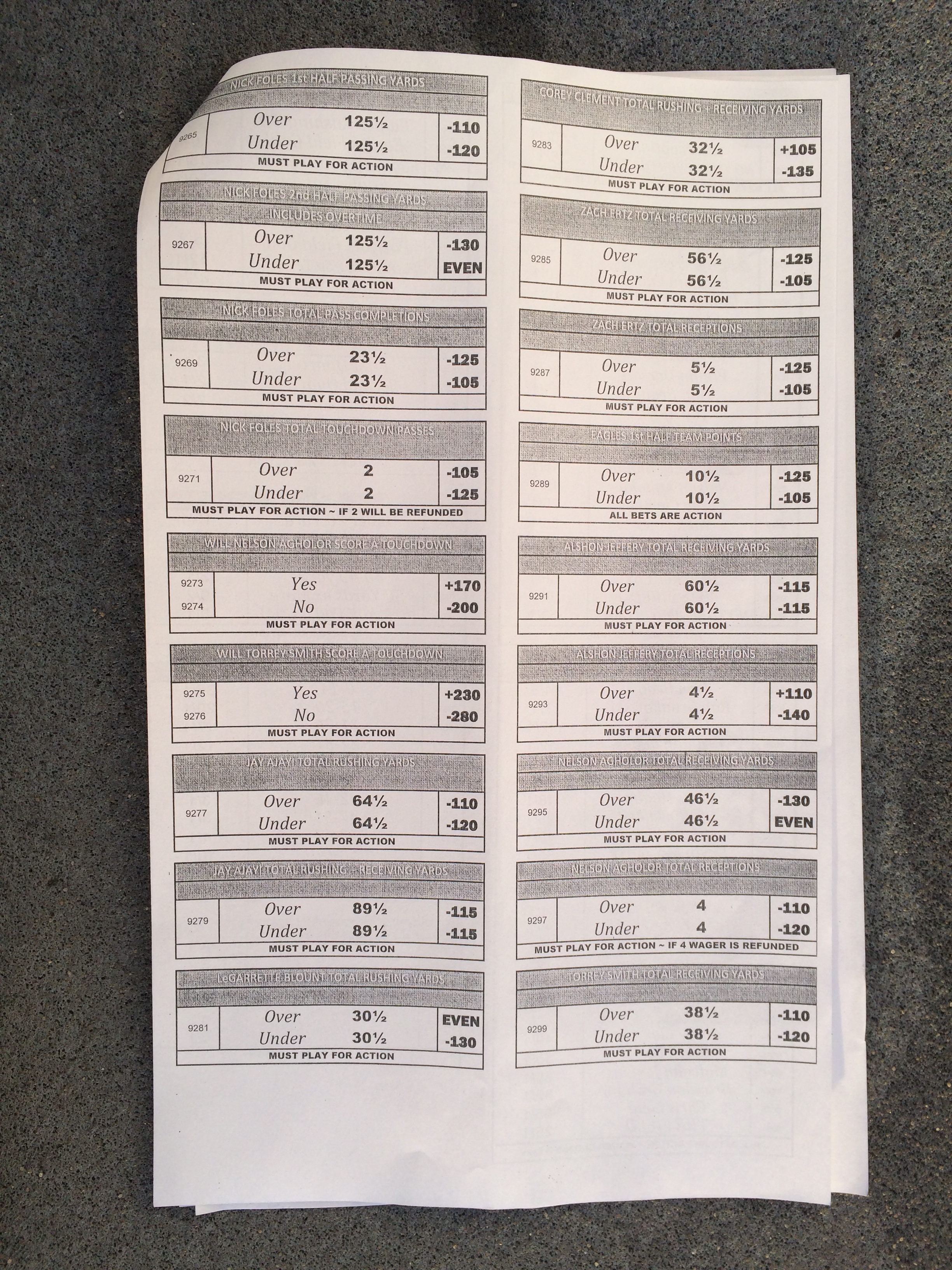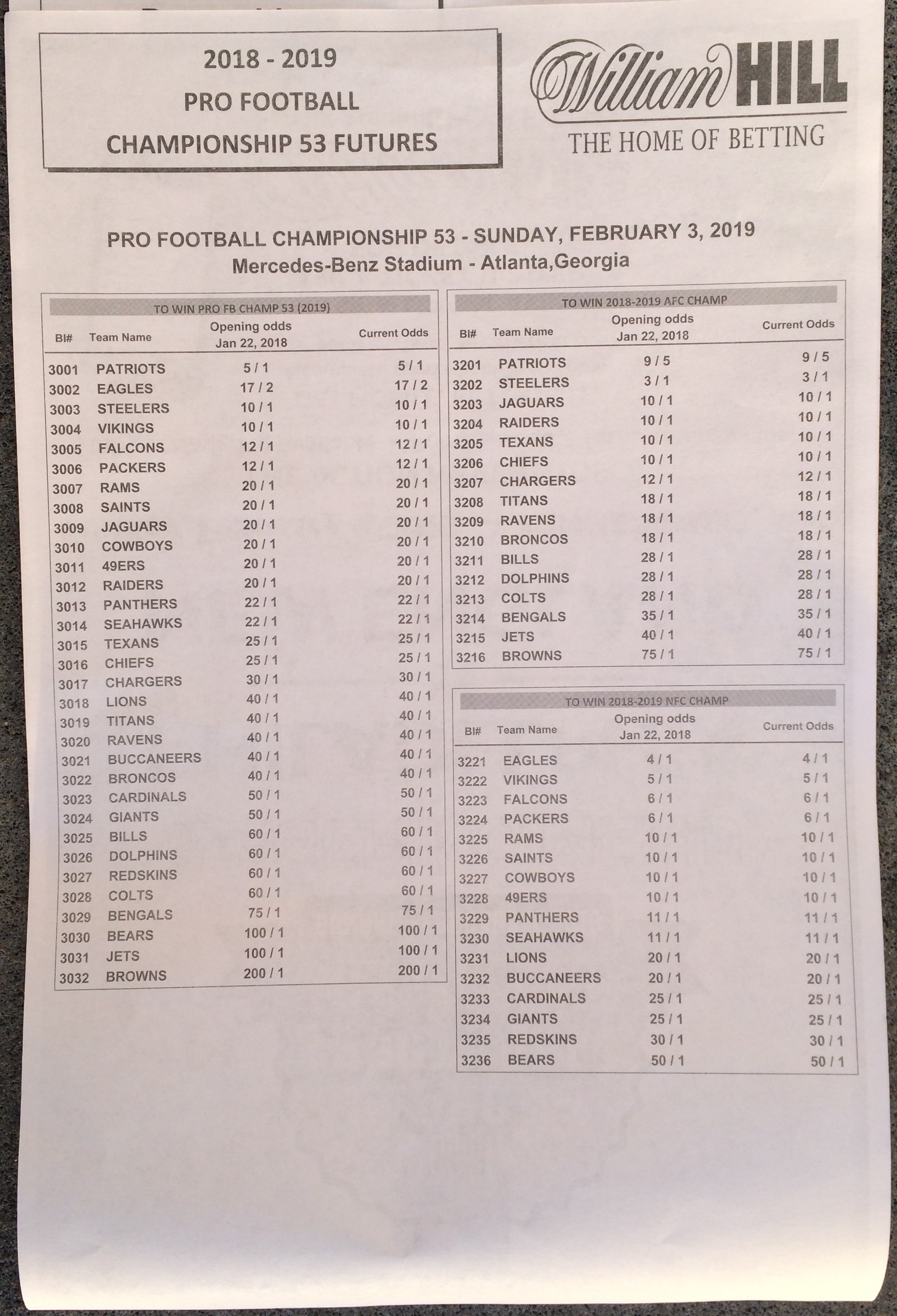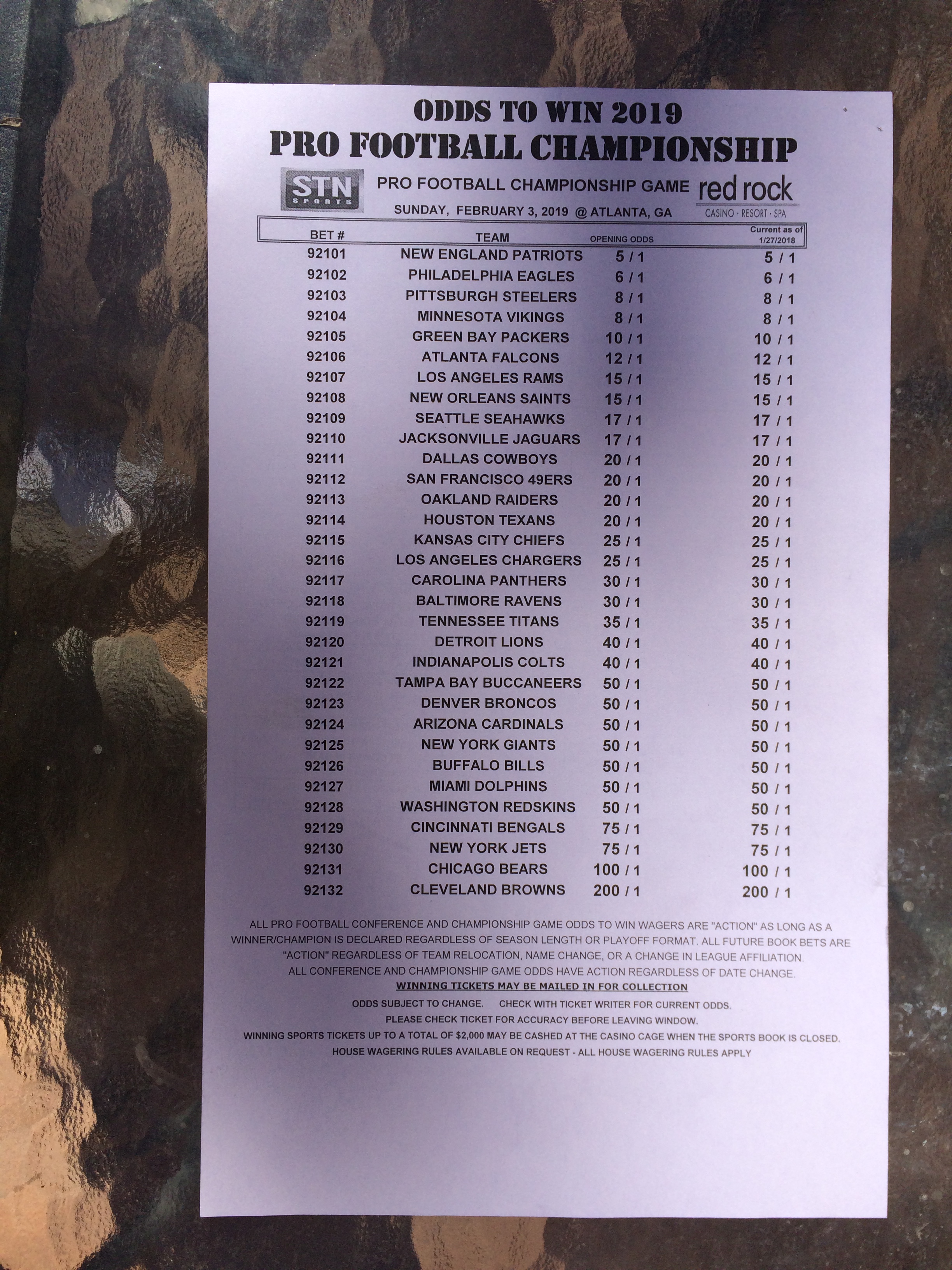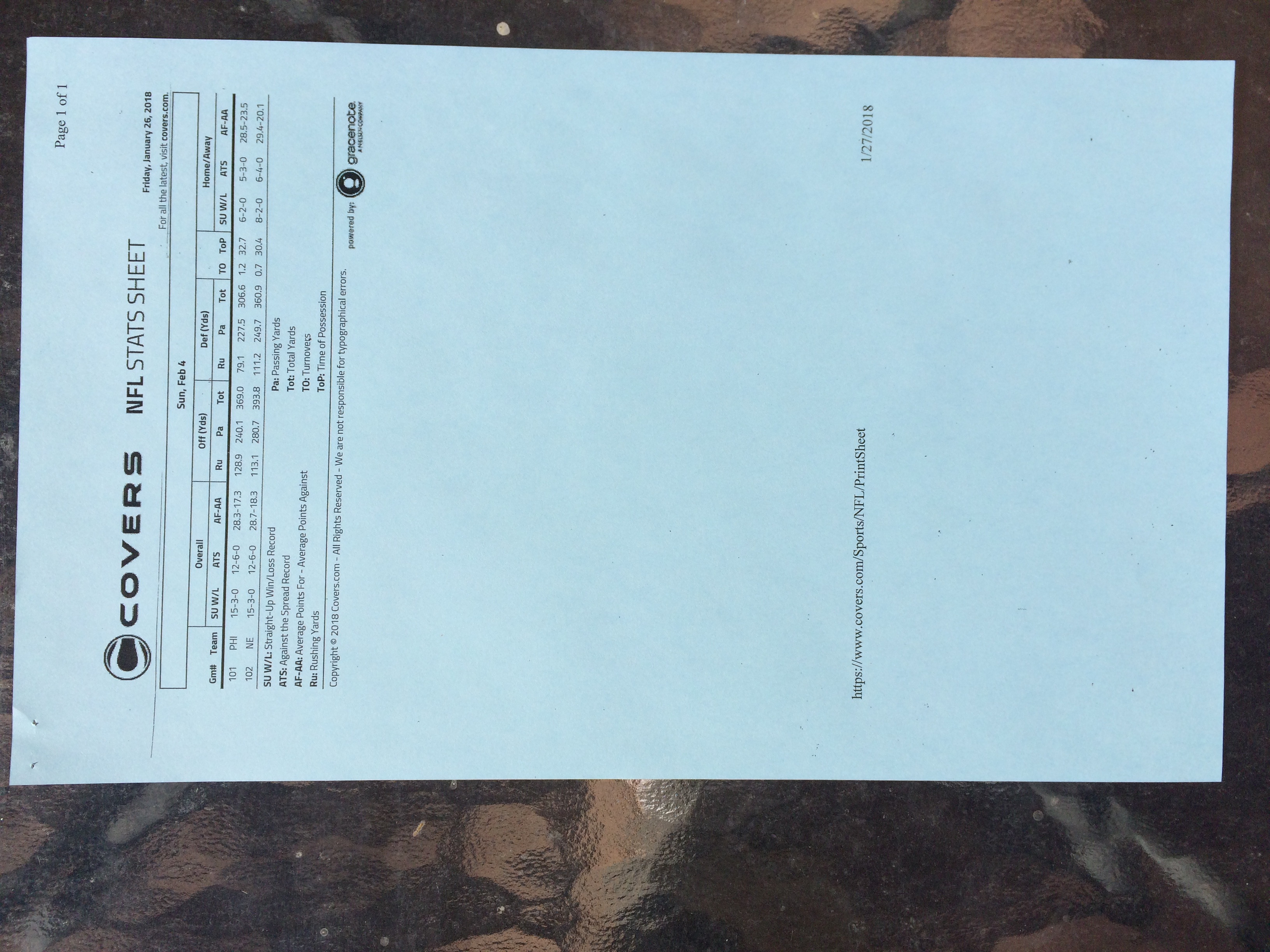 लास वेगास के कई खेल बुक फ़ैमिली में प्रस्तावित दांवों के हर पृष्ठ की तस्वीरें नीचे दी गई हैं। ये शीट्स 27 जनवरी, 2018 को, खेल से आठ दिन पहले, एकत्र की गई थीं।
