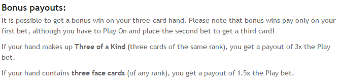 - खिलाड़ी को निम्नलिखित हाथों के लिए बोनस दिया जाएगा। ये बोनस डीलर के हाथ की परवाह किए बिना दिए जाते हैं।