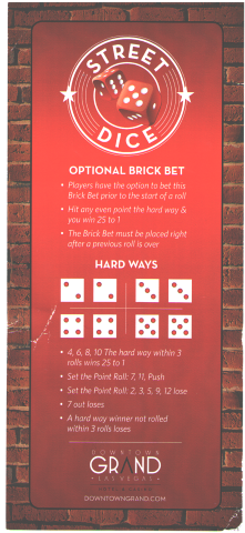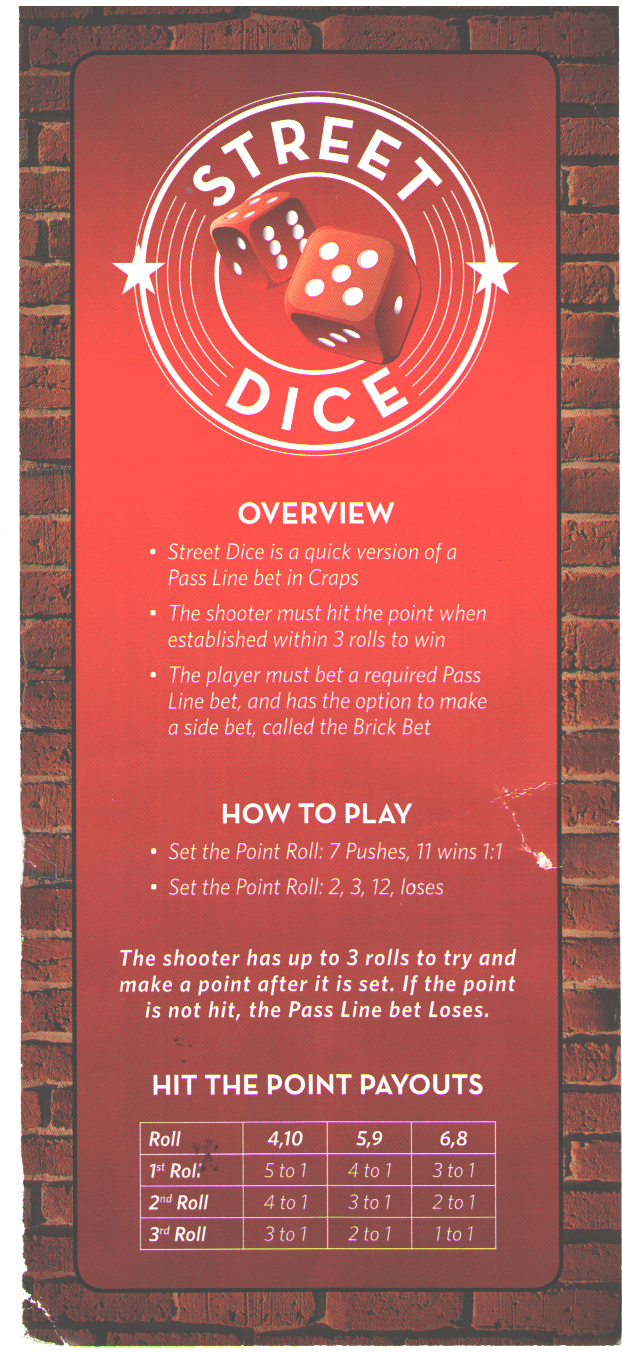 स्ट्रीट डाइस एक पासा खेल है जिसकी शुरुआत 16 मई, 2014 को लास वेगास के डाउनटाउन ग्रैंड कैसीनो में हुई थी। इसे मोटे तौर पर क्रेप्स का एक सरलीकृत संस्करण कहा जा सकता है, जिसमें केवल दो दांव लगाने होते हैं और एक दांव को हल करने के लिए अधिकतम चार बार पासा फेंका जाता है। ग्रैंड में, यह खेल बाहर खेला जाता है और पासे एक तीन-तरफा लकड़ी के बक्से के अंदर डाले जाते हैं, जिसे गली जैसा दिखने के लिए रंगा गया है।