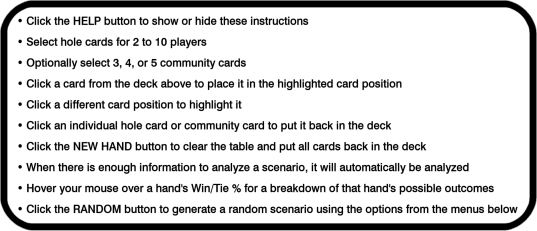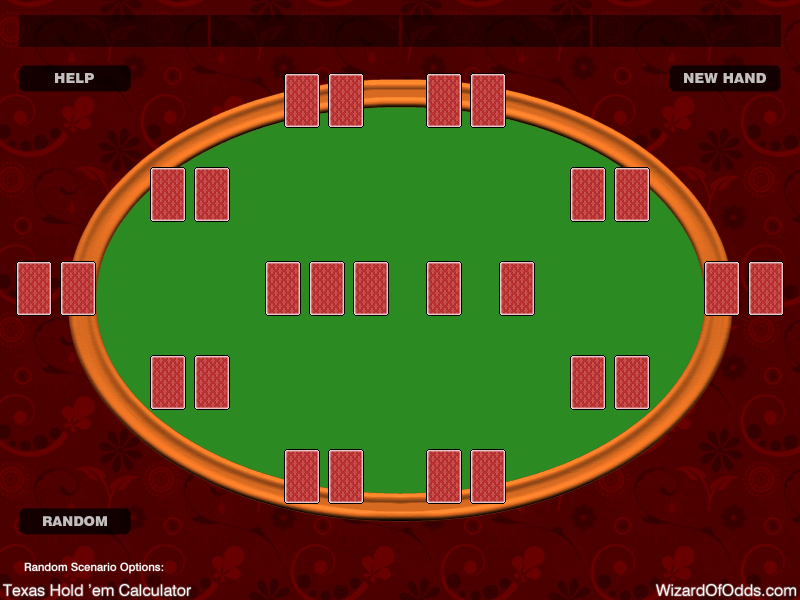 यह पोकर कैलकुलेटर आपको प्रत्येक खिलाड़ी के लिए जीत, हार और बराबरी की संभावनाएँ बताएगा। किसी भी कार्ड पर क्लिक करें और उसका उपयोग पीले फ्रेम द्वारा दर्शाई गई स्थिति में किया जाएगा। आप फ्रेम को वहाँ ले जाने के लिए किसी भी मान्य कार्ड पर क्लिक कर सकते हैं। "फोल्डेड हैंड" पर निशान लगाकर यह दर्शाएँ कि दिया गया खिलाड़ी हाथ से बाहर है और अपने पत्ते बचे हुए डेक से हटा रहा है। आप किसी भी यादृच्छिक स्थिति को भी कॉन्फ़िगर कर सकते हैं। आनंद लें!