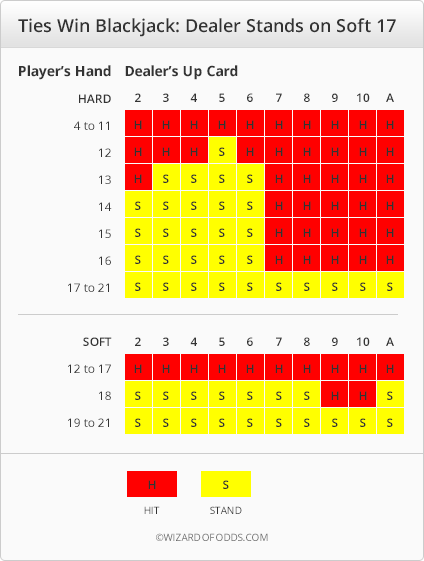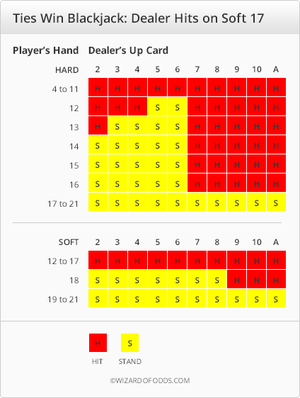 निम्नलिखित तालिकाएं डीलर के सॉफ्ट 17 पर हिट करने या खड़े होने के अनुसार रणनीति दिखाती हैं। ये तालिकाएं किसी भी संख्या में डेक के लिए सही हैं।