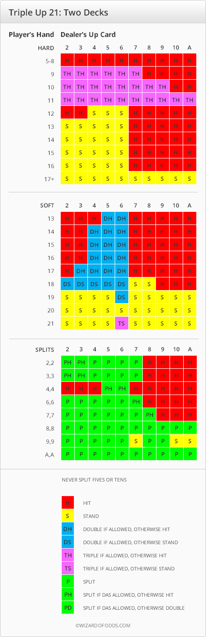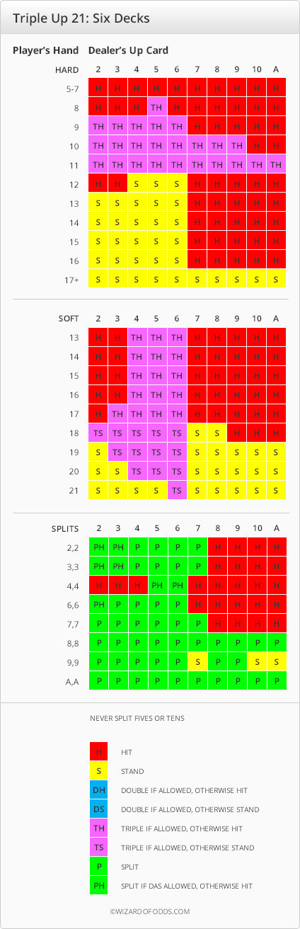नियम कार्डों पर जो लिखा हो, उसके विपरीत, ट्रिपल अप 21 के नियम निम्नलिखित हैं। किसी भी खेल में, यदि आप सुनिश्चित नहीं हैं तो डीलर से नियमों के बारे में पूछें।- खिलाड़ी कुछ शुरुआती दो-कार्ड वाले हाथों में अपनी बाजी को तीन गुना (तिगुना) कर सकता है। छह डेक के साथ, खिलाड़ी किसी भी शुरुआती दो-कार्ड वाले हाथ में तिगुना कर सकता है। दो डेक के साथ, तिगुना करना 9 से 11 के निश्चित योग तक सीमित है। एक डेक के साथ, तिगुना करना 10 और 11 के निश्चित योग तक सीमित है। कैसीनो के आधार पर, एक और दो डेक वाले ब्लैकजैक में तिगुना करने की भी अनुमति हो सकती है।