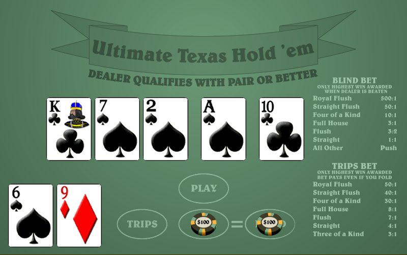 - net/ultimate-texas-holdem/" target="_blank">Discountgambling.net के पास इस खेल का एक उत्कृष्ट विश्लेषण है, जिसमें दूसरे और तीसरे निर्णय बिंदुओं के लिए मैं उनकी "नट किकर" रणनीति भी शामिल करता हूँ।