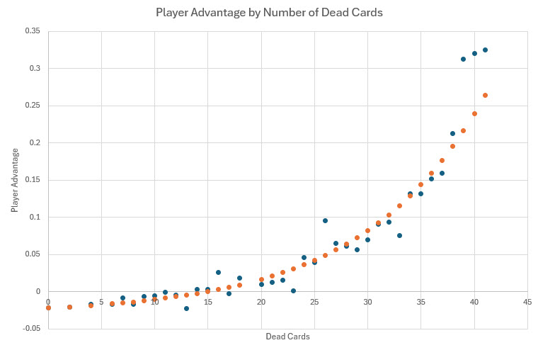 ग्राफ़ में नीले बिंदु वास्तविक सिमुलेशन परिणाम दर्शाते हैं। नारंगी बिंदु एक घातांकीय समाश्रयण रेखा पर बिंदुओं को दर्शाते हैं। d मृत कार्डों के अनुसार, खिलाड़ी के लाभ (पूर्व शर्त के आधार पर) का सूत्र इस प्रकार है: