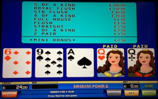 अंत में, मैं इस बात पर ज़ोर देना चाहता हूँ कि अमेरिकी पोकर को जर्मन गेमिंग कानूनों का पालन करने में चूक हुई है, जो प्रति घंटे खेल में अधिकतम जीत और हार की सीमा निर्धारित करते हैं। नोवोमैटिक द्वारा बनाए गए इन खेलों को ठीक से कैसे प्रोग्राम किया जाता है, मुझे नहीं पता। इस पृष्ठ का विश्लेषण गलत तरीके से यह मान लेता है कि प्रत्येक कार्ड स्वतंत्र है और उसके मौके समान हैं। शुरुआती दांव पर लगभग 40% का उच्च खिलाड़ी लाभ भी इस बात का प्रमाण होना चाहिए कि ये खेल खिलाड़ी के खिलाफ हैं।
