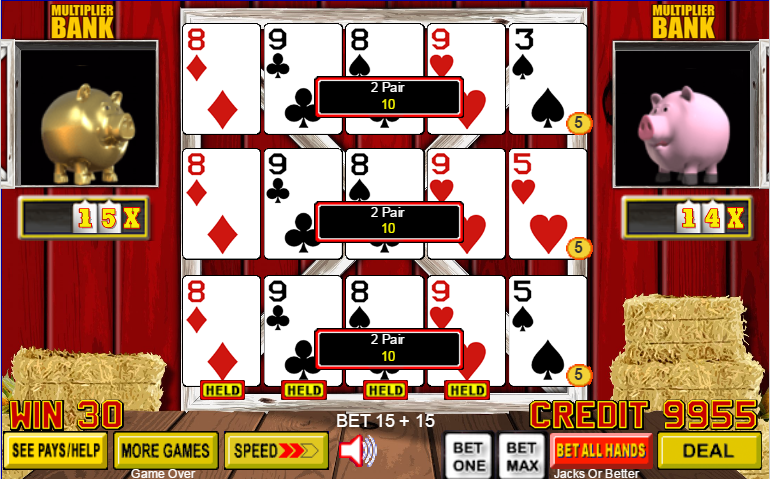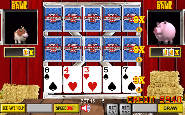 बार्नयार्ड पोकर, IGT/एक्शन गेमिंग द्वारा प्रस्तुत एक वीडियो पोकर संस्करण है। मैंने इसे पहली बार जुलाई 2015 में लास वेगास के सनकोस्ट कैसीनो में देखा था। इस खेल का मुख्य आकर्षण यह है कि खिलाड़ी डील में हर जोड़ी या उससे बेहतर के लिए गुणकों को जमा करता है। ये जमा गुणक यादृच्छिक आधार पर दिए जाते हैं।