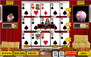 बीच का हाथ फ्लश में बदल गया, जो जैक्स या बेटर गेम के तहत, जो मैं खेल रहा था, प्रति क्रेडिट दांव 5 देता है। 5 क्रेडिट प्रति हाथ के बेस दांव और 9x के गुणक के साथ, कुल जीत 5×5×9=225 क्रेडिट थी।