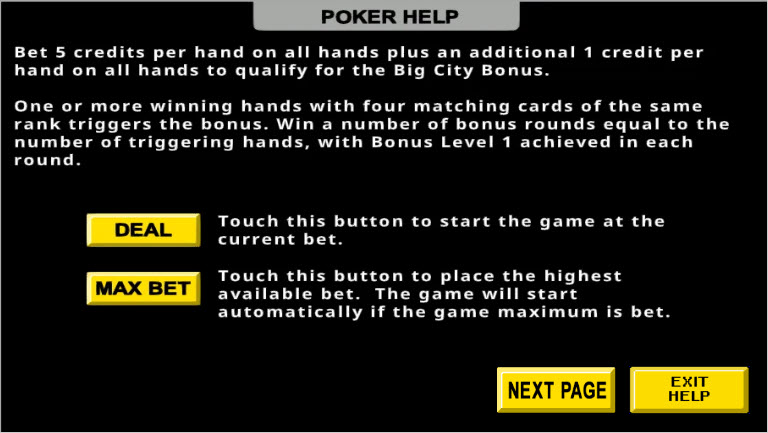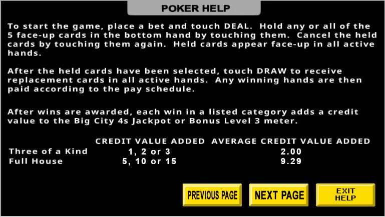 बिग सिटी 4s एक वीडियो पोकर संस्करण है जिसमें खिलाड़ी को ड्रॉ में एक तरह के चार कार्ड मिलने पर बोनस मिलता है। ड्रॉ में एक तरह के तीन कार्ड और फुल हाउस मिलने पर बोनस राउंड में क्रेडिट मिलता है।