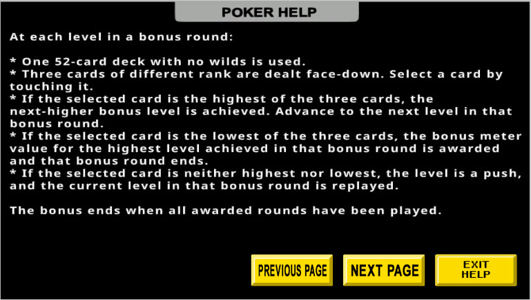 - बोनस गेम के प्रत्येक स्तर में, खिलाड़ी को अलग-अलग रैंक के तीन कार्डों में से चुनना होगा। लक्ष्य सबसे ऊँची रैंक वाला कार्ड चुनना है।