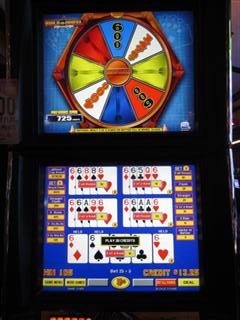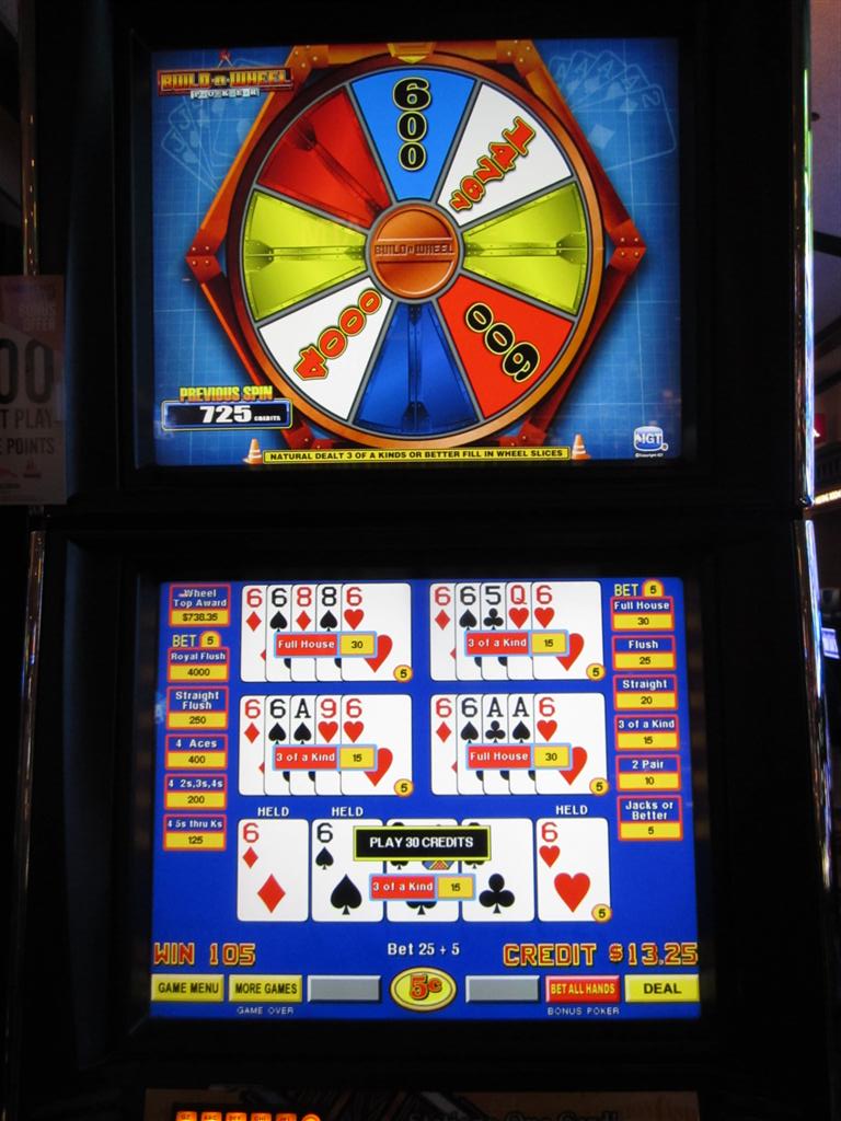 याद रखें कि अगर खिलाड़ी को फुल हाउस या उससे ज़्यादा मिलता है, तो वह अपने आप ही बचे हुए पूरे पहिये को भर देता है। आइए फ्लश या उससे कम वाली जीत को "छोटा स्लाइस" और फुल हाउस या उससे ज़्यादा वाली जीत को "बड़ा स्लाइस" कहें। मैं गणित में नहीं पड़ूँगा, इसलिए मान लीजिए कि एक पूरे हुए पहिये पर बड़े स्लाइस की औसत संख्या 1.125245 है, जबकि छोटे स्लाइस 4.874755 हैं। नीचे दी गई तालिका दर्शाती है कि यह मानते हुए कि खिलाड़ी कोई भी जैकपॉट नहीं जीतता, उसकी औसत बोनस जीत 826.55 क्रेडिट होगी।
