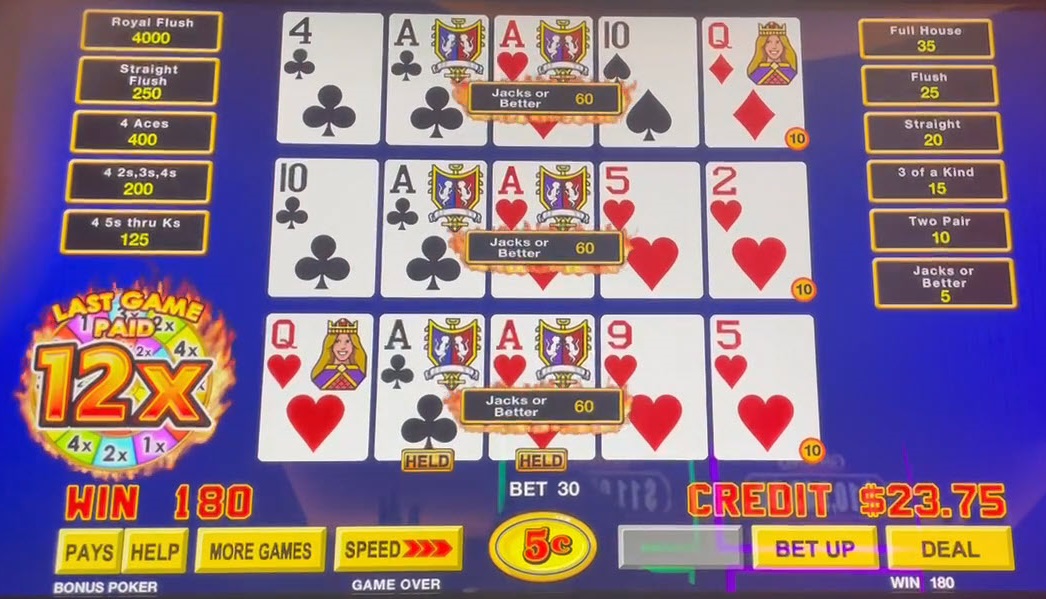 किसी भी हाथ में कोई सुधार नहीं हुआ। हाई पेयर के लिए 5 की तीन जीत और 12x के गुणक के साथ, मेरी कुल जीत 5×3×12 = 180 क्रेडिट थी।