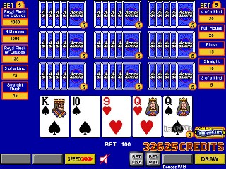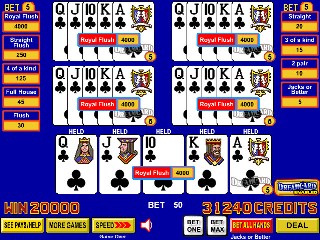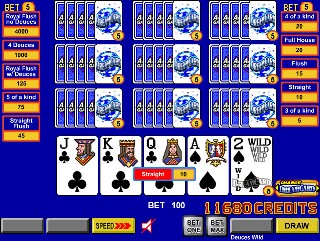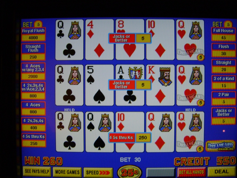 हालाँकि, खेल आमतौर पर सही सलाह देता है। बॉब डांसर के लेख "ड्रीमकार्ड पर एक नज़र - भाग I का II" में कहा गया है कि जब दो या अधिक कार्ड बराबर हो जाते हैं, तो खेल कभी-कभी खिलाड़ी को एक कार्ड दिखाकर चिढ़ाता है जिससे खिलाड़ी गलत खेल सकता है। उदाहरण के लिए VideoPoker.com के निम्नलिखित दो स्क्रीनशॉट देखें। बाईं ओर वाले में, खेल ने मुझे स्ट्रेट पूरा करने के लिए सही कार्ड दिया। हालाँकि, कोई भी छक्का या जैक चलेगा। मुझे नहीं लगता कि यह संयोग से हुआ कि मुझे हार्ट मिला, जिससे मैं स्ट्रेट फ्लश खेलने के लिए ललचा गया।दाईं ओर वाले हाथ में, किसी भी हुकुम से फ्लश पूरा करना सही था। हालाँकि, मुझे हुकुम का गुलाम दिया गया, जिससे मुझे शाही हुकुम लेने का प्रलोभन हुआ।