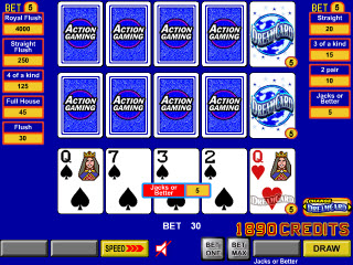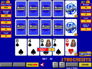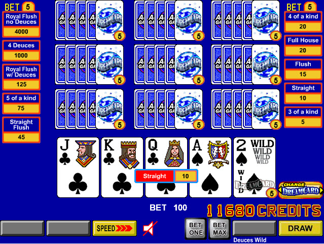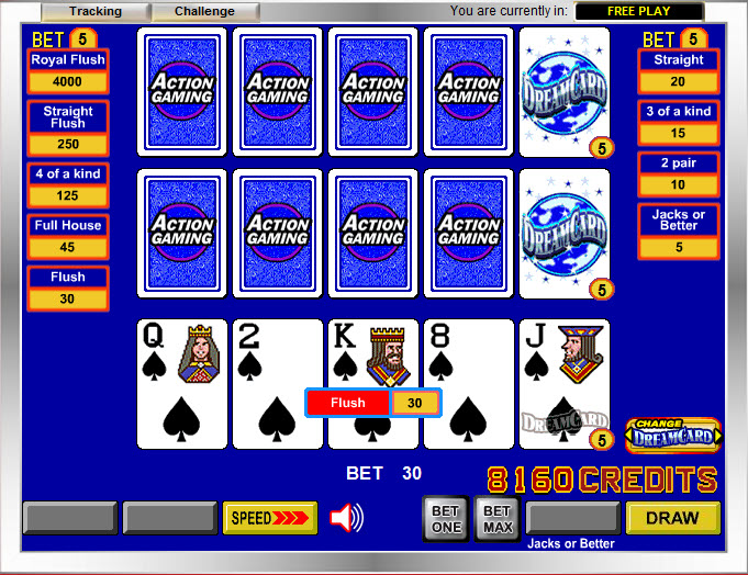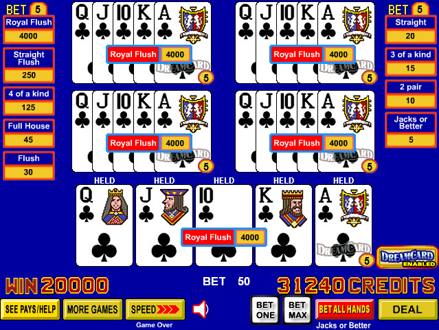 VideoPoker.com से नीचे दिए गए स्क्रीनशॉट में, खिलाड़ी को पहले चार कार्डों में चार से एक रॉयल मिला, और वह भाग्यशाली था कि ड्रीम कार्ड सक्रिय था, क्योंकि यह रॉयल फ्लश में भर गया था।